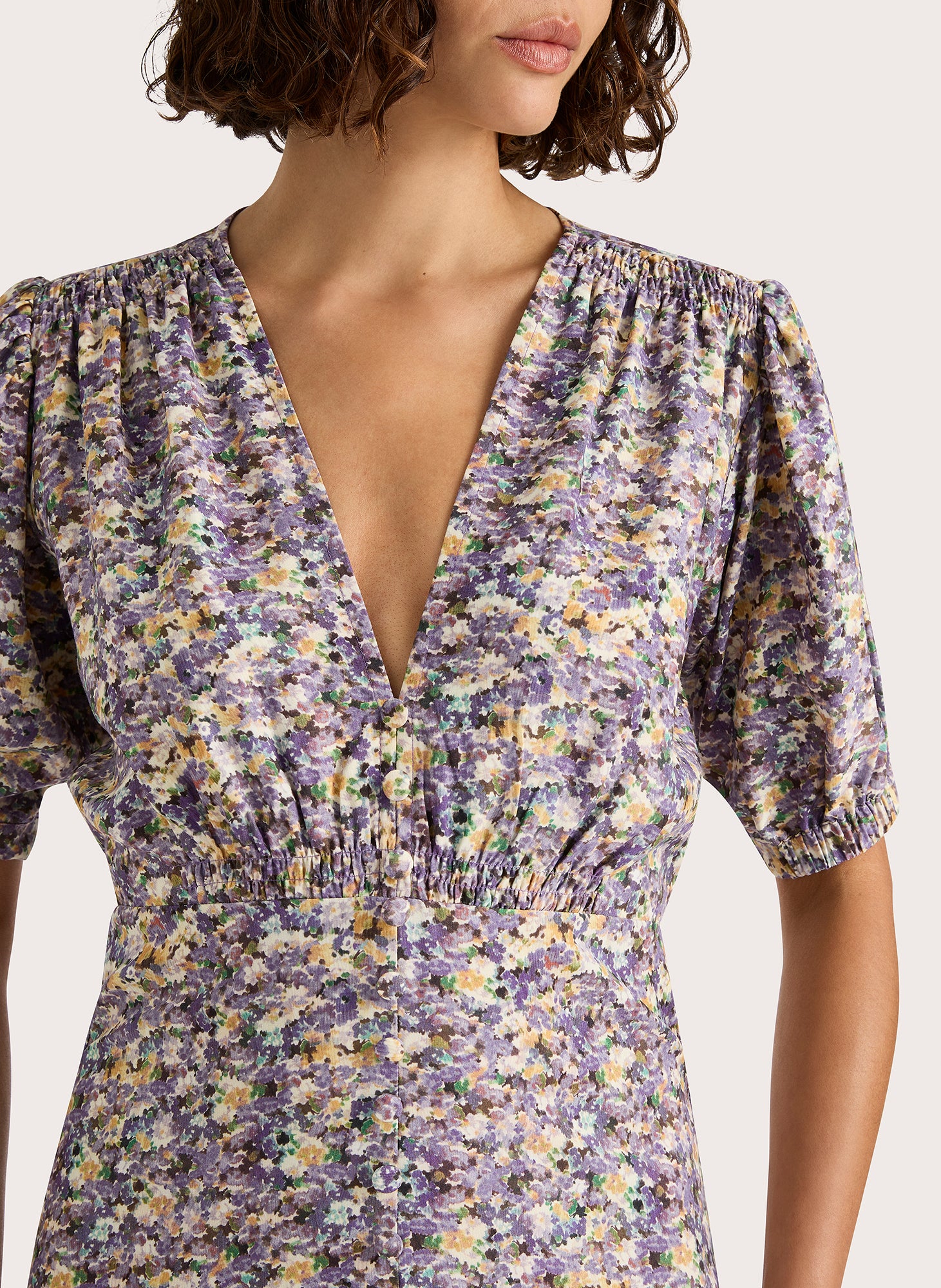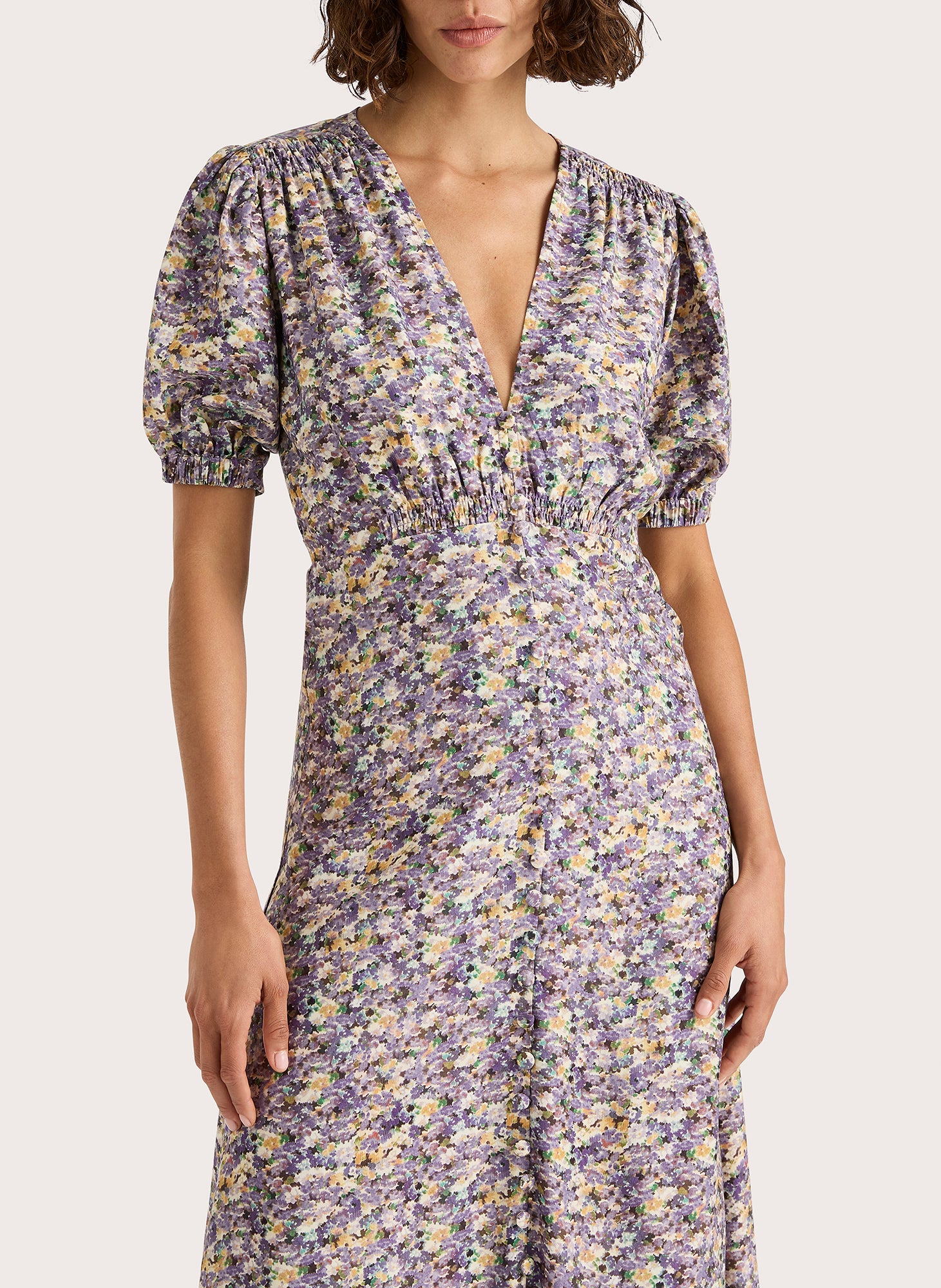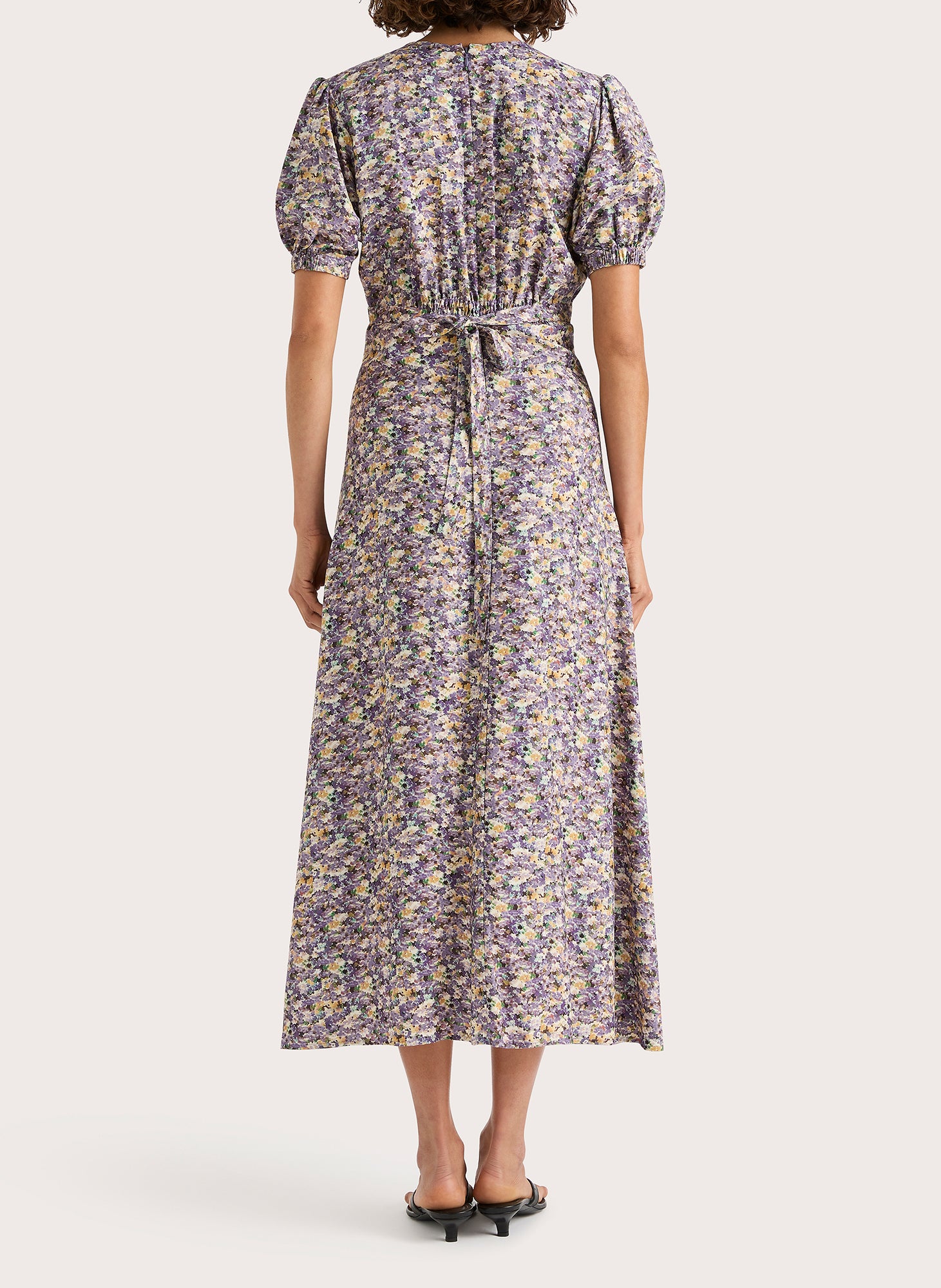 A beloved FAITHFULL silhouette, designed from a soft rayon fabrication. It features a low V-neckline with soft, rounded sleeves, elasticated at the cuff. There is subtle gathering at the bust for a feminine touch and button detailing down the front, allowing for a front skirt split if desired. From the waist it falls into a romantic A-line skirt that crops above the ankles. There is additional elastic woven through the waist, under the bust and along the shoulders for a more comfortable fit as well as a back waist tie detail. Offered in a light purple floral, style with a simple sandal and transition from everyday wear to vacation wear with ease.