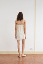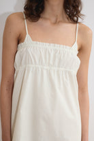 a lightweight dress with a relaxed silhouette. designed with fine shoulder straps and soft gathering through the neckline. finished with a subtle raw edge detail