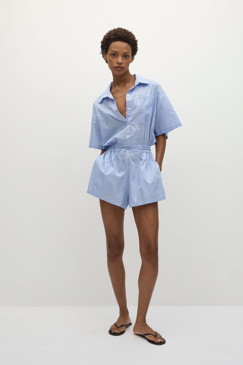 A relaxed playsuit with an oversized collar-style shirt with cuffed short sleeves and an elasticated waist, finished with a simple drawstring. From the waist they flare into a boyfriend-style short. Designed from a signature 100% organic cotton