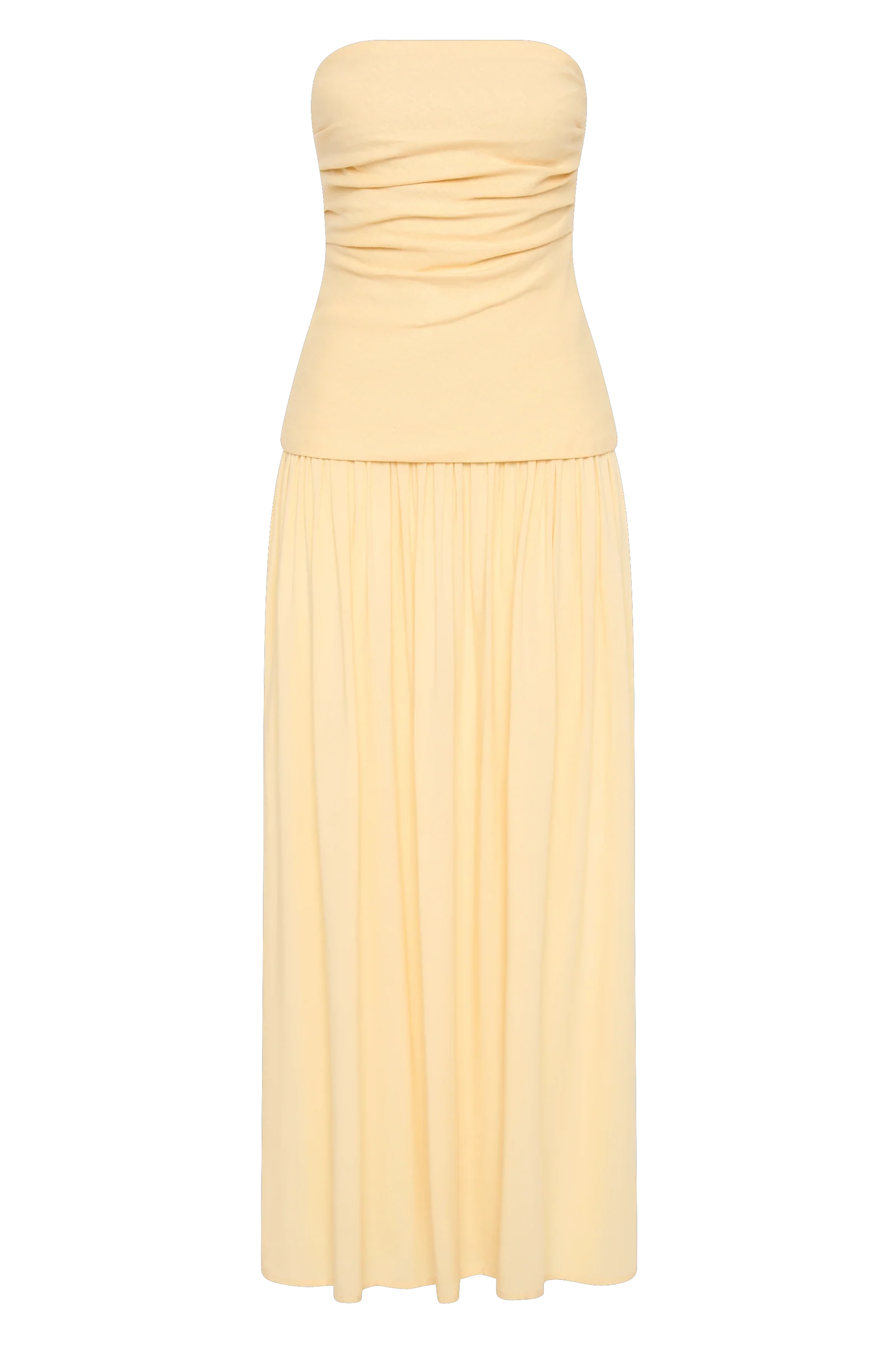 The silhouette of the season. A maxi dress with a fitted bodice designed from a signature 100% European Flax® linen fabrication, with gathered detailing across the front. It features a drop waist with a soft gathered skirt that flares into a slight A-line shape, cropping below the ankles. The skirt is designed from a rayon fabrication, offering a unique contrast to the bodice. In a buttery yellow, wear with a simple heel for effortless yet elevated occasion wear.