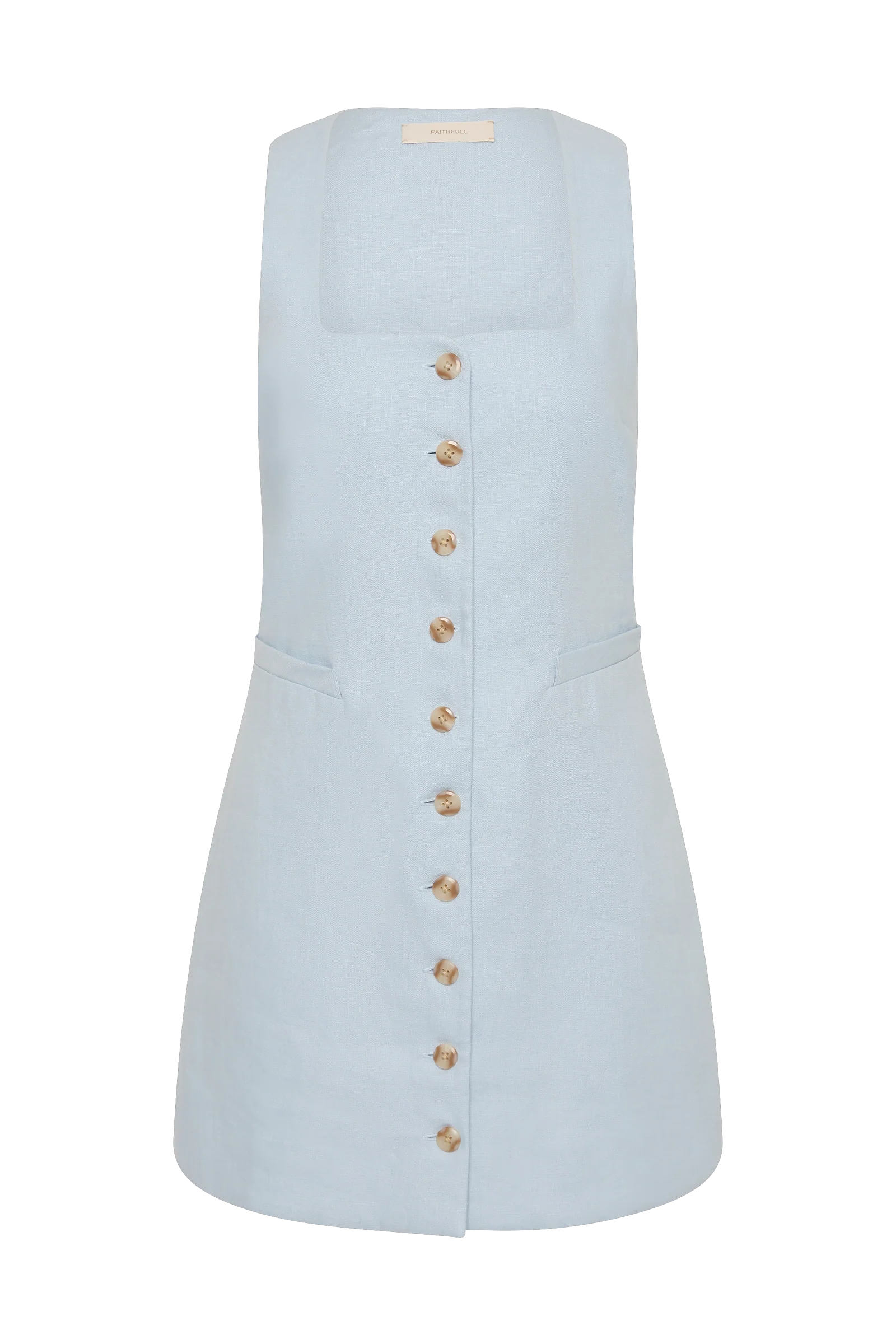 A signature FAITHFULL silhouette, reimagined with new elevated details and designed from a 100% European Flax® linen fabrication in a soft sky blue colour. It is a sleeveless mini dress with a low squared neckline and wide straps. Semi-fitted with a straight skirt, it features classic buttons down the front as well as a back waist belt, adjustable in length, and front pocket detailing. Style with simple accessories for summer-inspired everyday wear or vacation wear.