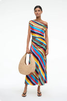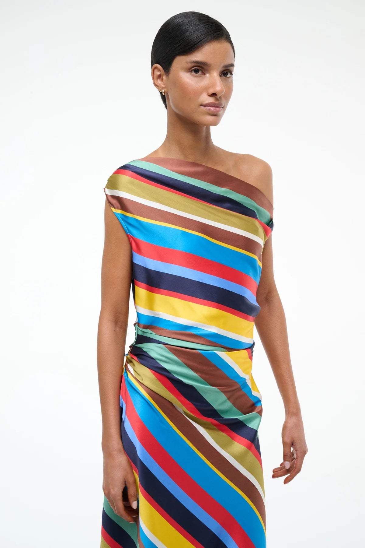 The Phare Dress features a draped off-the-shoulder neckline, a fitted waist and an ankle-grazing length. Updated in our stretch silk, this dress is perfect for a special occasion.