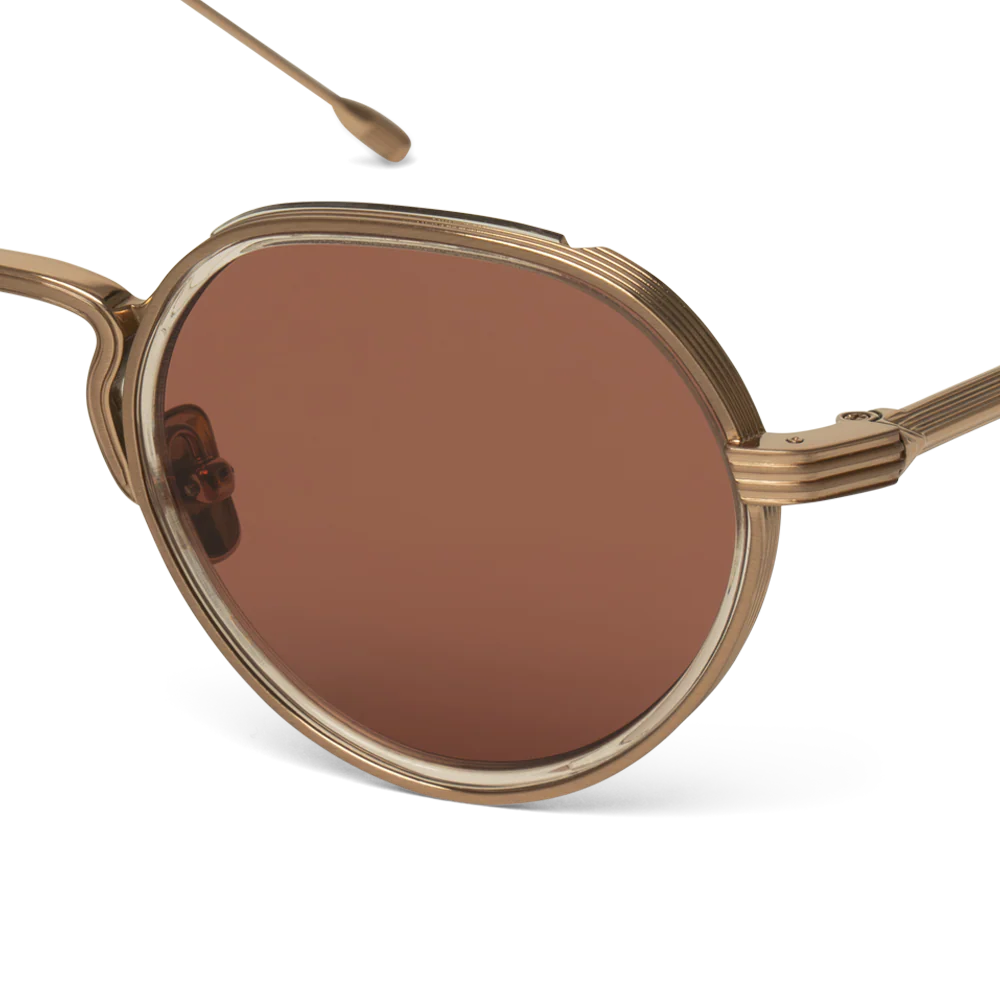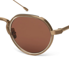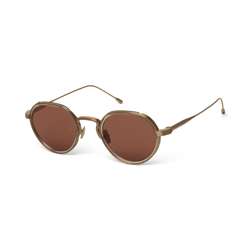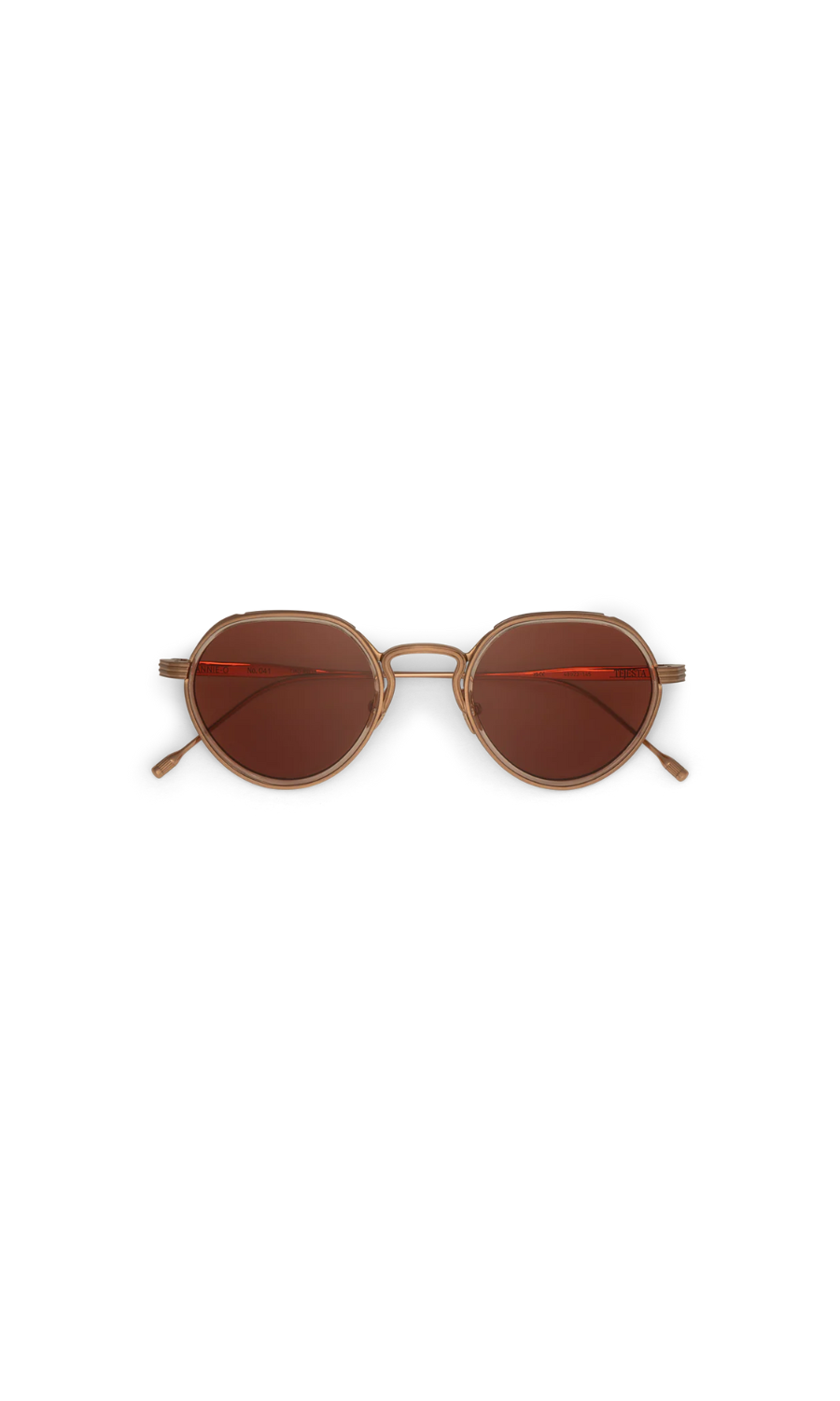 The Annie-O is a round frame with a Windsor rim, featuring handmade acetate wrapped around the titanium eyewire. Its sleek, Art-Deco-inspired step-cut temples bring unique character to the design.