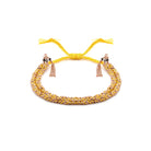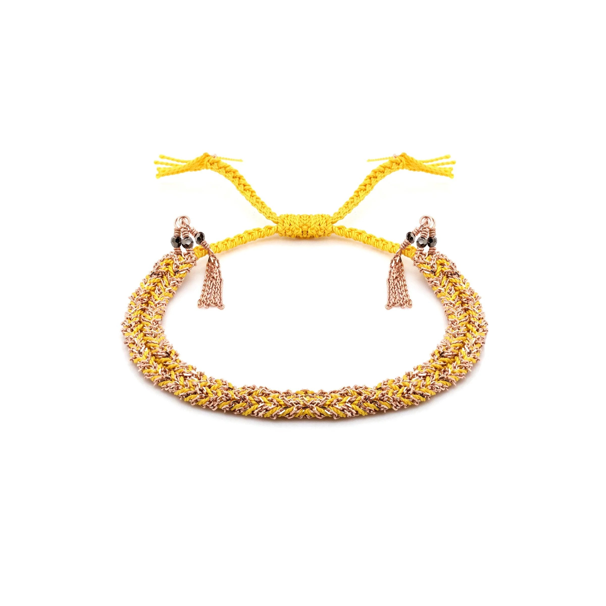 The iconic hand-braided bracelet with forçat Sterling silver chains and twisted amethyst color silk yarn finished by little chain fringe and tiny crystal beads. All parts are dipped in yellow gold.