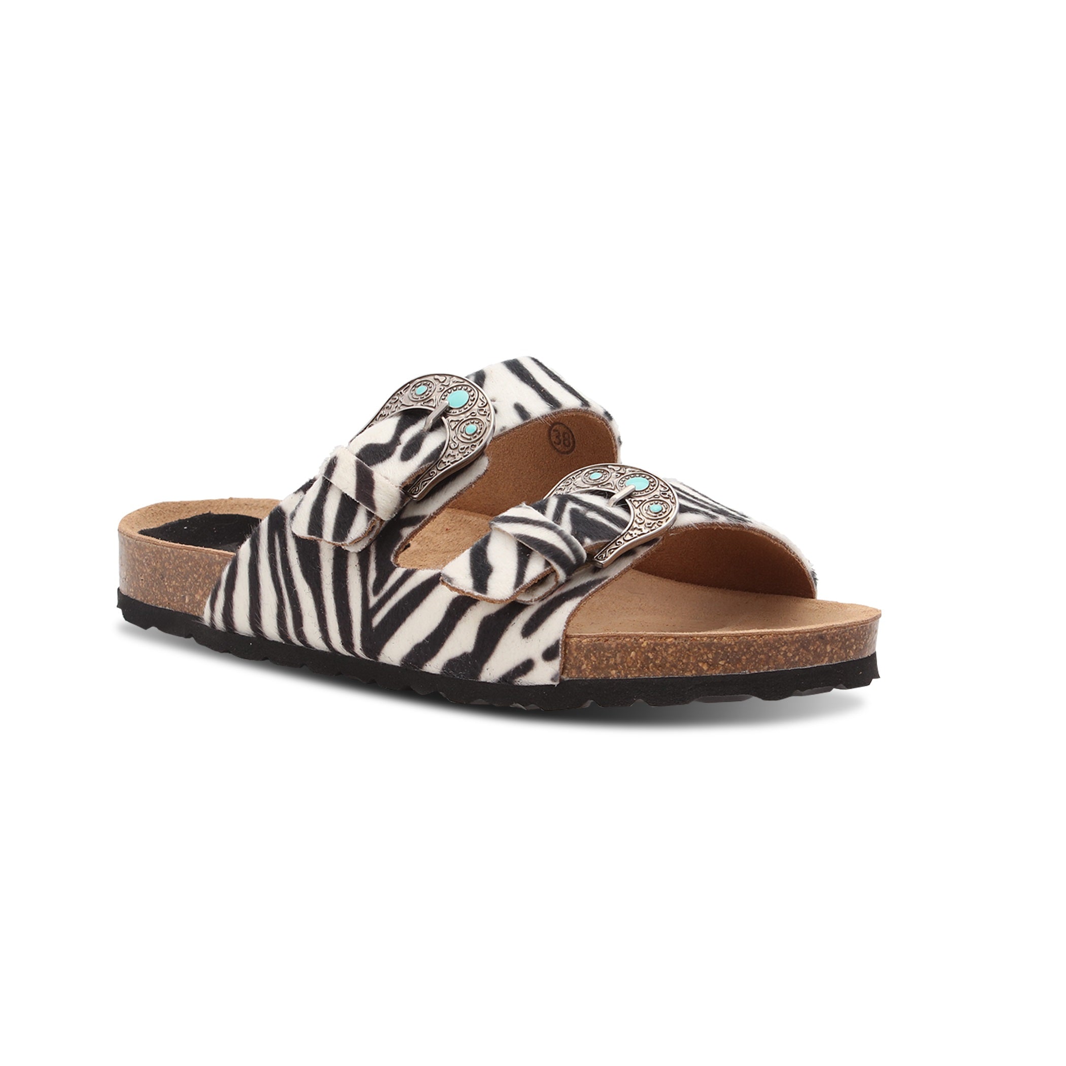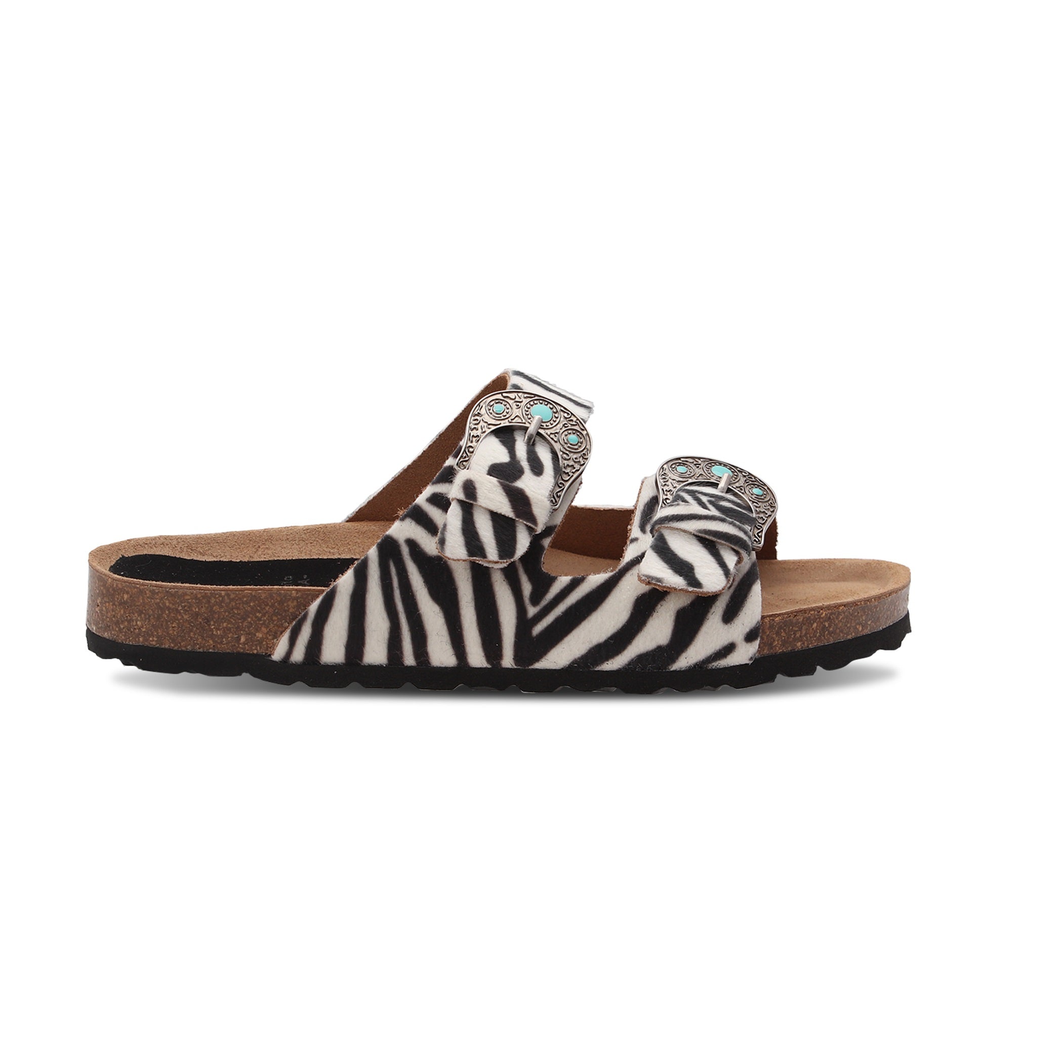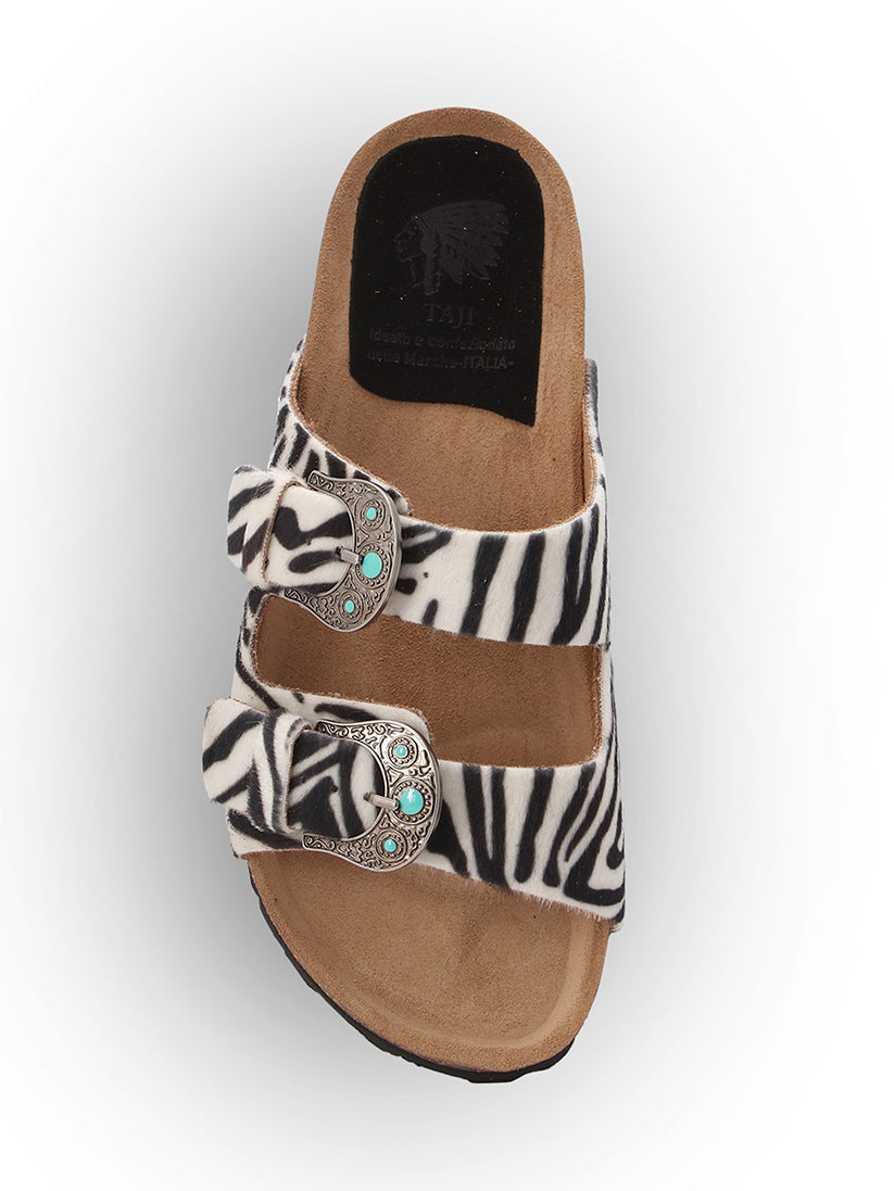 2-band sandal with turquoise-colored stone buckles, zebra pony upper and anatomical sole lined with calfskin.