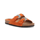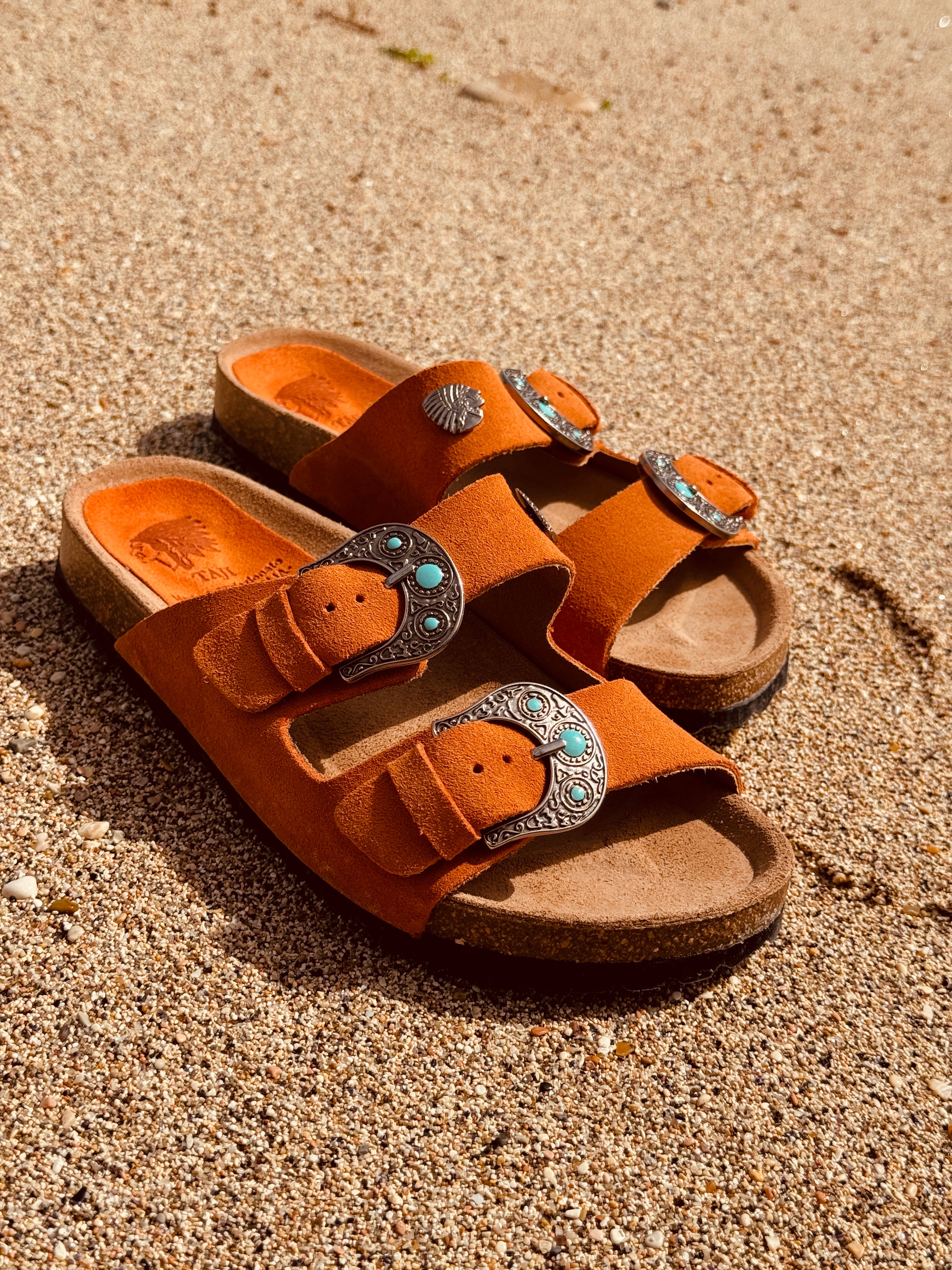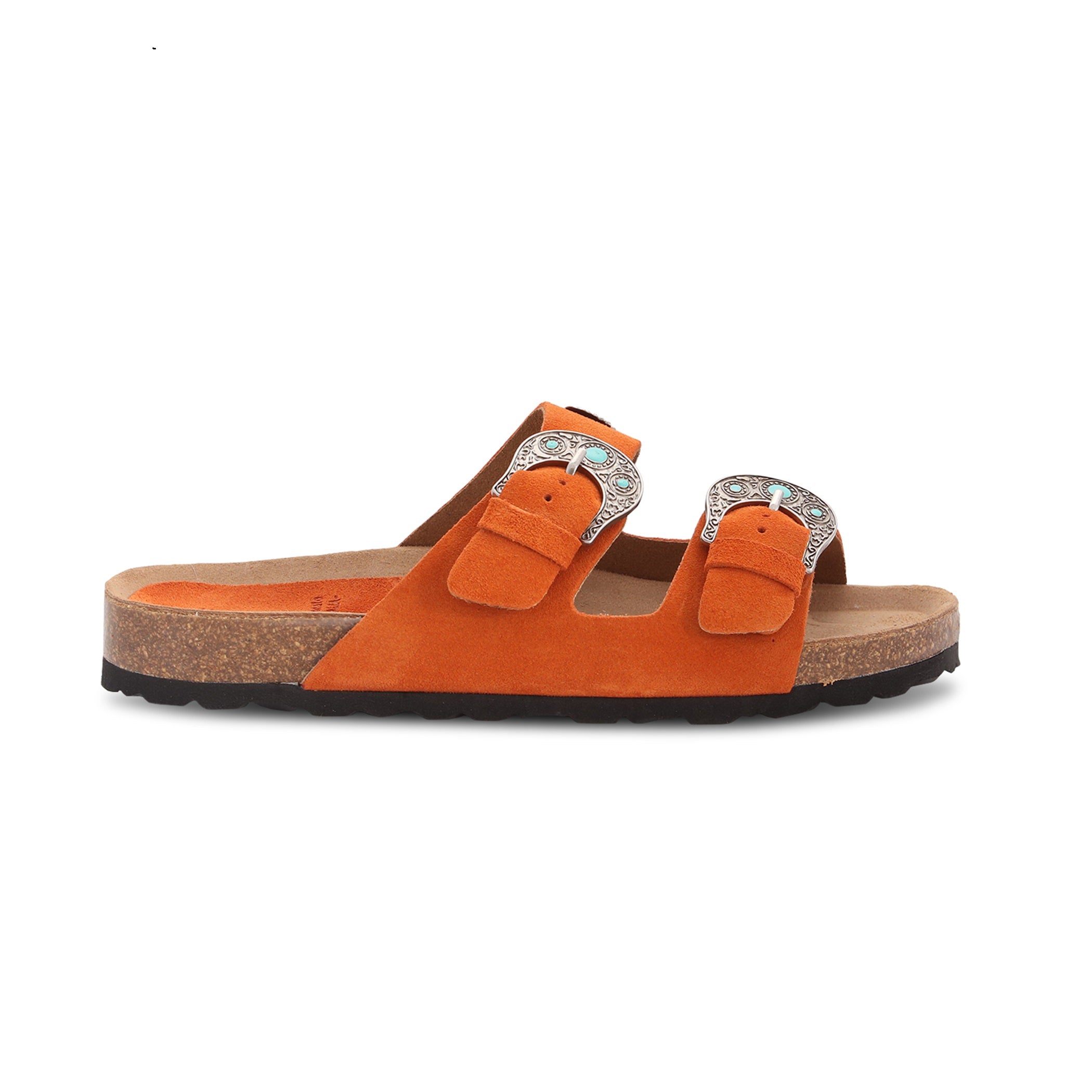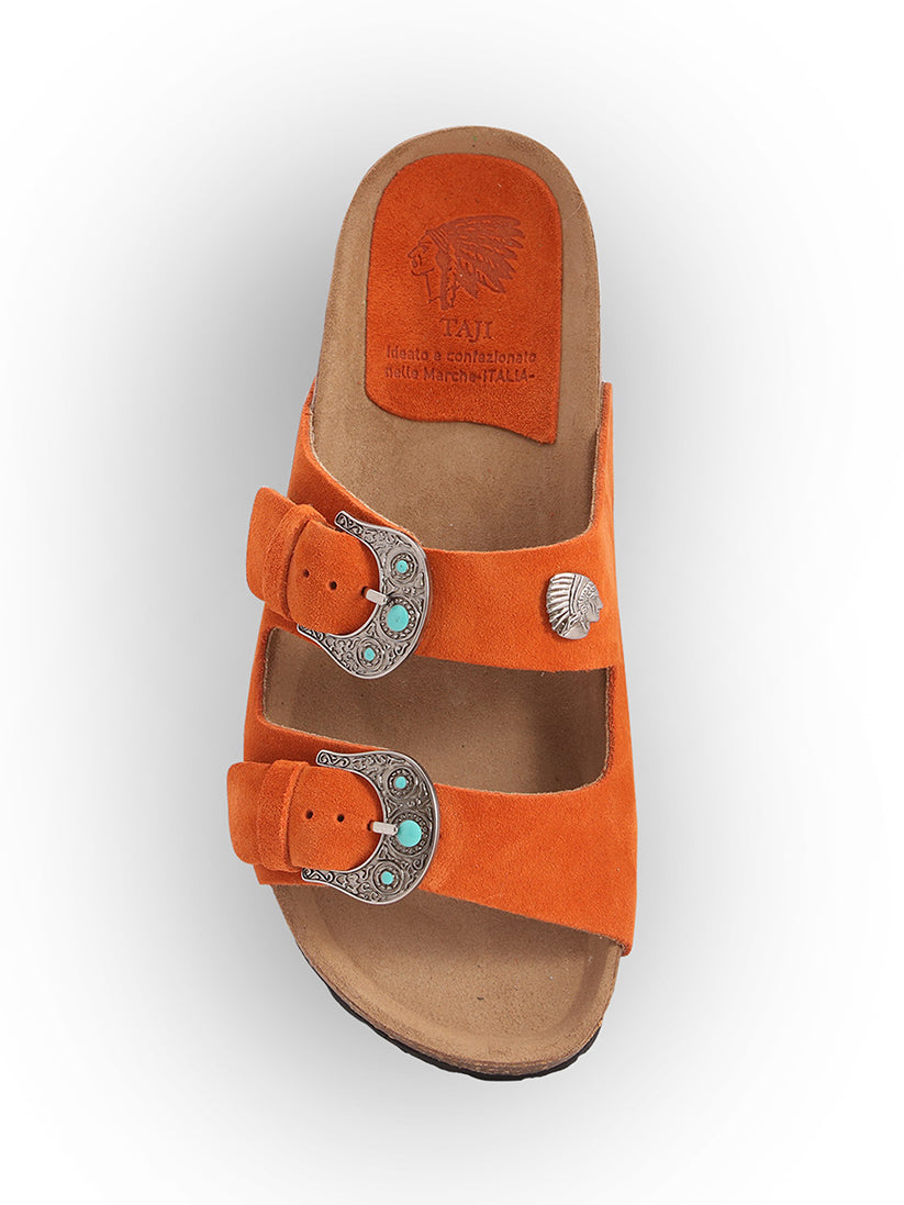 2-band sandal with turquoise-colored stone buckles, orange-colored suede upper and calfskin-lined anatomical sole.