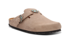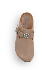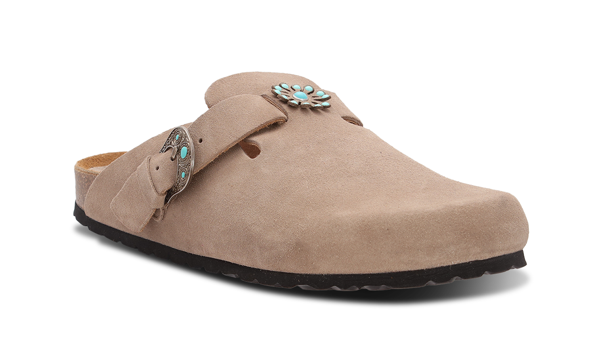Sabot with 1 buckle, anatomical sole lined with calfskin leather, upper and lining in suede calfskin in pietra color with turquoise stone embroidery.