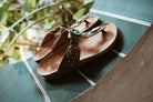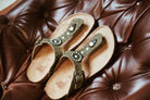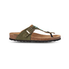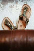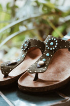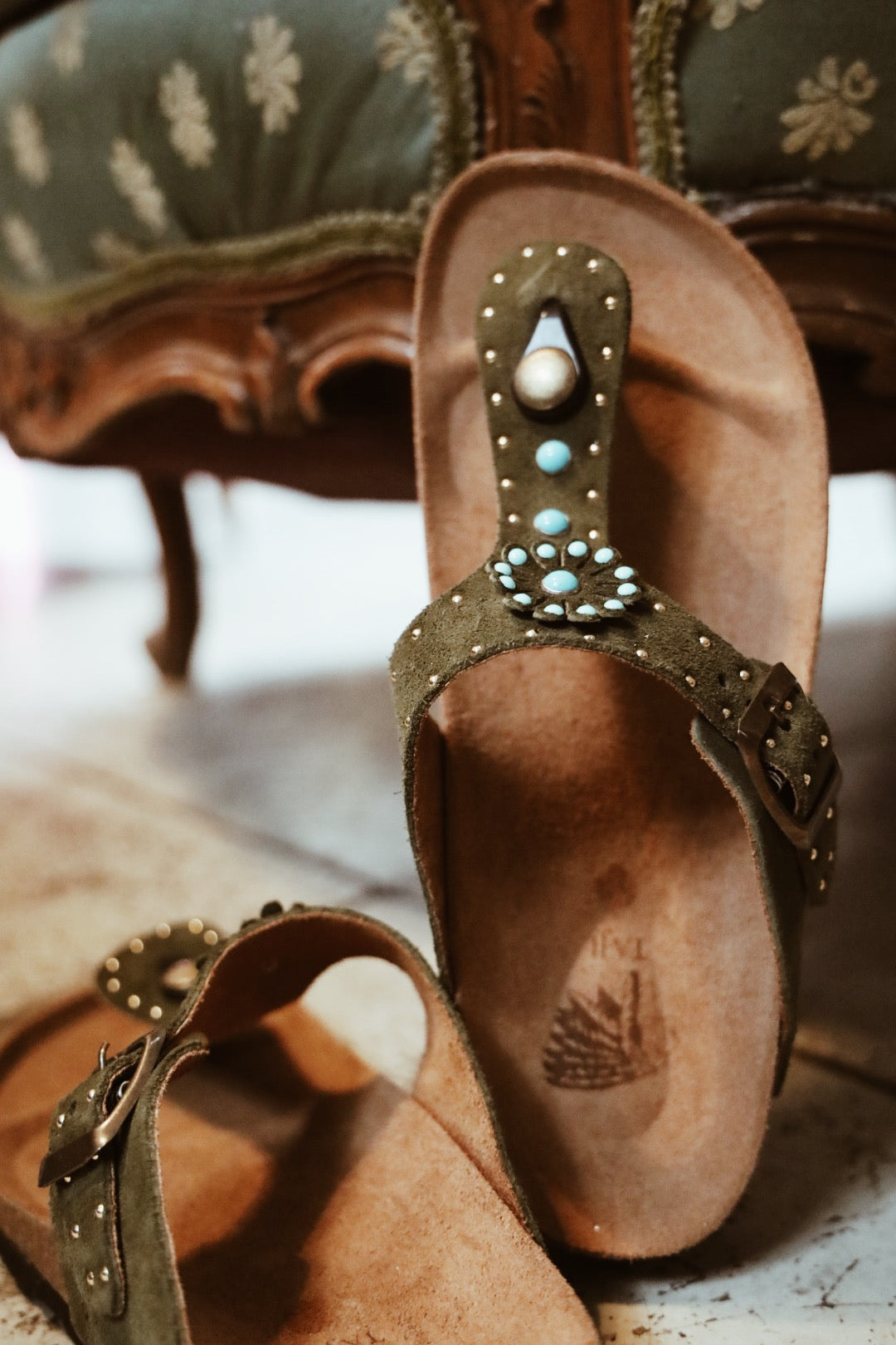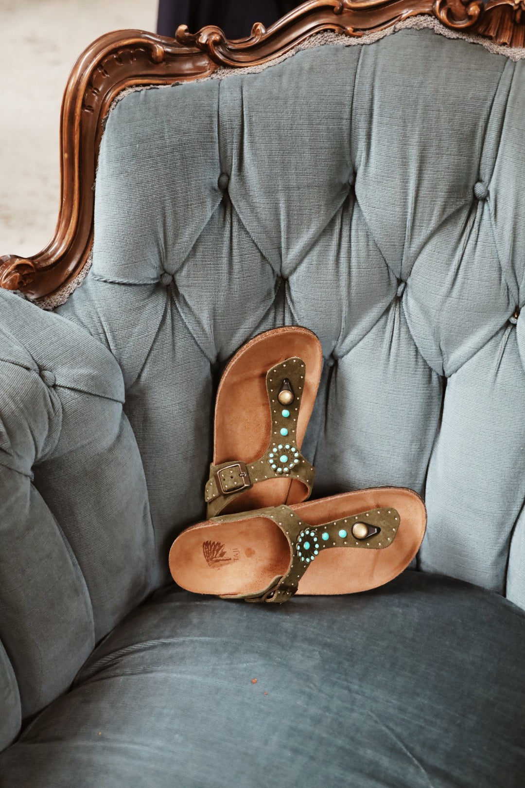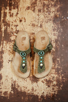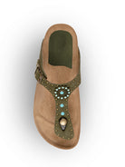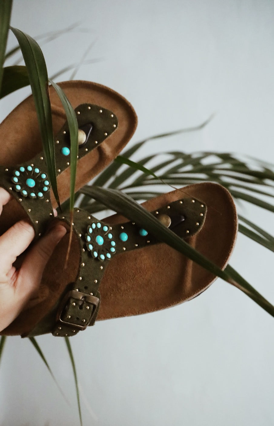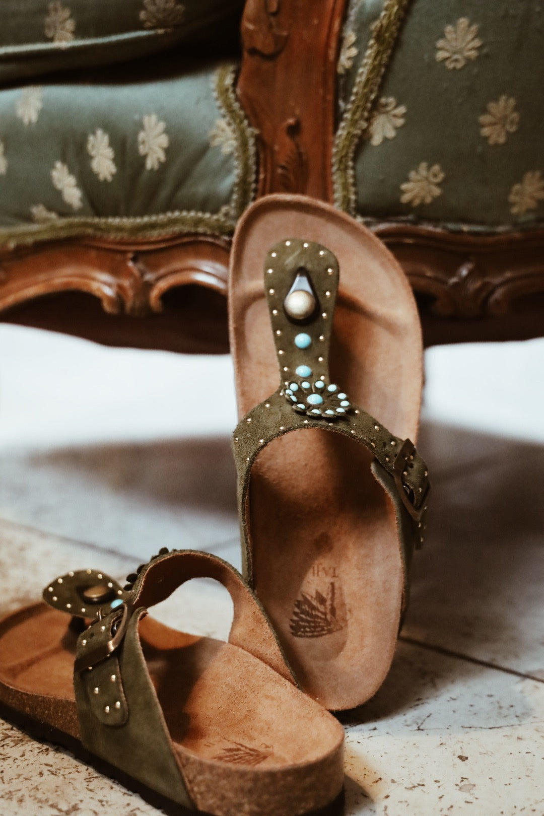 Flip-flop with anatomical sole lined with calfskin leather, moss-colored suede upper and lining, and turquoise stone embroidery.