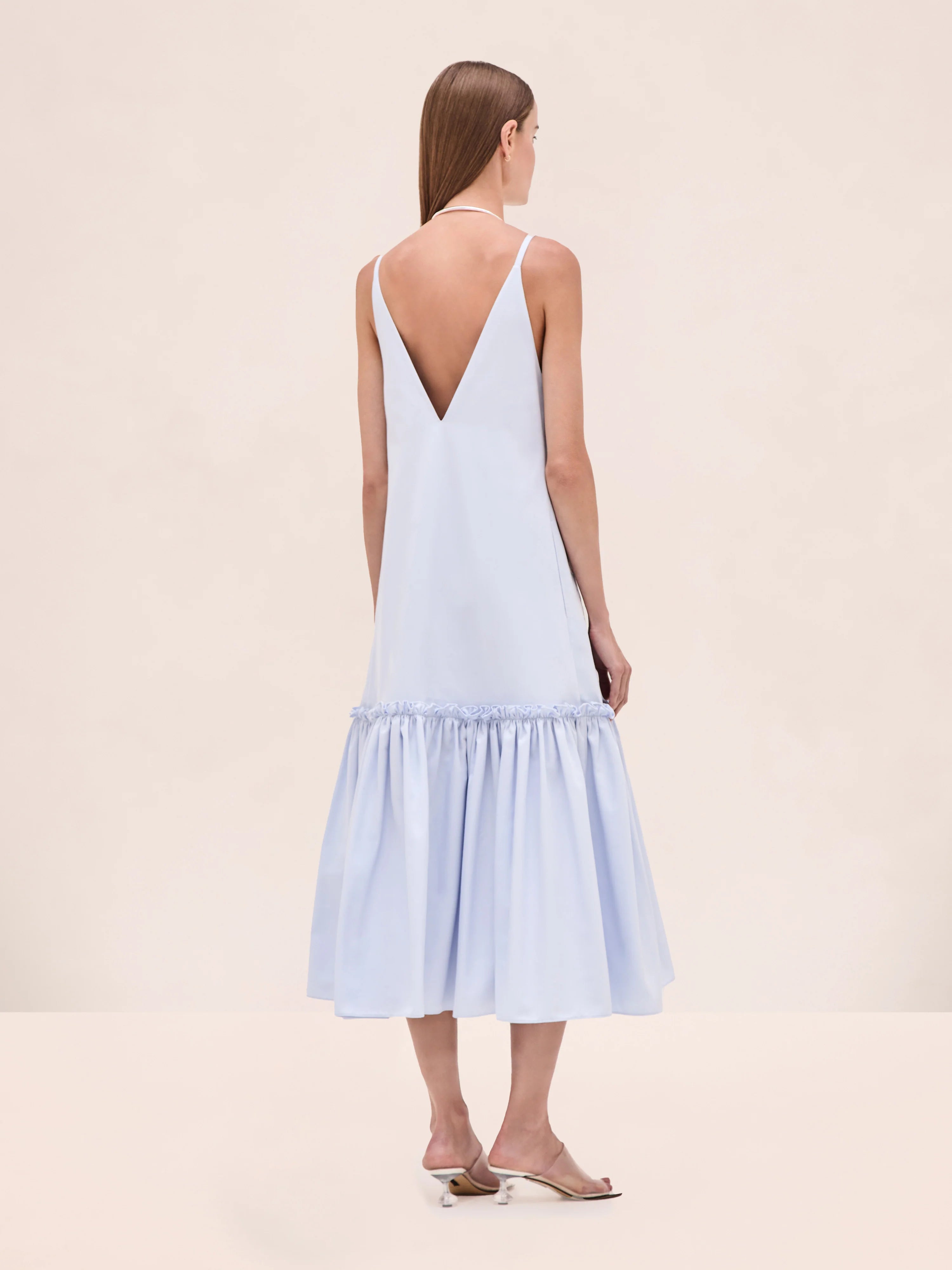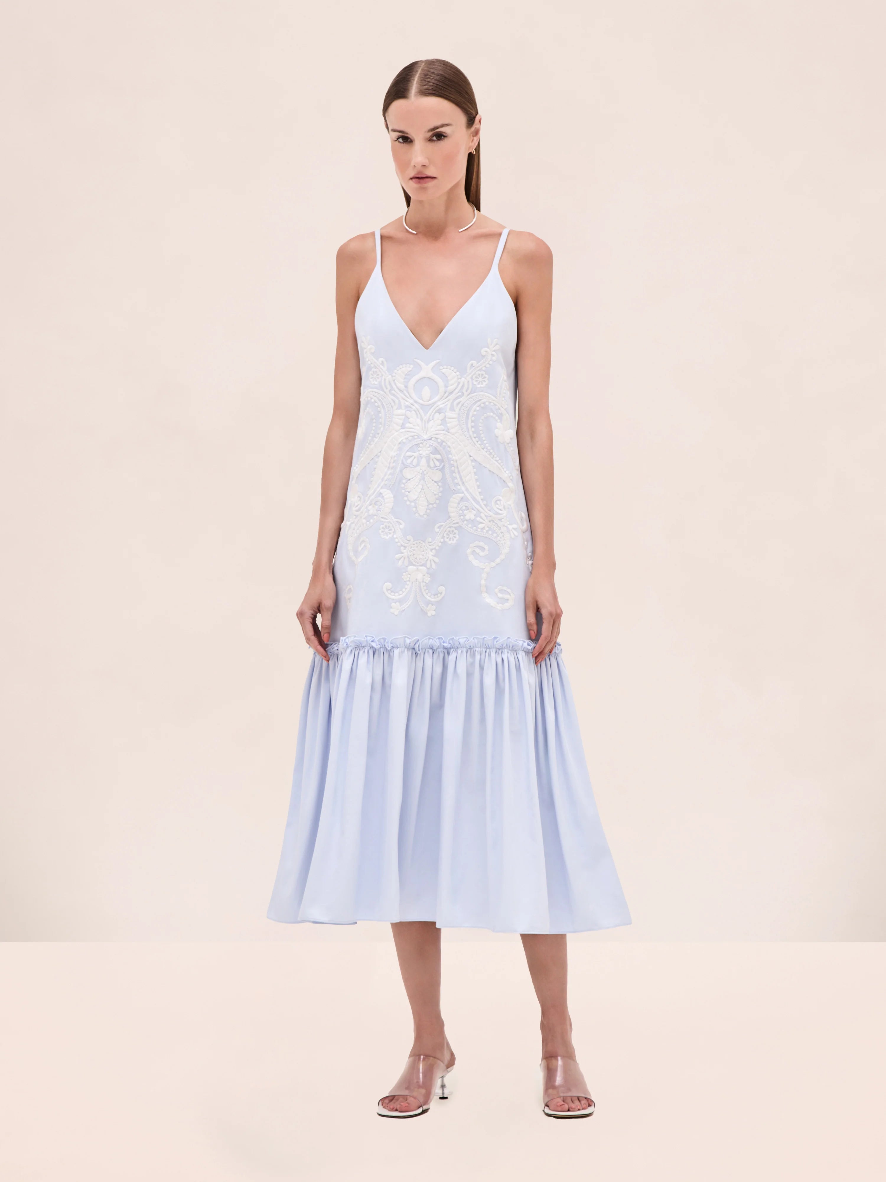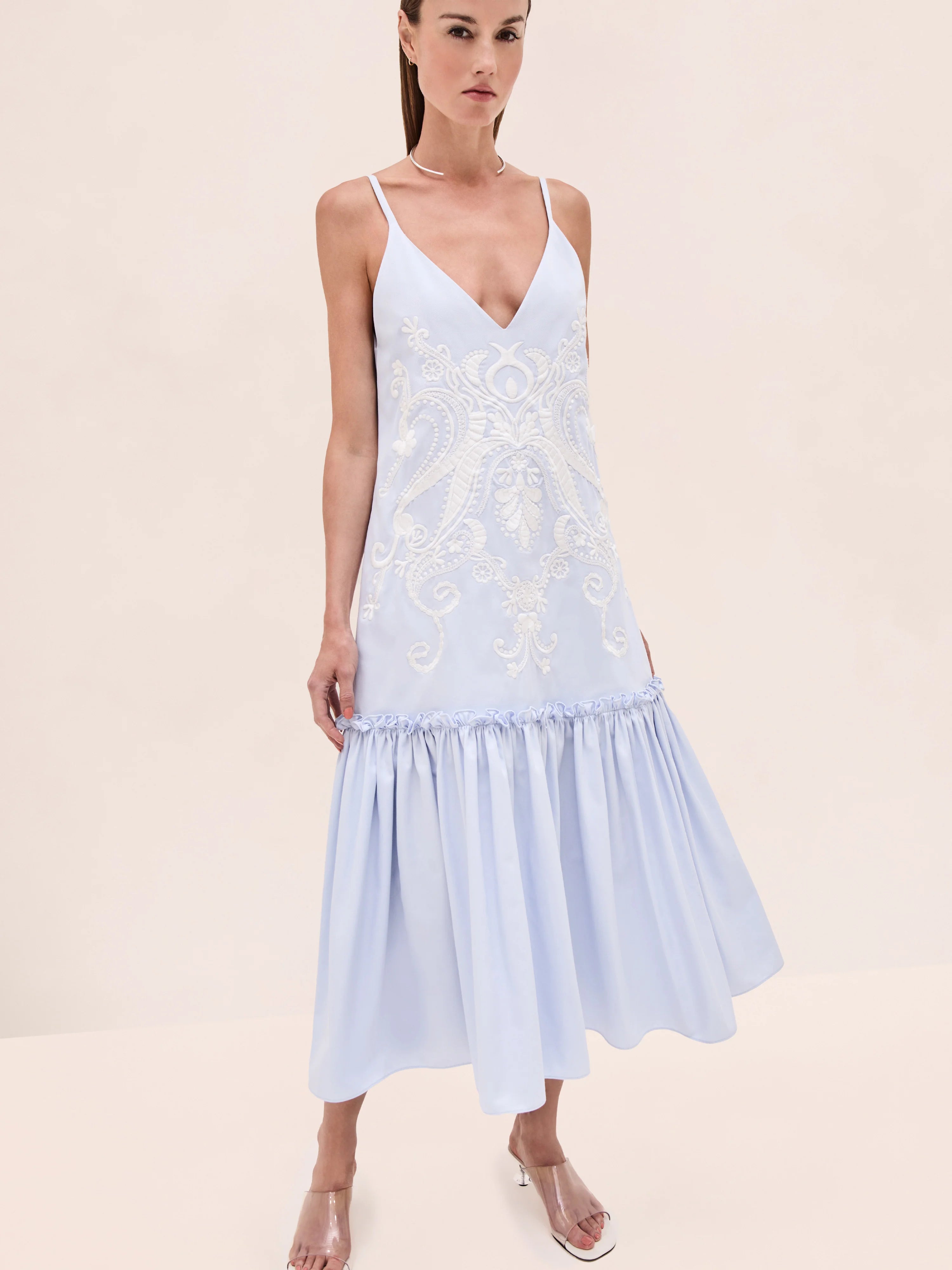 The Aniya Dress is a cotton midi design featuring intricate embroidery and a drop-waist silhouette.