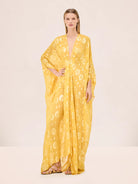The Avanti Dress is a full length caftan style dress featuring a metallic geometric print.