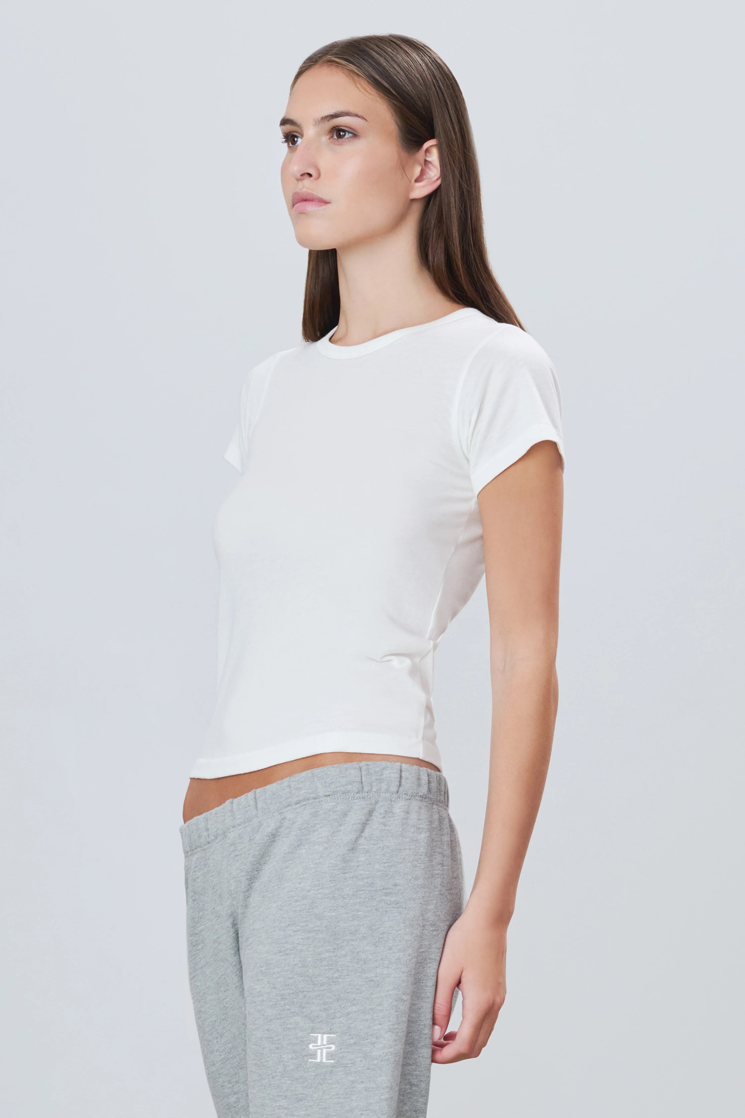 ÉTERNE's Fitted Crewneck Short Sleeve T-shirt is crafted from our soft cotton modal blend, offering a slim fit and full length—a versatile essential for everyday wear.