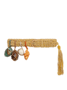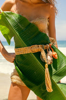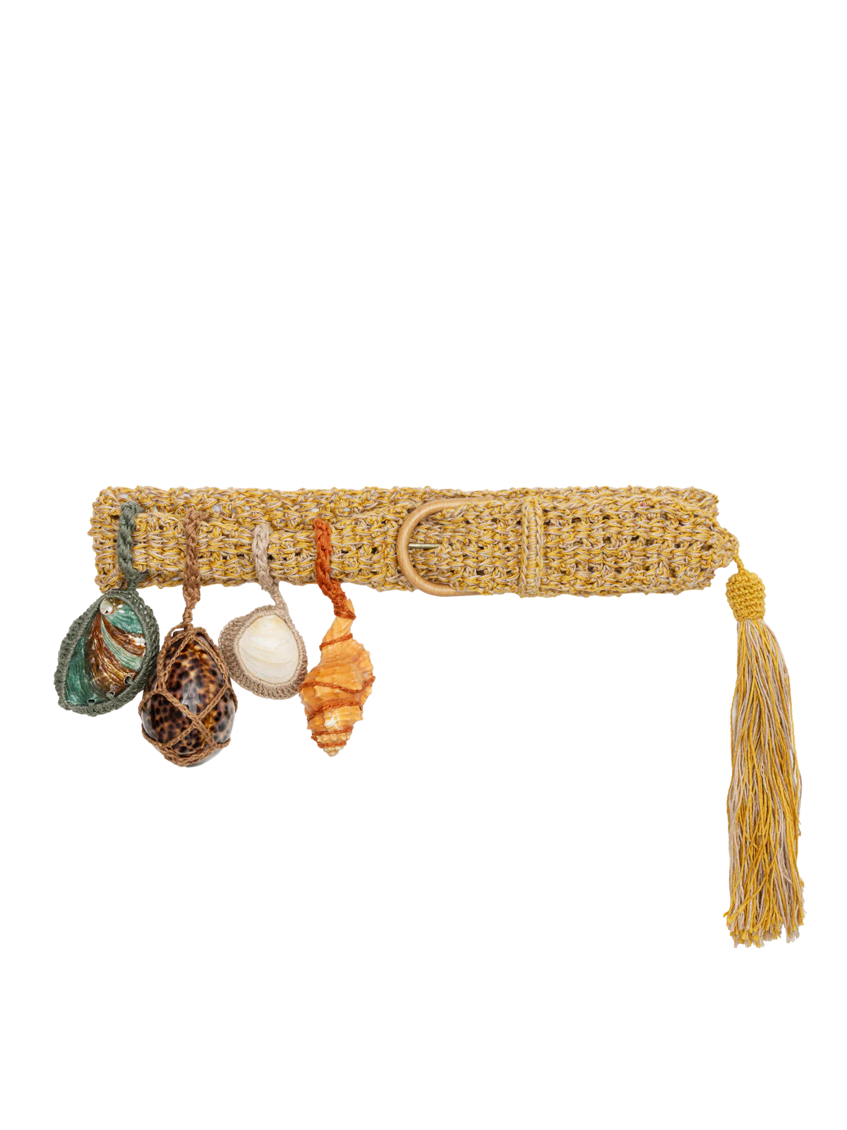 Adjustable linen belt with a wooden buckle and suspended seashell adornments.