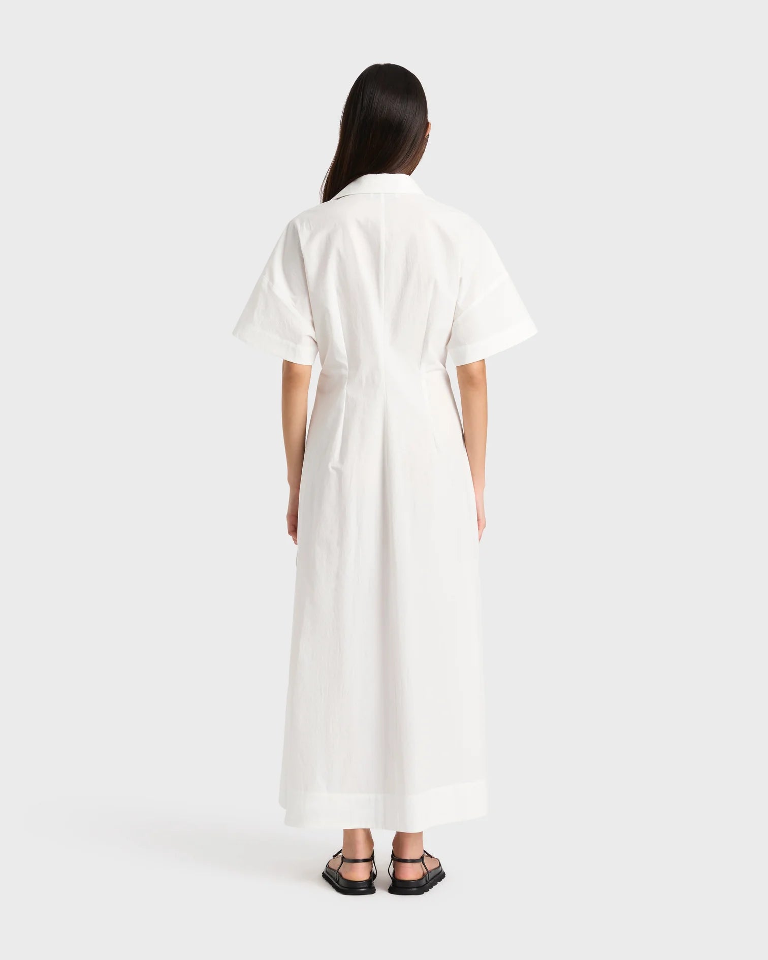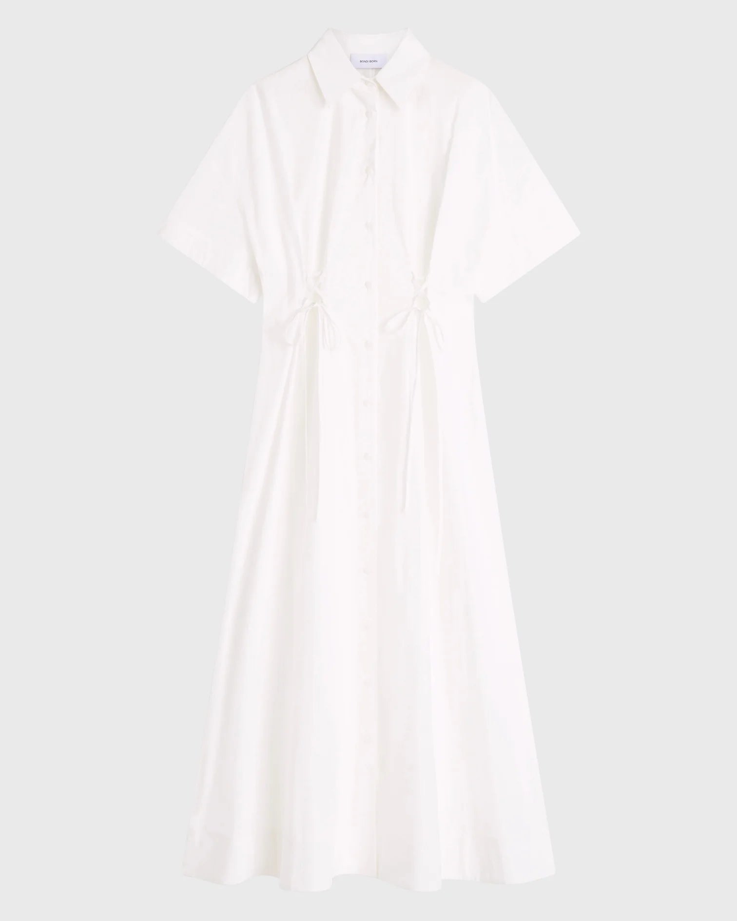 Crafted in luxurious, sustainable Japanese dry cotton, the Kyoto Lace-Up Shirtdress in white makes for a chic, contemporary silhouette, perfect for transitioning from day to evening. With a short collar, wide short sleeves and lace-up detailing for a modern touch, the 7/8 length falls gracefully to the ankles.