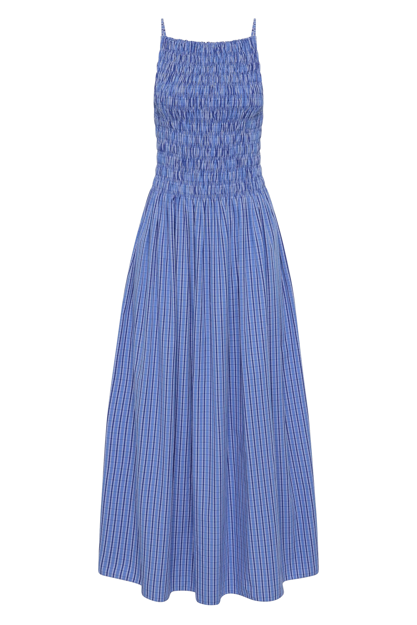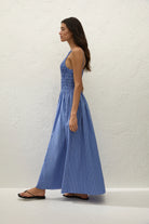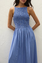 An everyday maxi dress, designed from a signature 100% cotton in a nostalgic blue gingham. Featuring a square neckline and thin adjustable straps, it is shirred through the bodice with a gathered waist. From there it falls into a soft A-line skirt that crops around the ankles. Designed with effortless throw-on throw-off appeal, it is the perfect breezy summer companion.