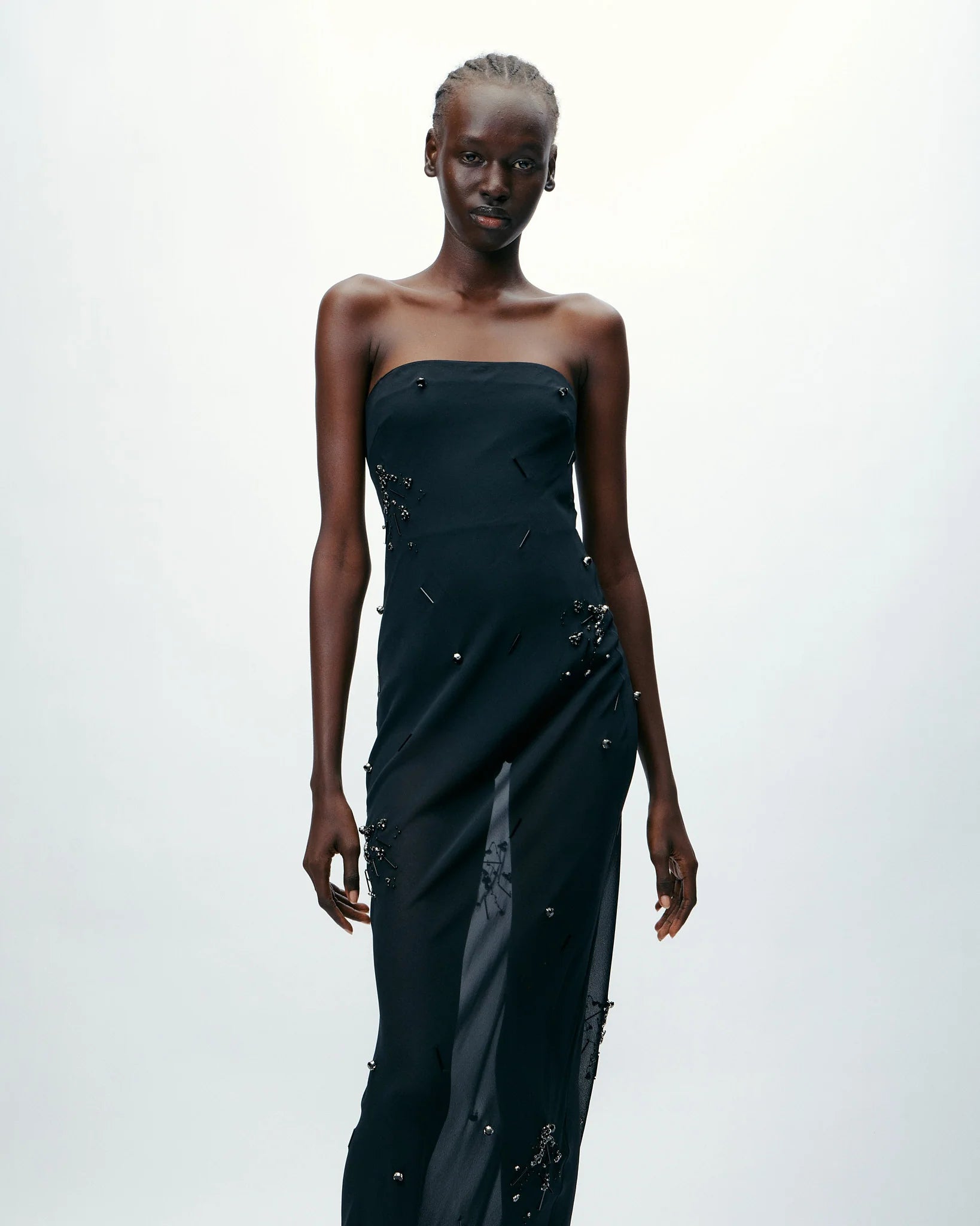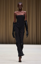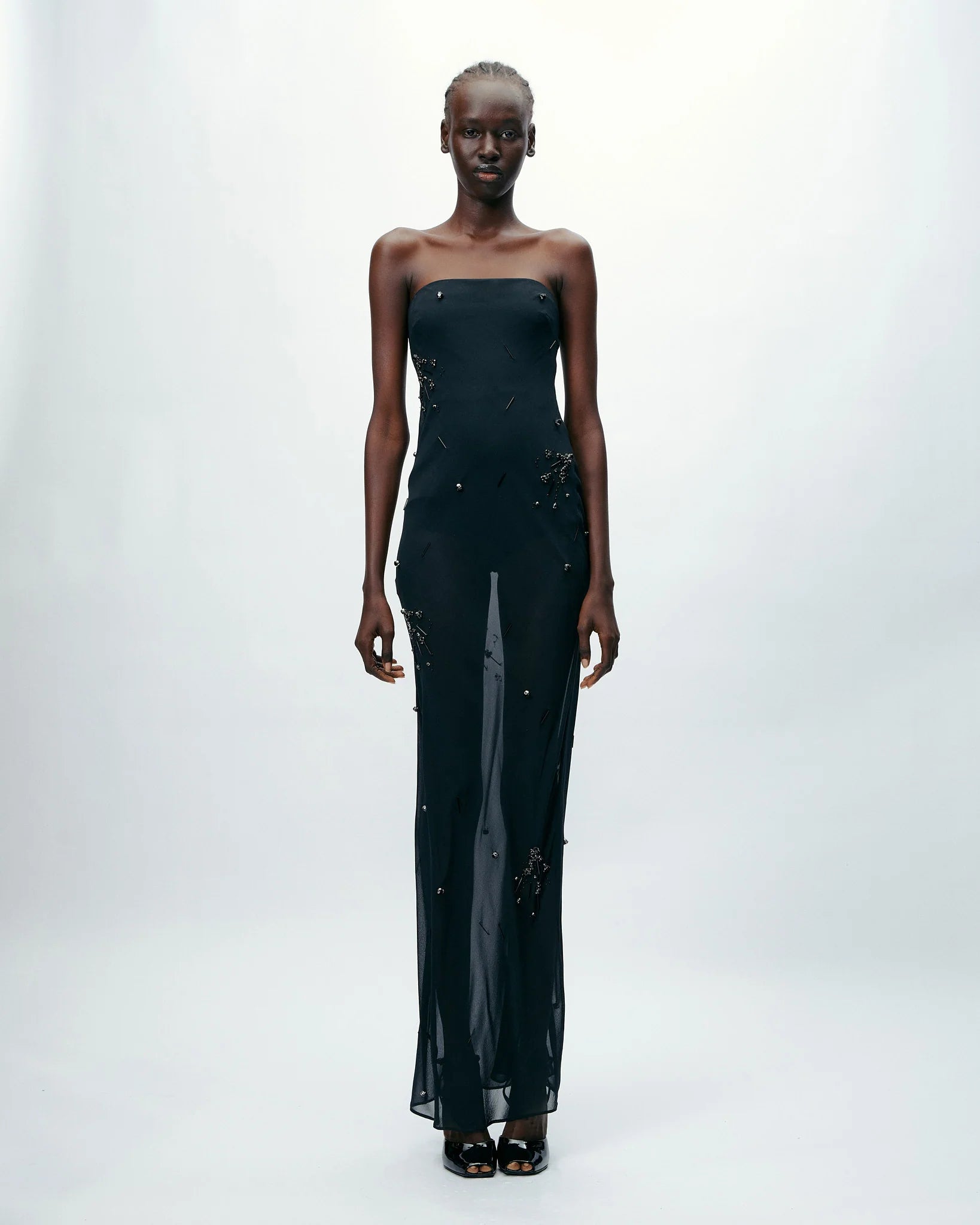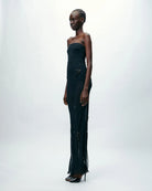 Black, full-length dress cut on the bias with a fitted corseted bodice for sculptural definition. Finished with a center slit for movement and elongation. A luminous piece for statement occasions.