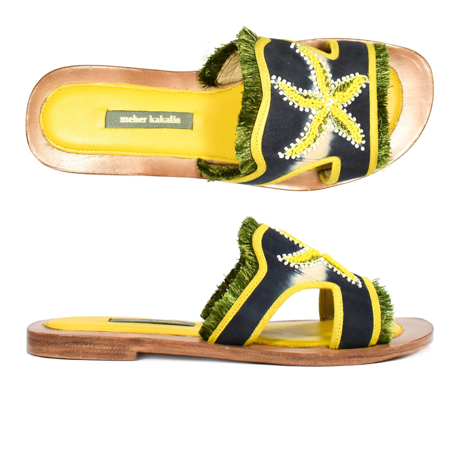 Mazu slide is hand embroidered on tie and dye leather using sustainable methods. Due to the nature of Tie Dye, each foot has unique markings, which are a feature of the product. Embroidered by a tribe living along the Silk Route, these nomadic artisans have passed down their embroidery techniques for generations. The embroidery is rich, full of texture, and durable, as it is embroidered directly into the leather.
