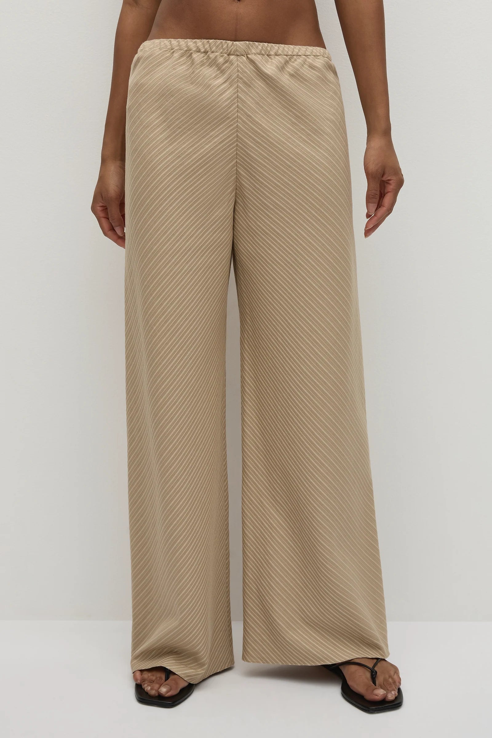 A relaxed pant with an elasticated waistband and straight leg silhouette that flares out around the ankles. Designed from an ultra-soft and unique blend of cotton and rayon in a neutral pinstripe, style under the Selan Top for versatile word to weekend wear.