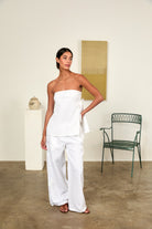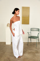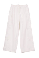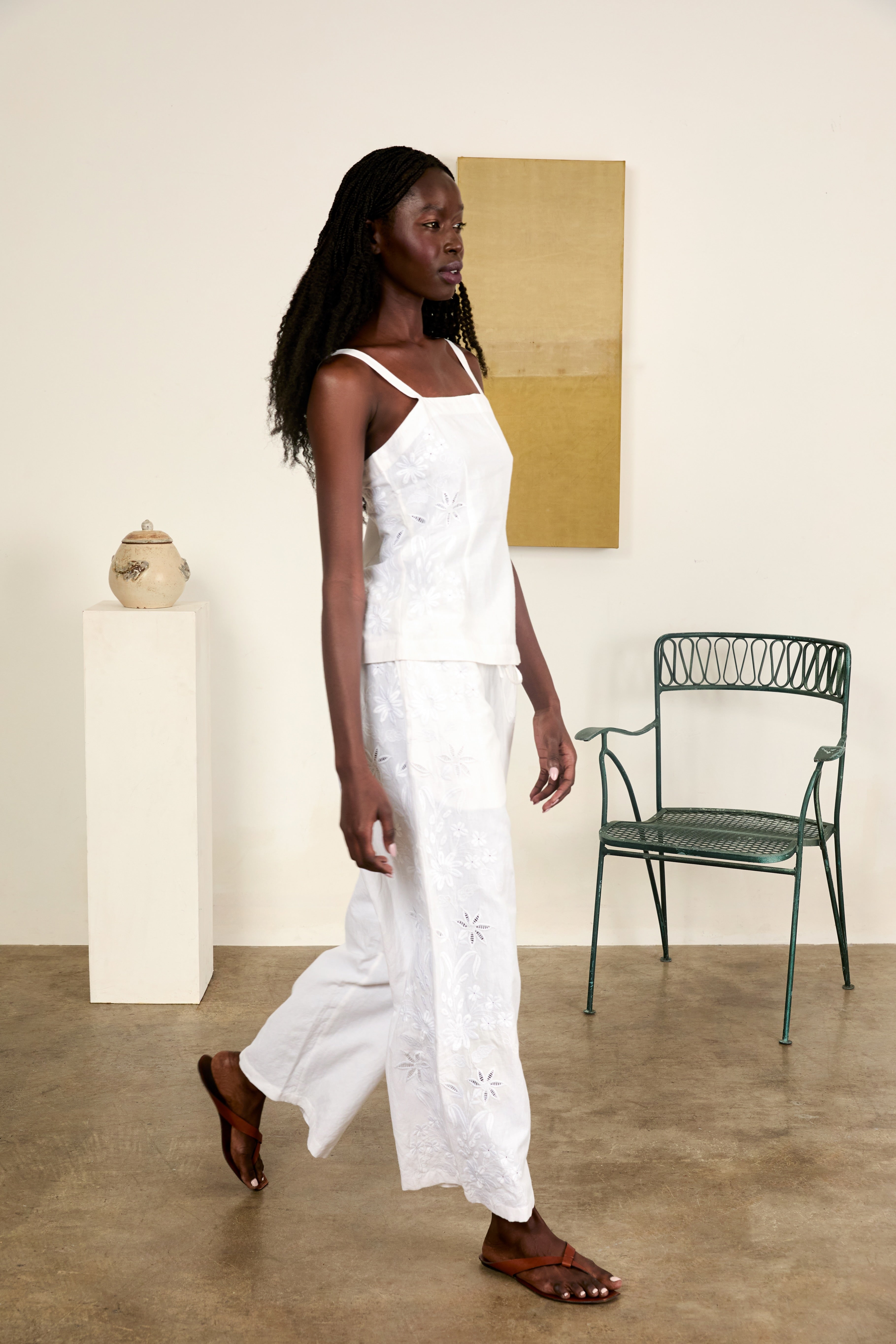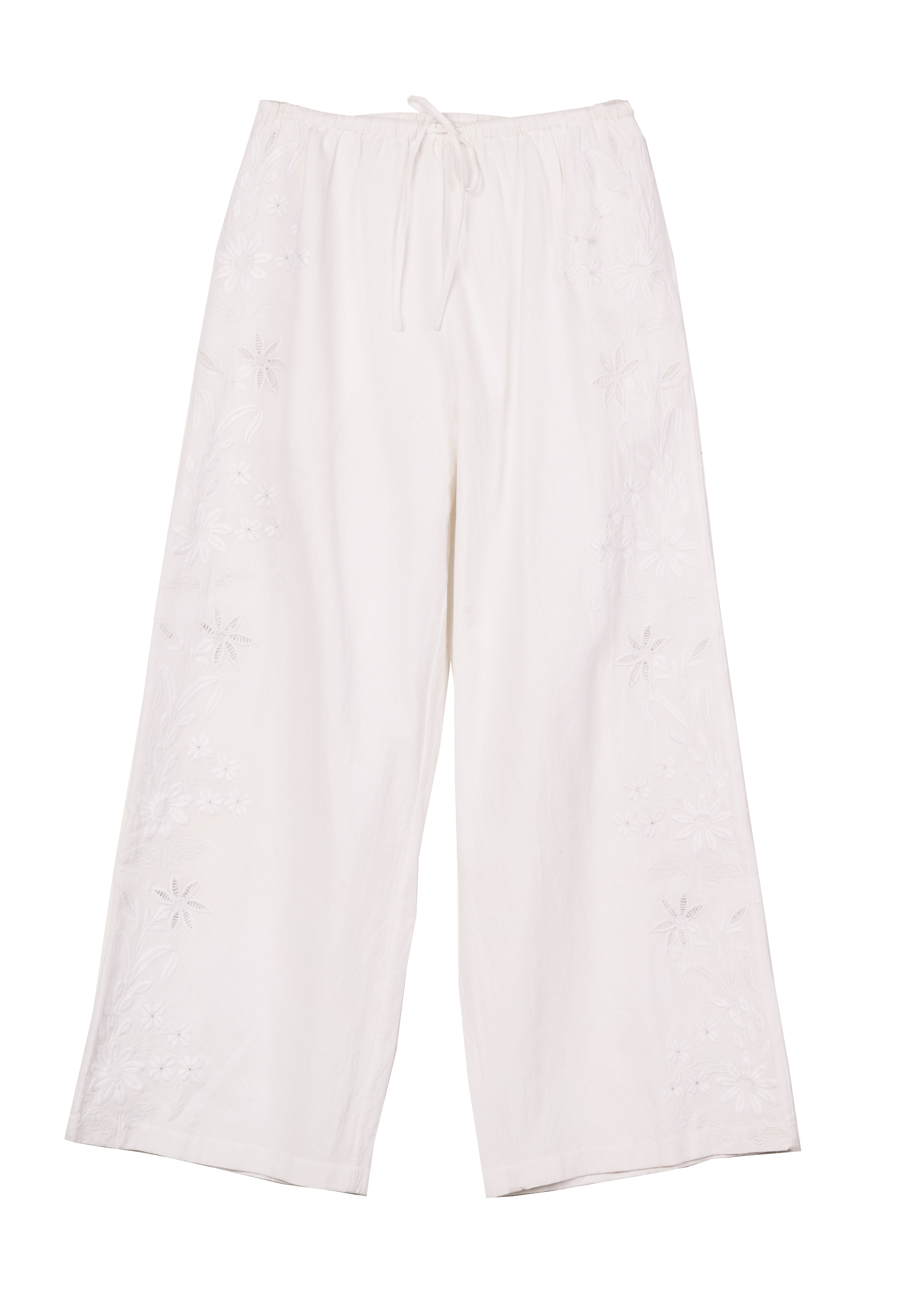 The Ermanno Pant in White is a lightweight linen, wide leg pant featuring embroidered flowers down the sides and an elastic drawstring waistband for a relaxed fit.