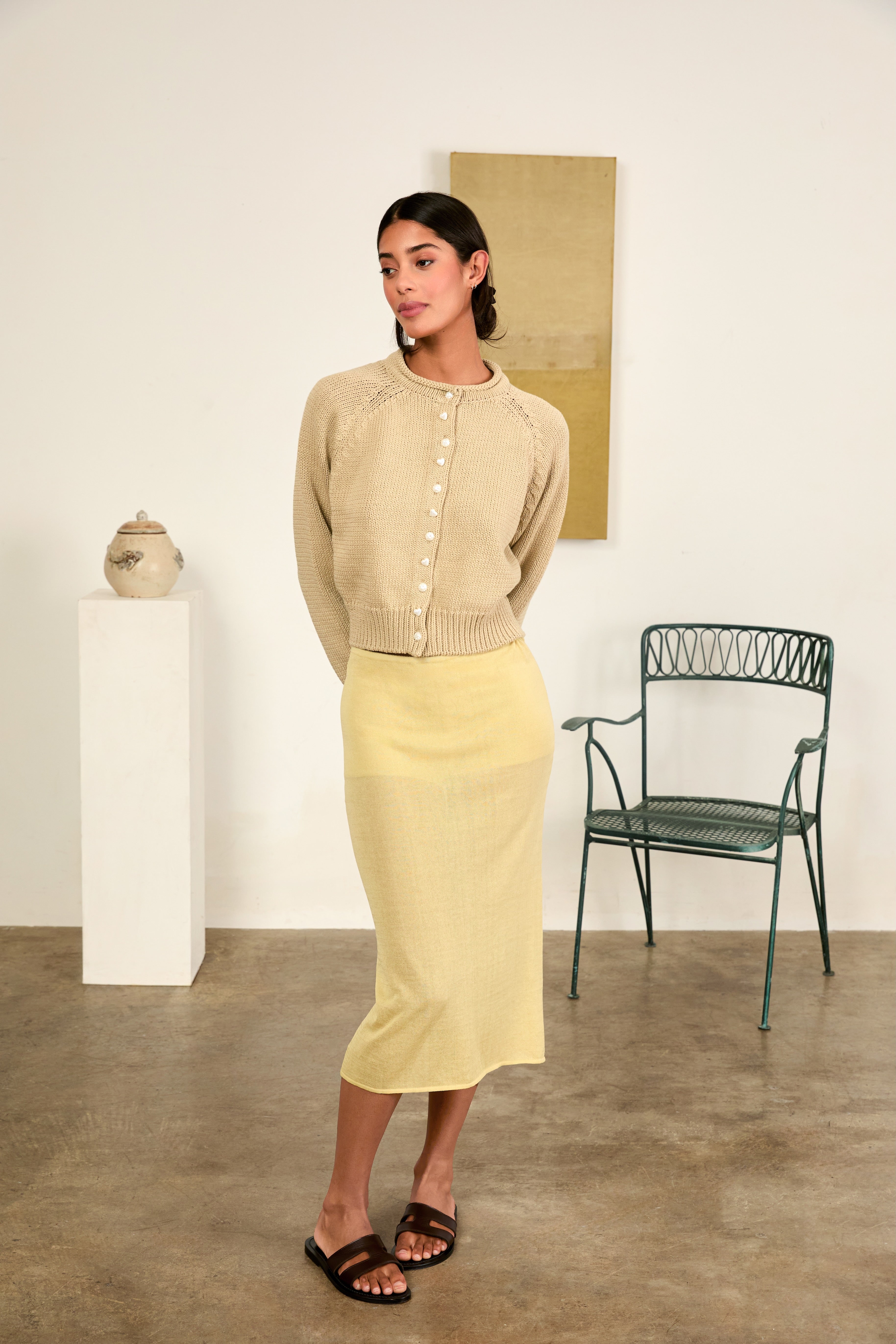 The Faye Skirt in Pistachio is a sheer midi length skirt.