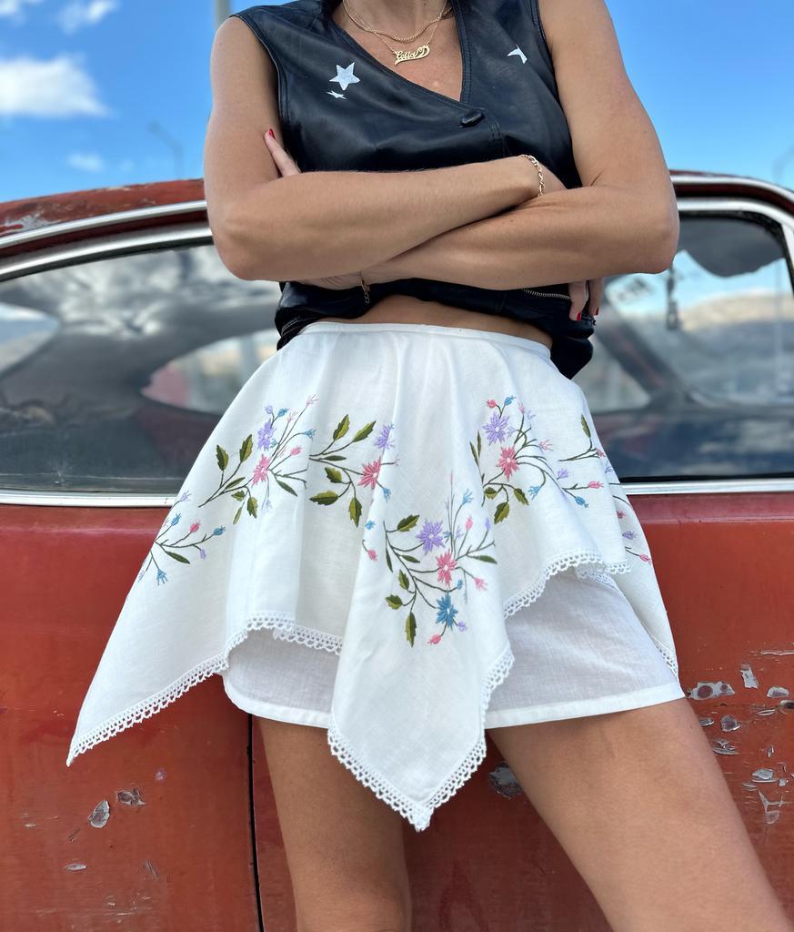Embroidered mini skirt.
