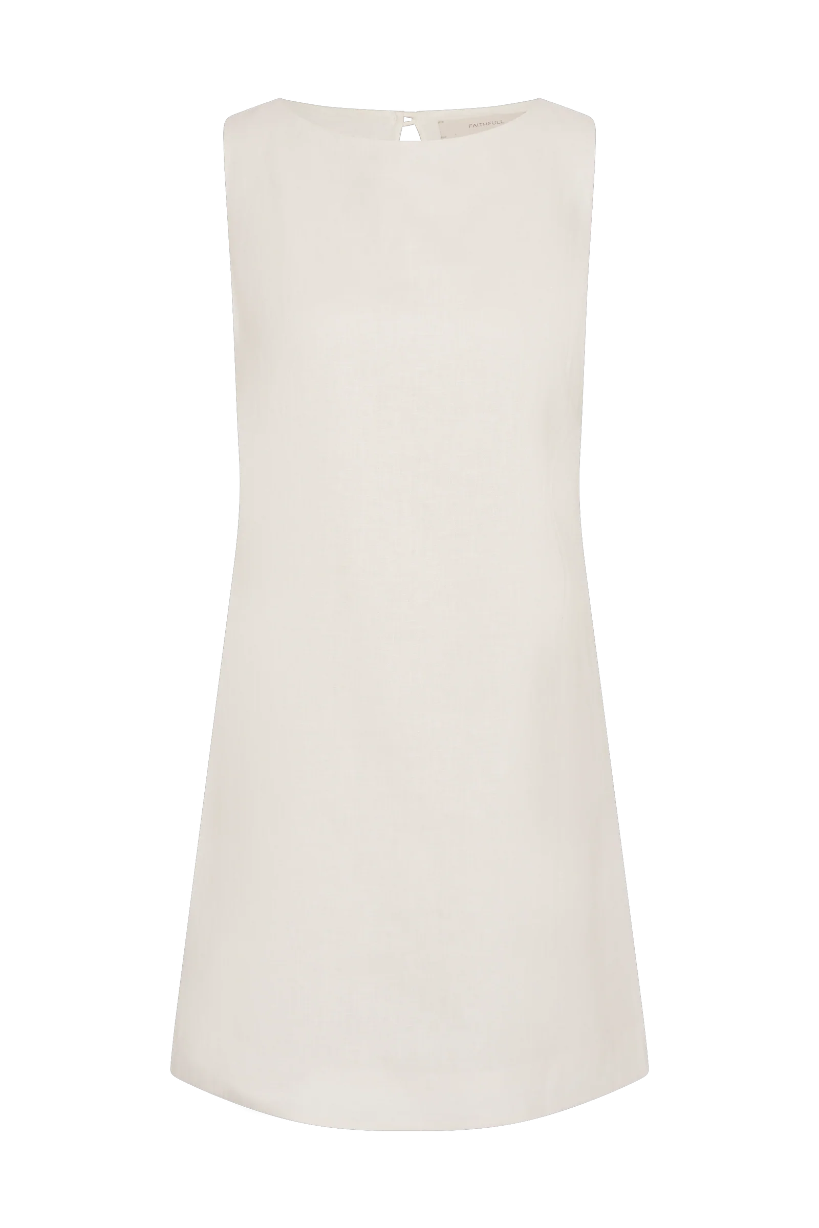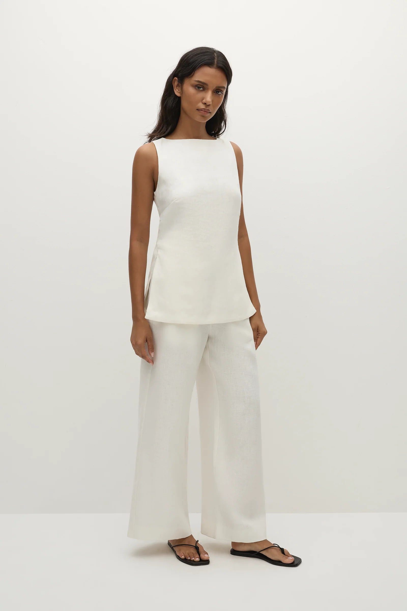 A signature FAITHFULL silhouette, reimagined with new elevated details and designed from a 100% European Flax® linen fabrication. It is a sleeveless tunic-style top with a boat neckline and back tie detail, adjustable to tie in a knot or a bow. Offered in a creamy white, it sits comfortably on the body with side splits at the hem.