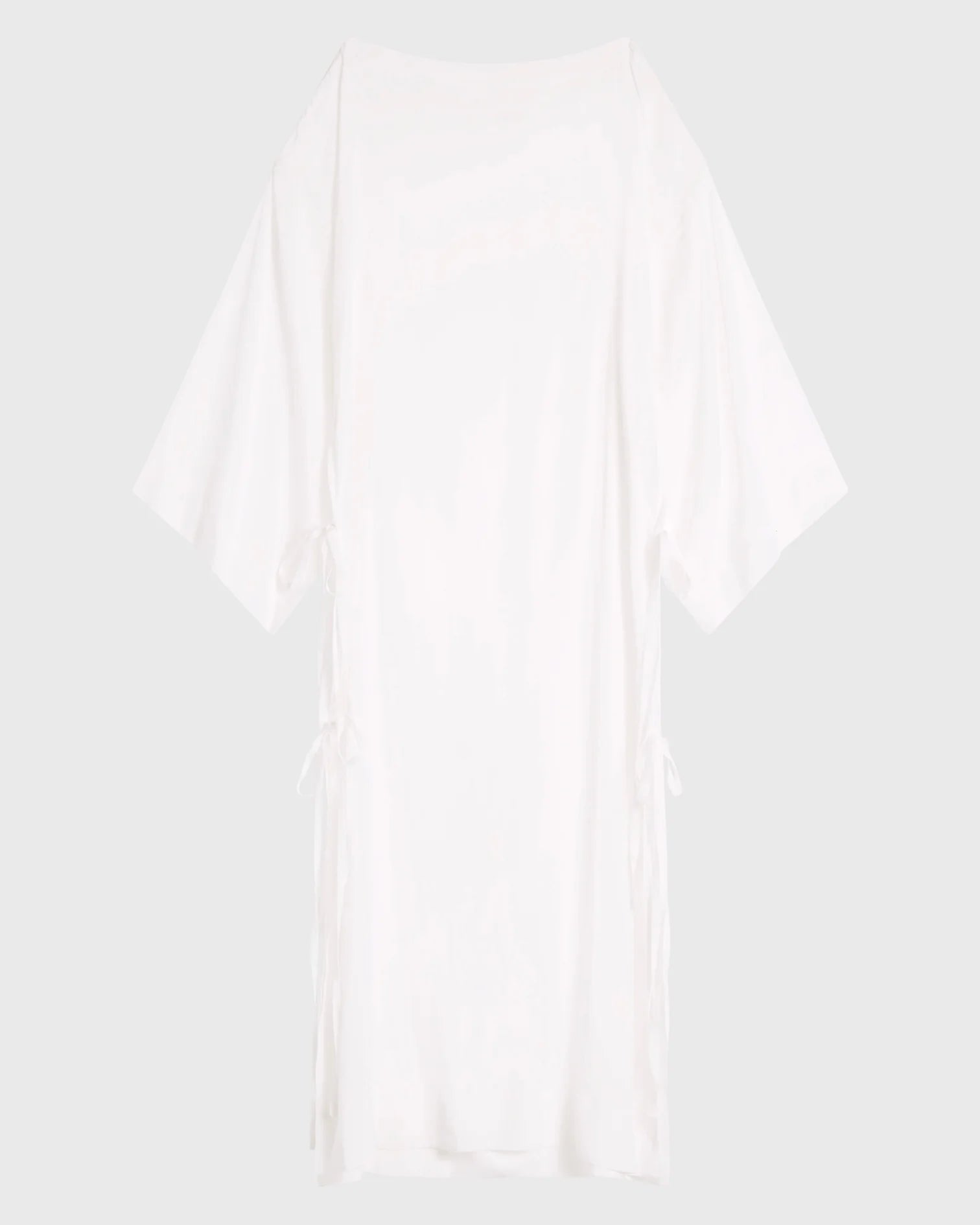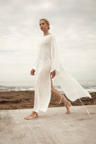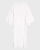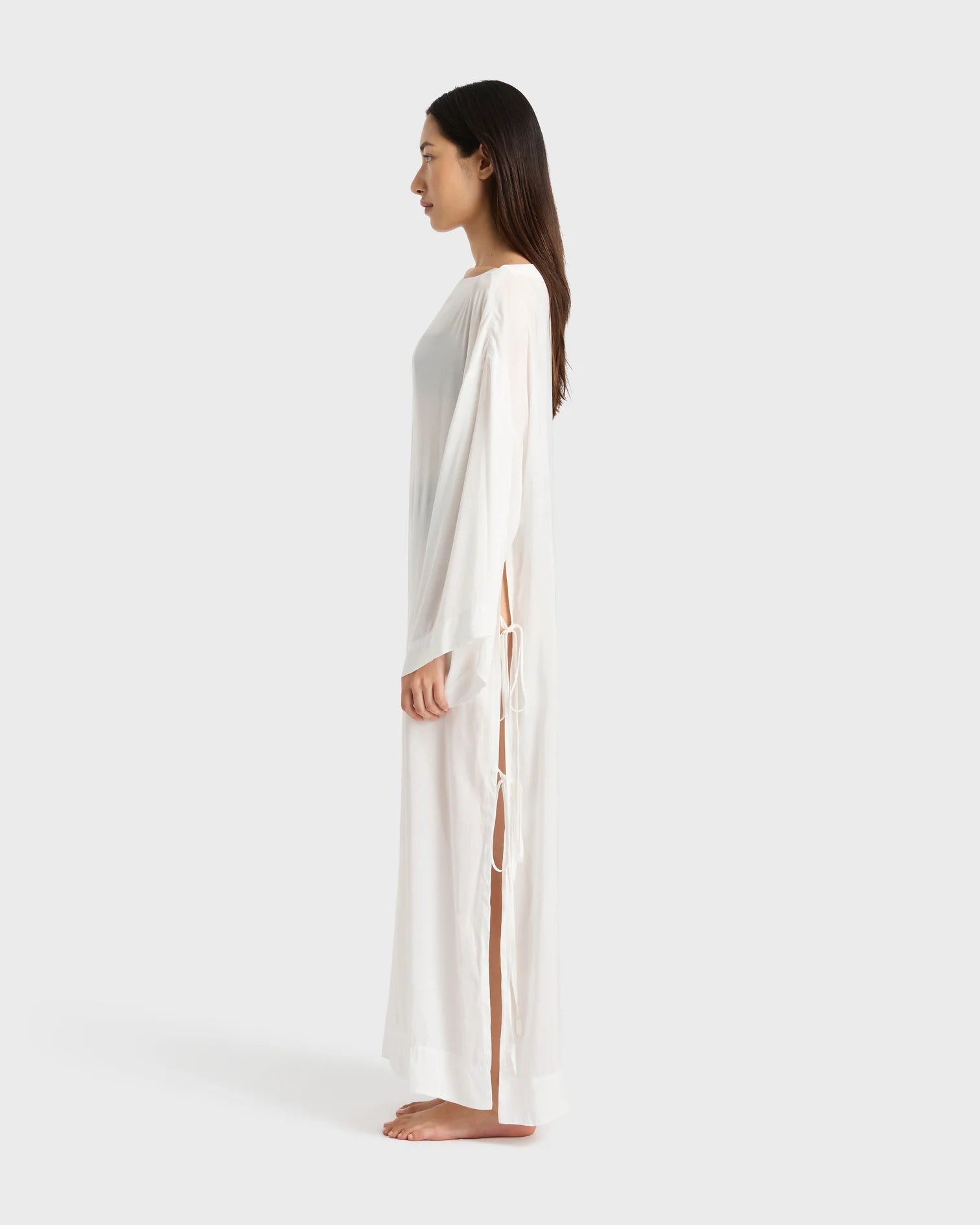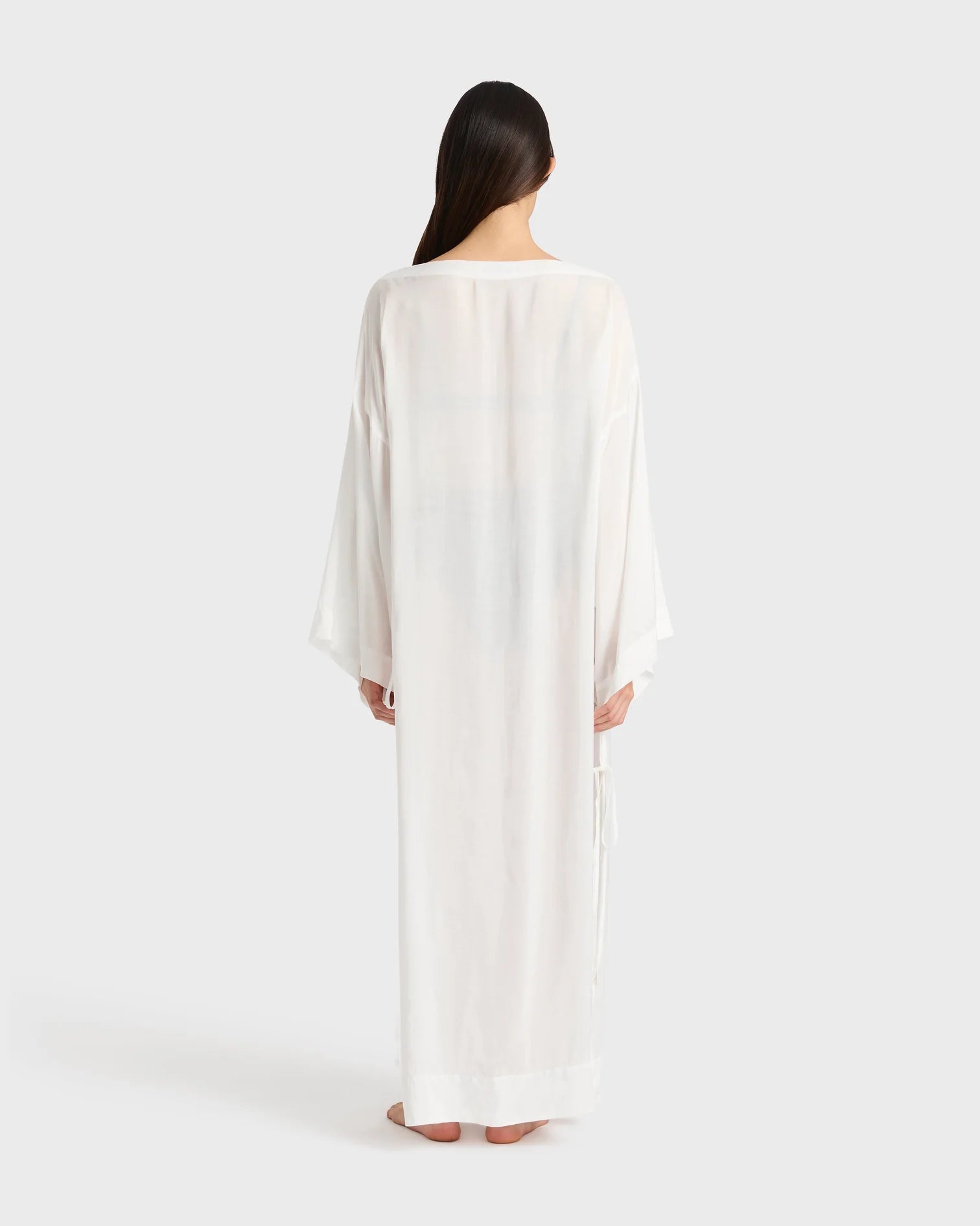 The Cremona Tie-Side Maxi Cover-Up in white is crafted from sheer, lightweight voile for effortless elegance. This floor-length design features side splits starting from the underarm, secured with ties for an adjustable fit. With its flowing silhouette and refined details, it's the perfect breezy layer over swimwear, transitioning seamlessly from poolside lounging to casual outings.