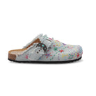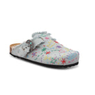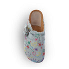 Single-buckle clog, anatomical sole lined in calfskin, denim fabric upper with hand-stitched applications and calfskin lining. Perfect for those who appreciate footwear that combines traditional craftsmanship with stylish detailing, these sabots are a testament to Italian artisanal skills and a chic addition to any wardrobe.