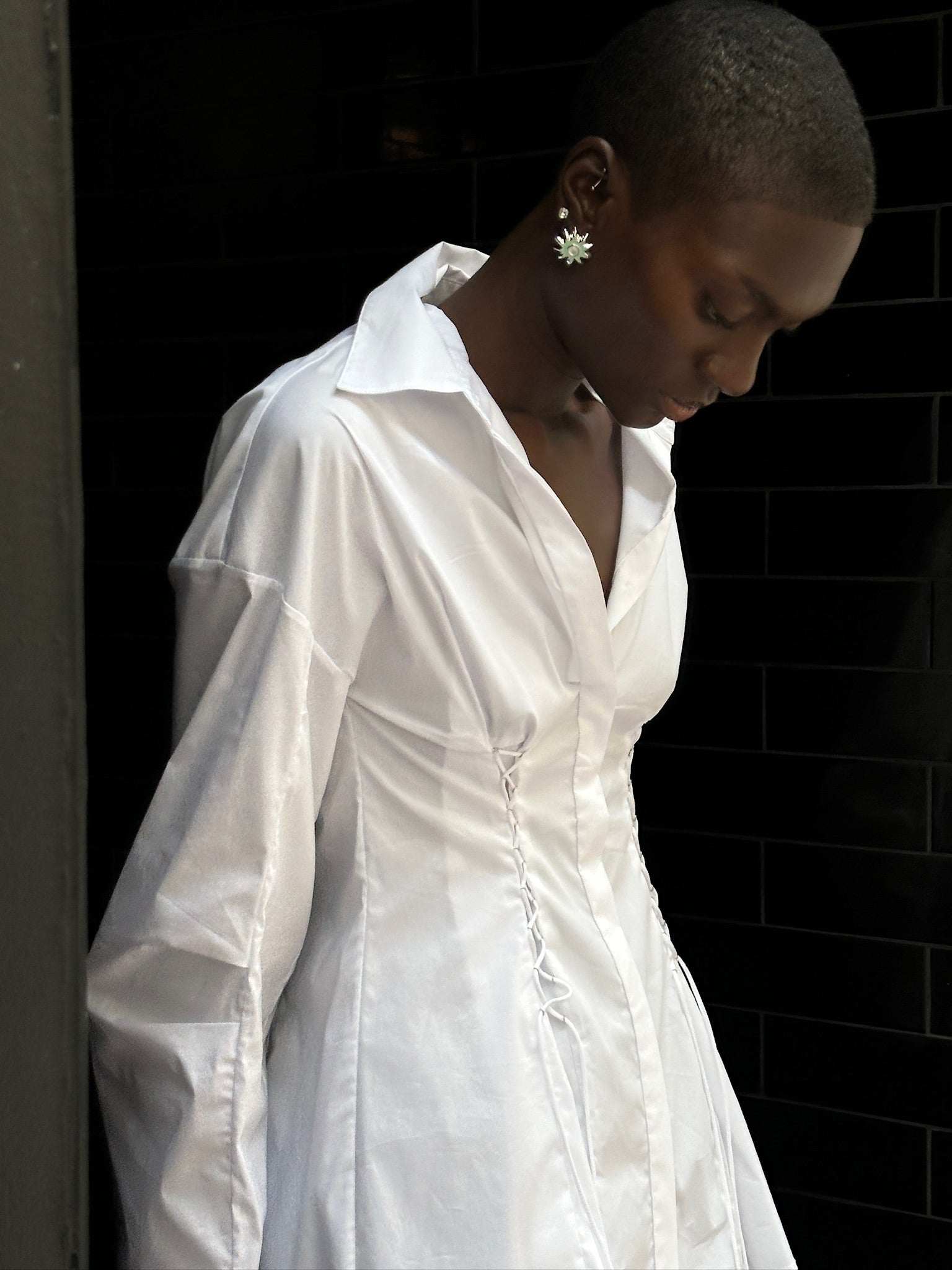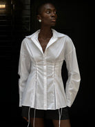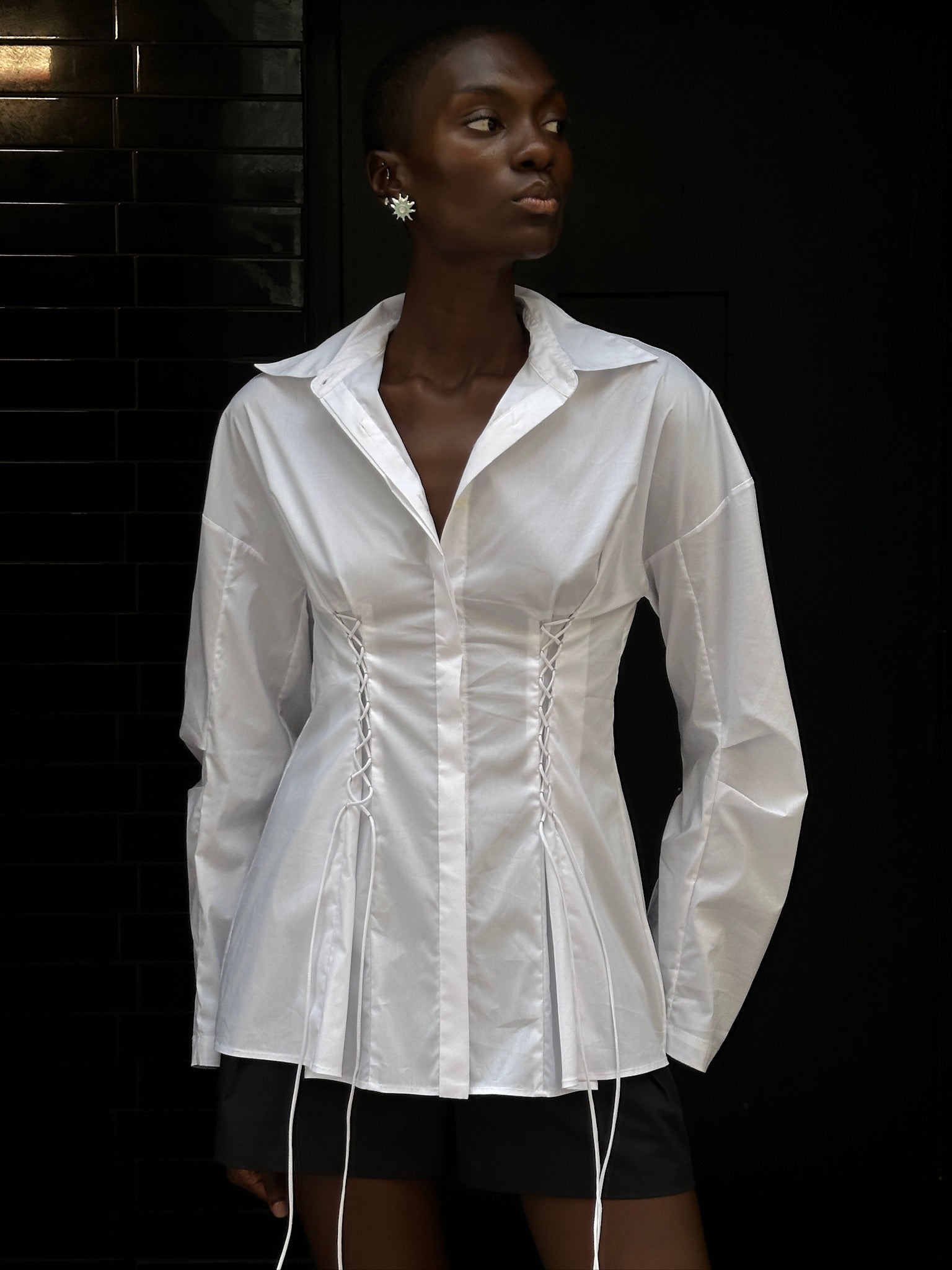 The signature button-up by PRISCAVera returns in a classic stretch cotton poplin fabrication. The shirt is cut to a sculptural silhouette, with dual lace-up panels down the front that shape the waist.