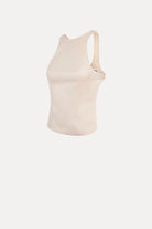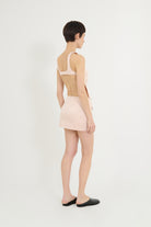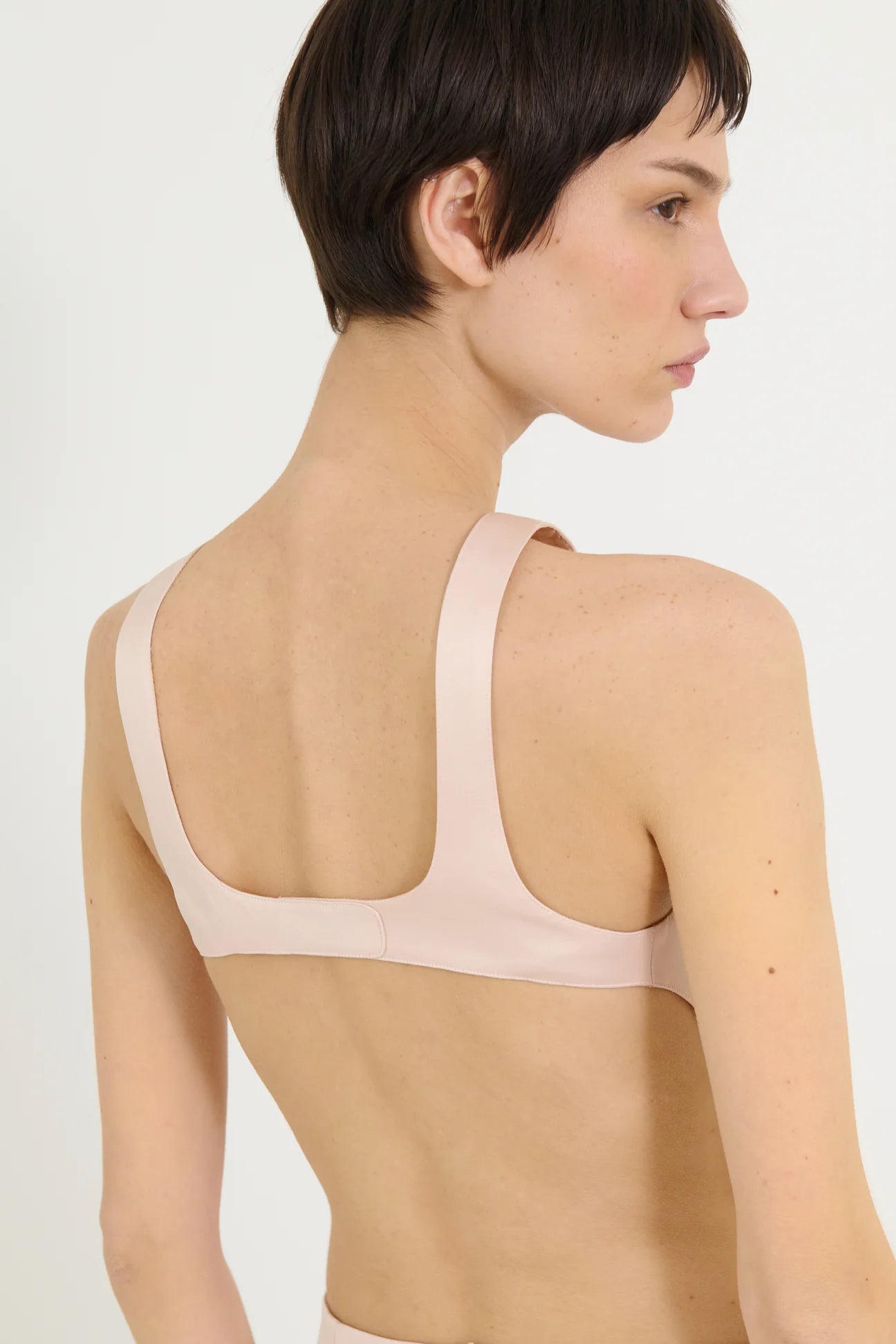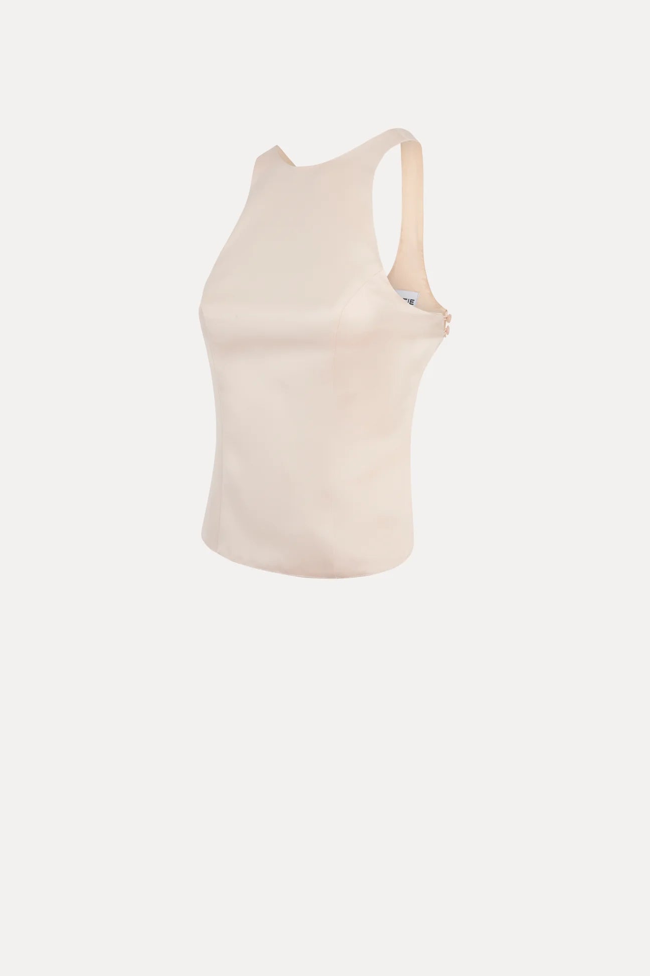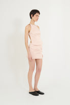 An ALFIE classic, this light pink satin top features a refined crew neck and delicate straps that rest on the shoulders. Its open back is accented with a supportive band fastened by two small side buttons, combining elegance with subtle detailing.