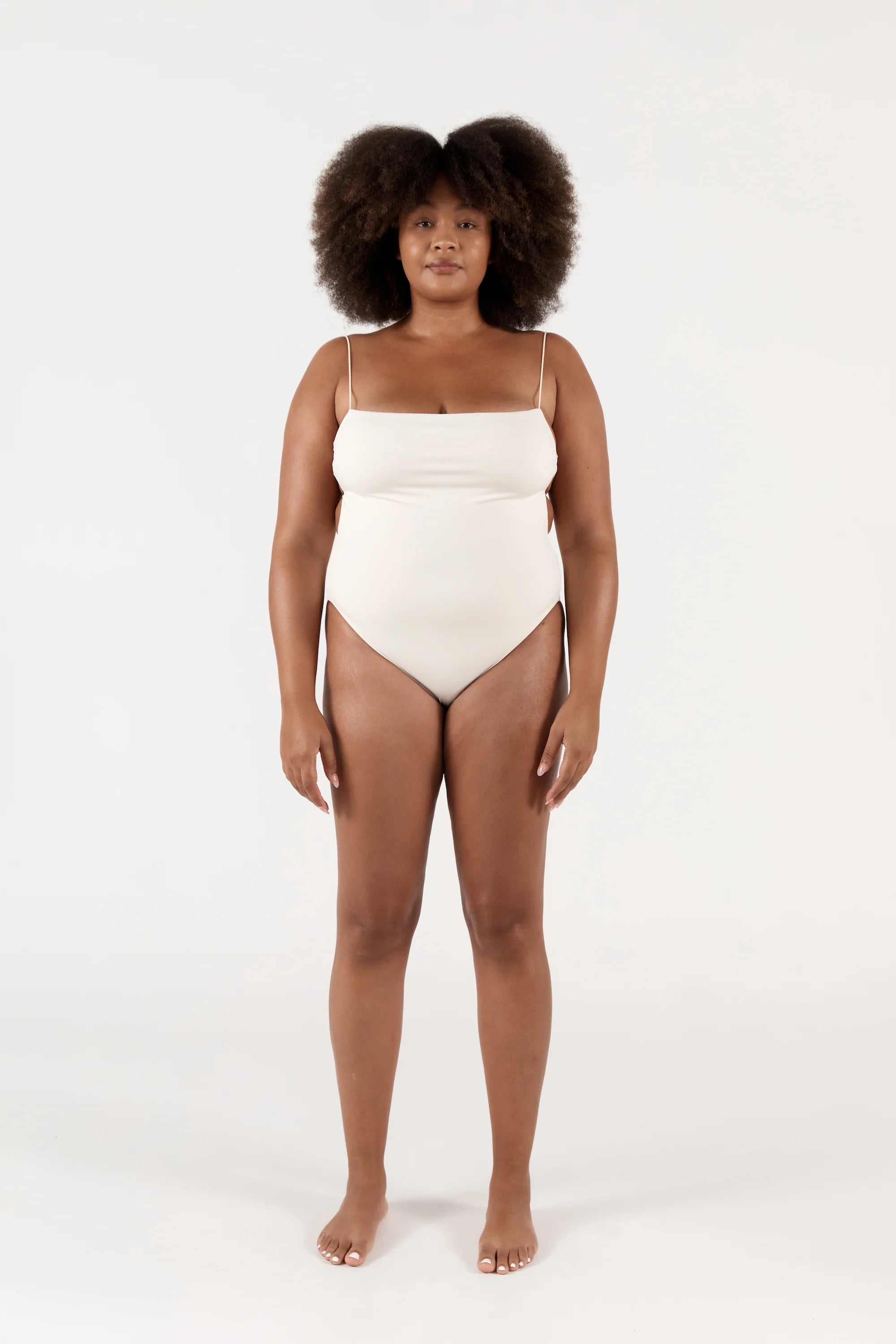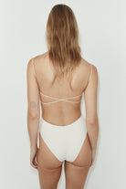 Our signature silhouette. The Fine Strap One Piece. Designed with an exposed back, this one piece has elasticated thin straps and figure-flattering high cut legs.