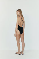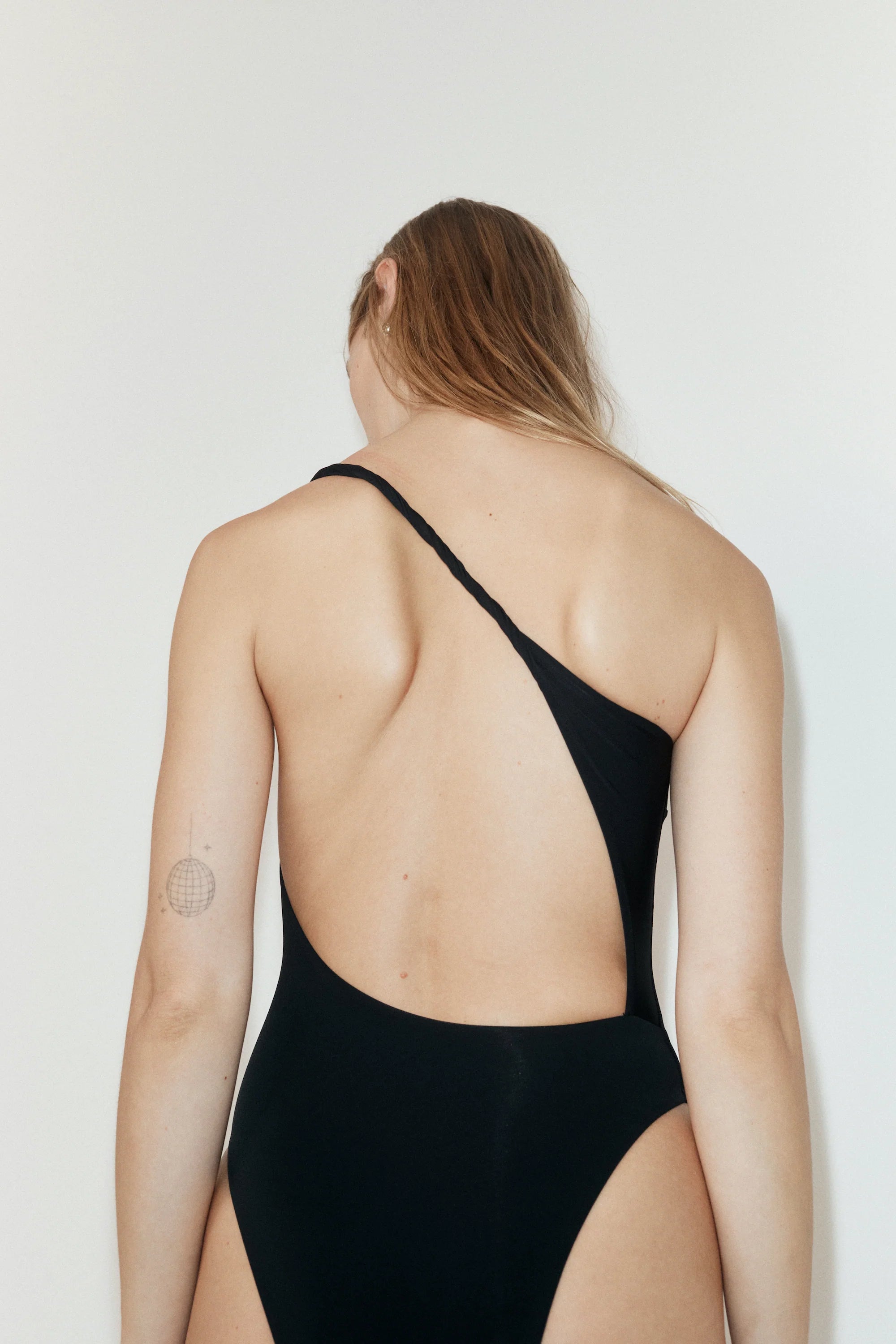 Asymmetric one-shoulder swimsuit, designed with a cut-out open back and softly twisted shoulder detail in medium stretch.