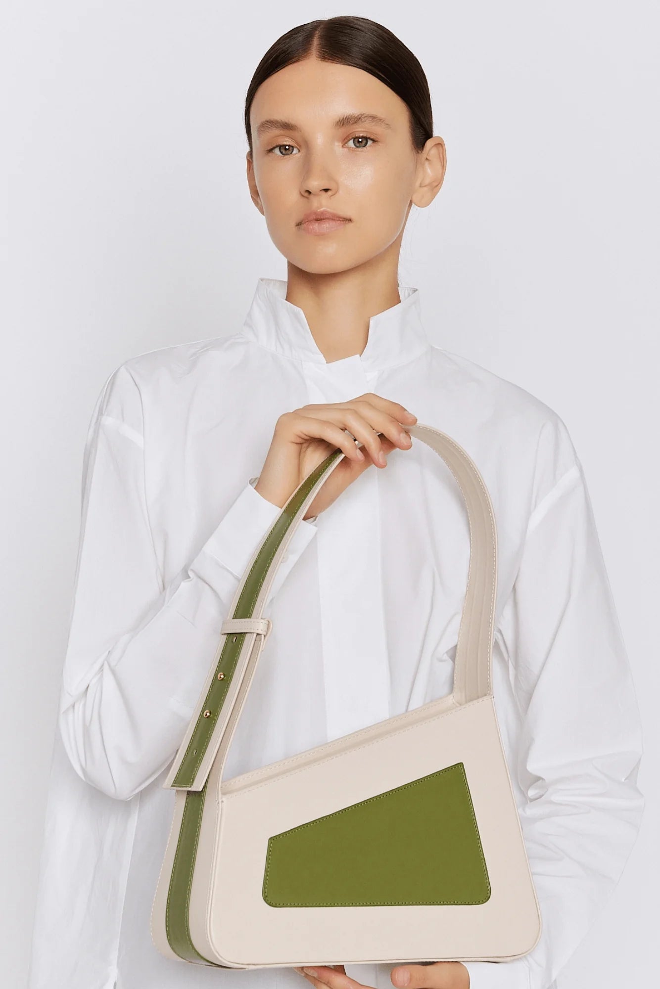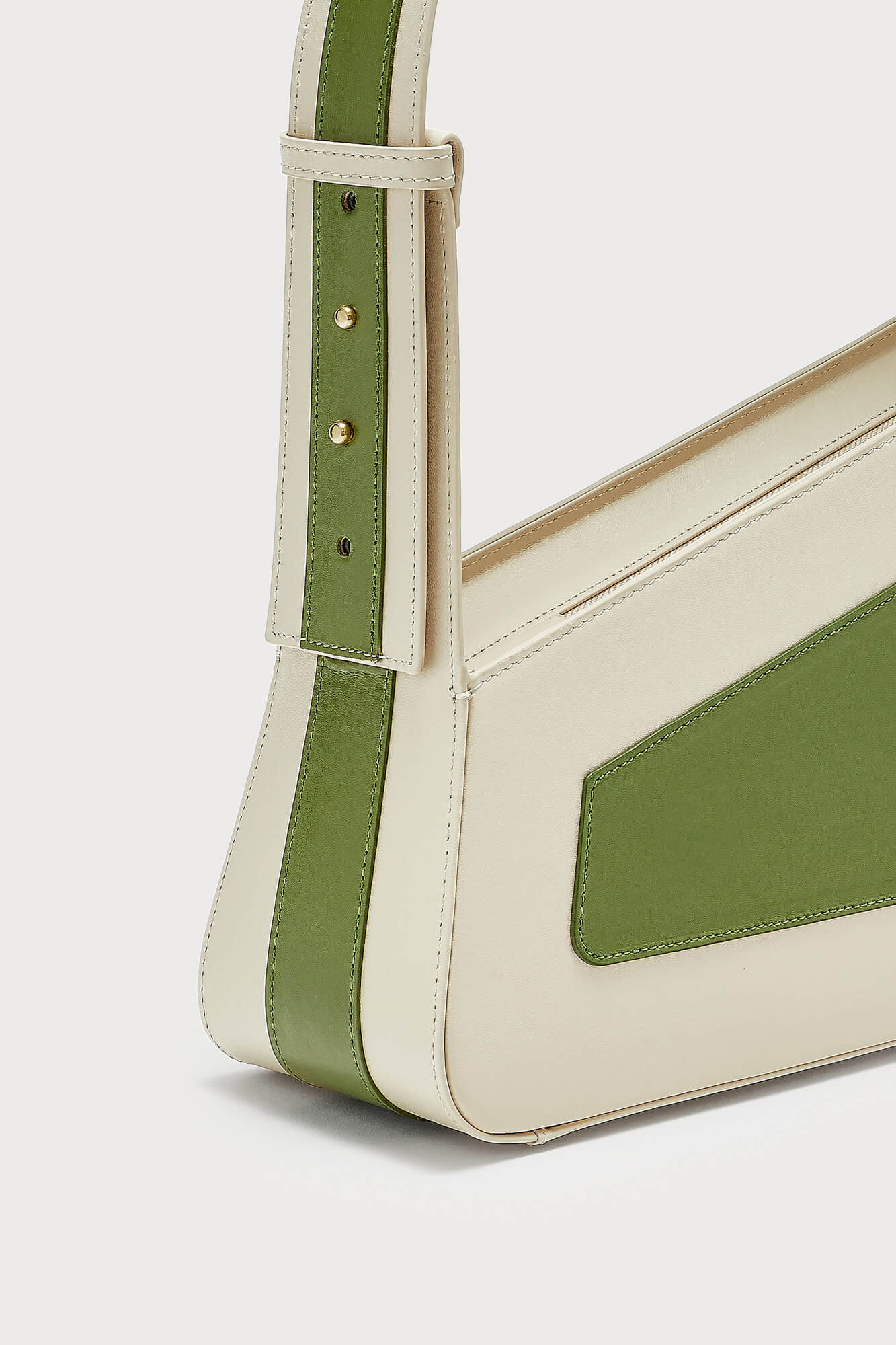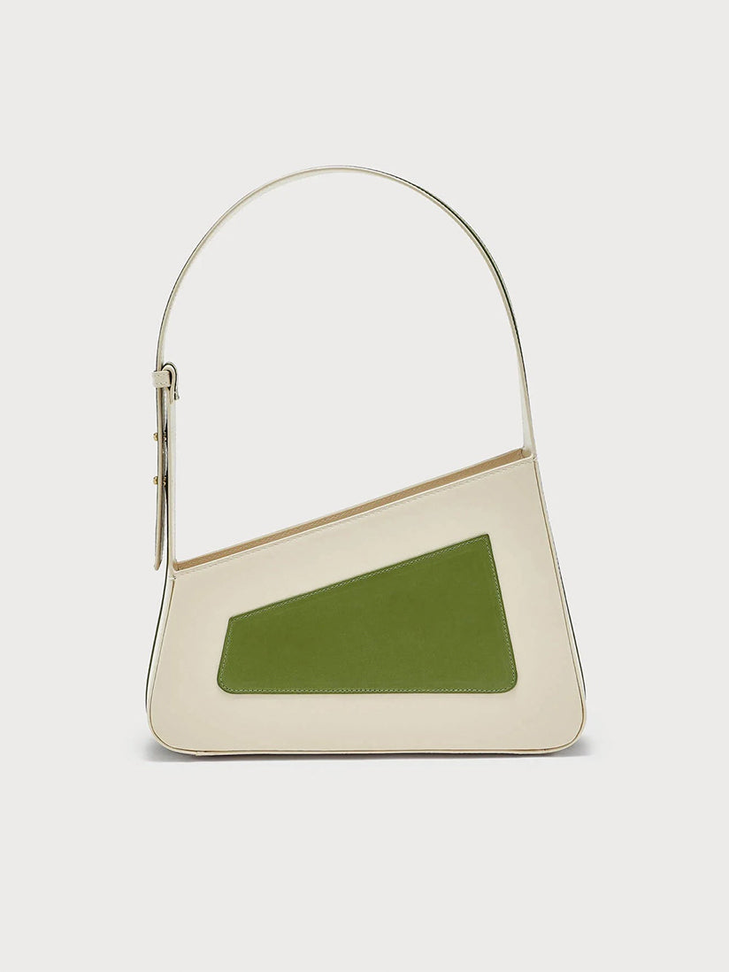 Offered in a practical medium size for everyday use, this bag, made in Spain from calf leather, has been designed with a geometrical and bicolor shape. This baguette is worn on the shoulder thanks to its adjustable strap to ensure comfort and hold.