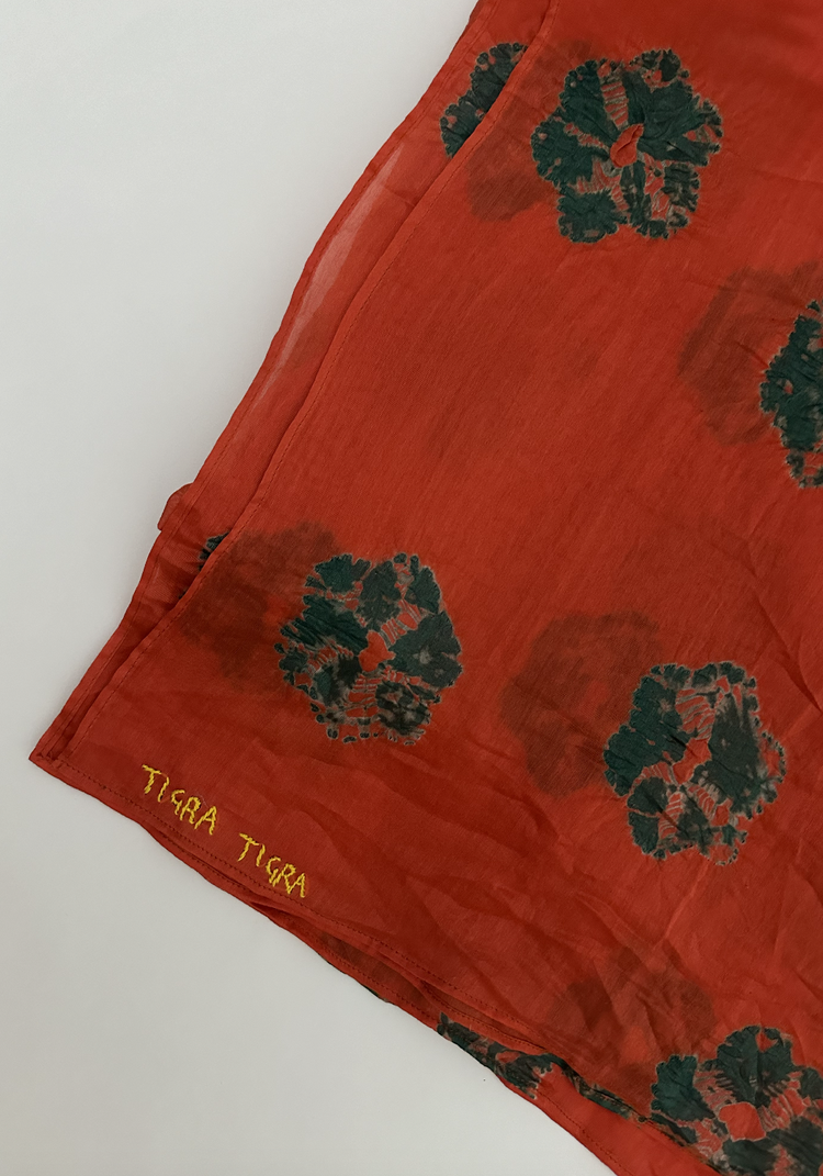Hand-woven silk chanderi scarf/wrap with hand tie-dyed bandhej flowers.