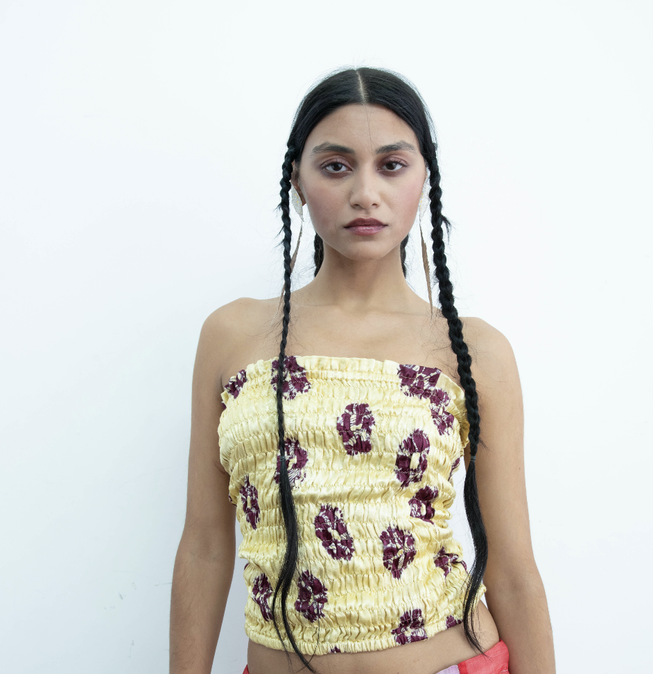 Gathered silk mashroo tube top with bandhej tie dye flowers.