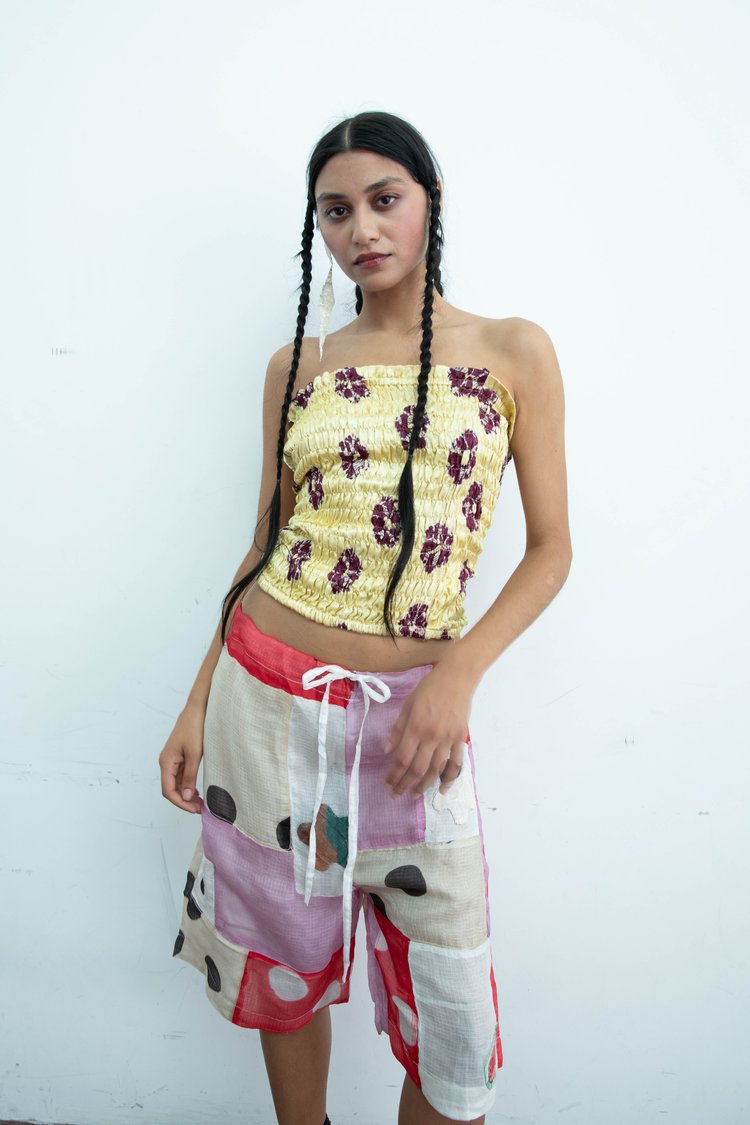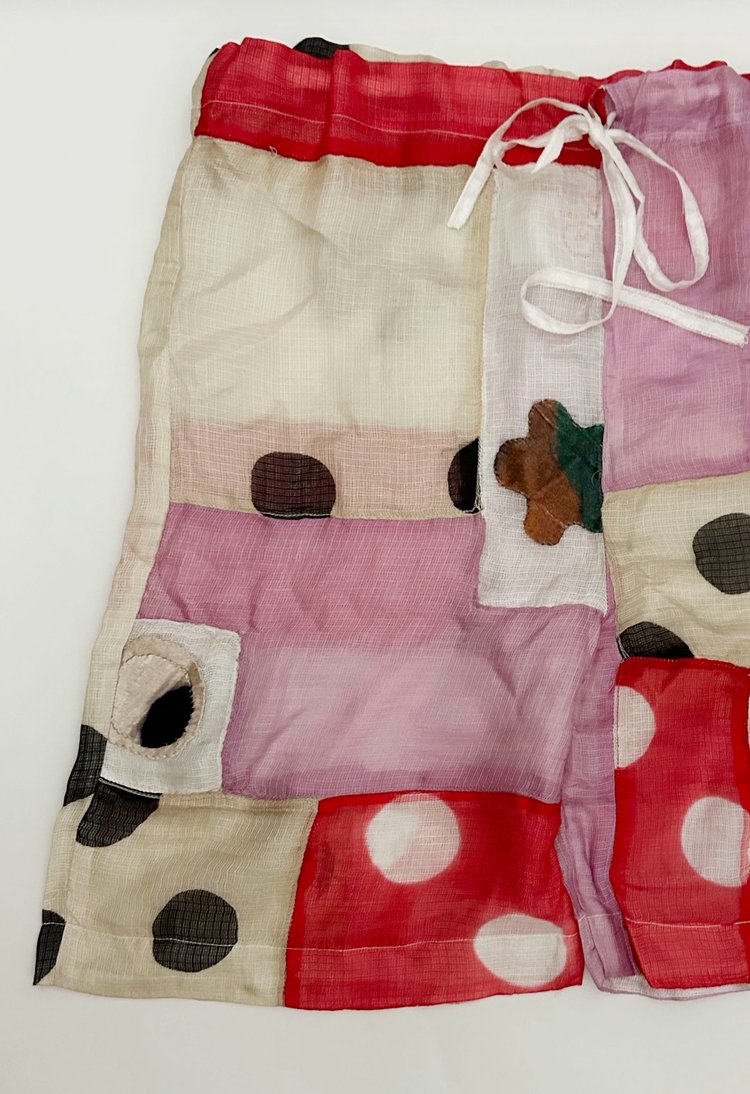 Patchwork silk kota shorts. Super lightweight with mixed silk kota patterns with tie dye and hand-applique. Drawstring waistband.