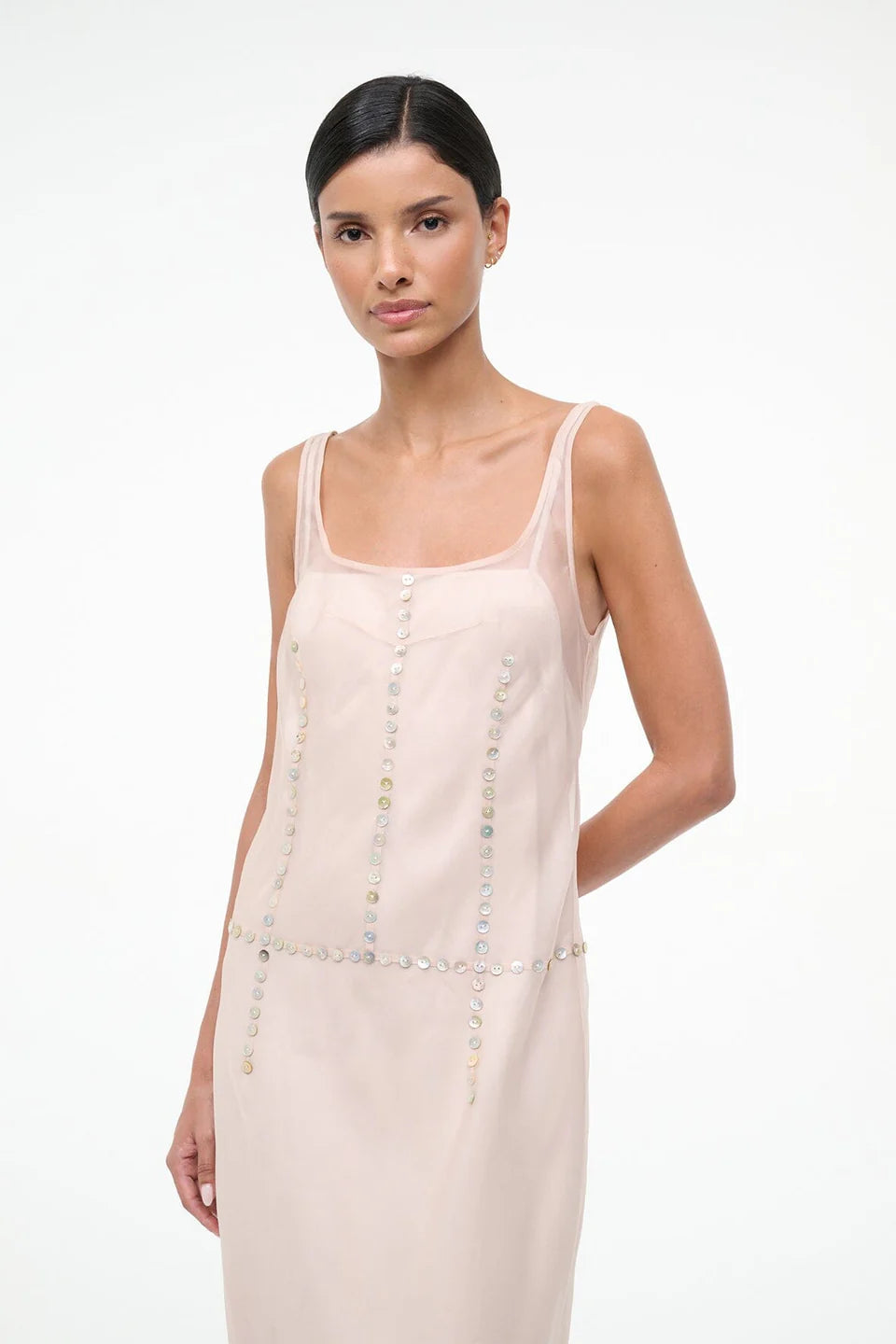 A sheer silk dress with mother of pearl button details, the Greta features a low back with zipper closure and a slightly flared hem.
