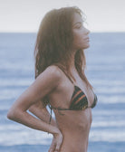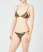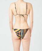 An asymmetric line print infused with oranges, greens and browns enjoy wearing the colours of the sunset. the dolores two-piece is an essential swimwear piece designed with simplicity in mind. the top is made with adjustable and interchangeable straps, and a tie back