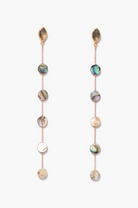 18k gold plated sterling silver post back earrings featuring bezel wrapped labradorite marquises and abalone coins. 3 1/2in. drop.