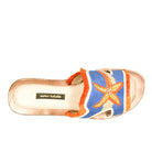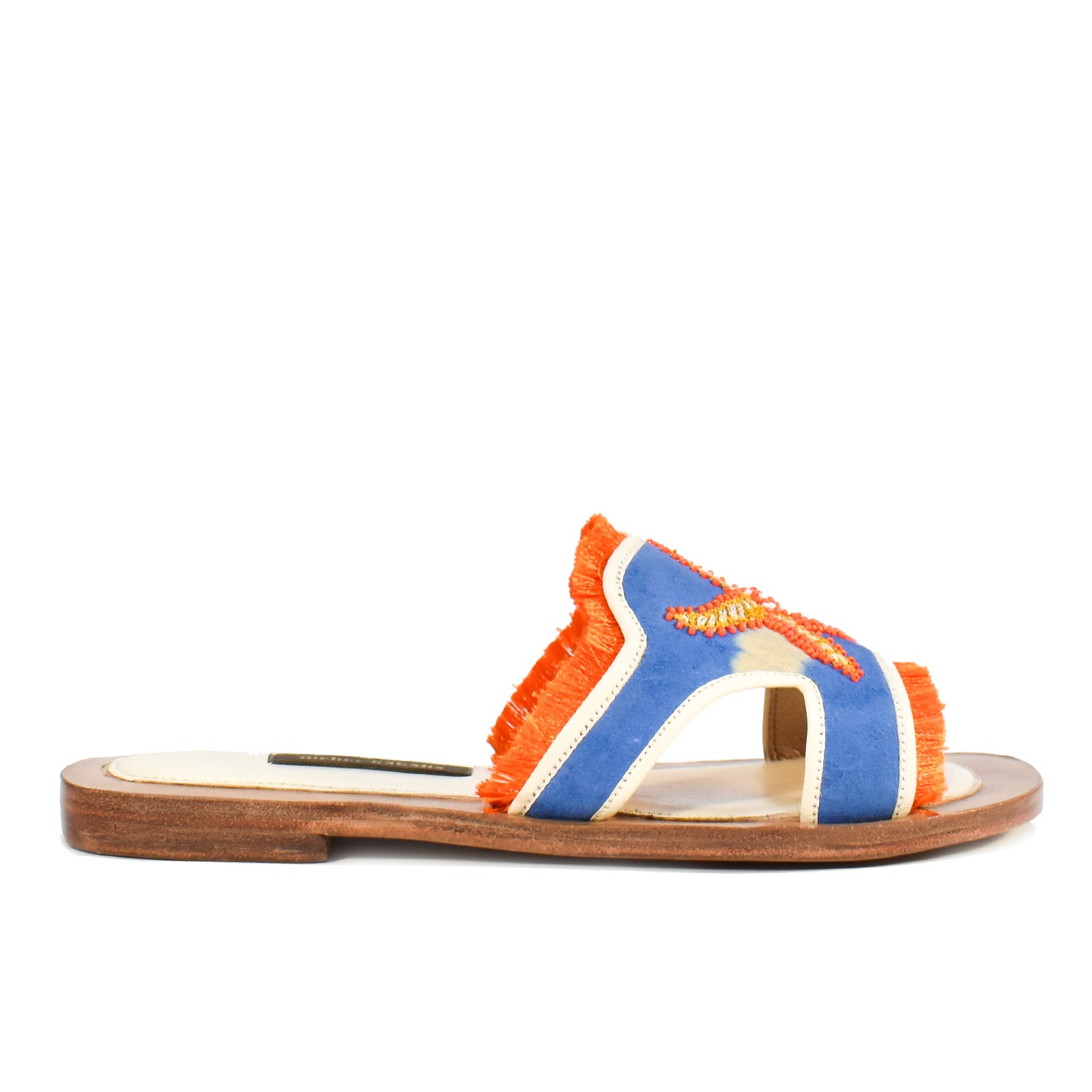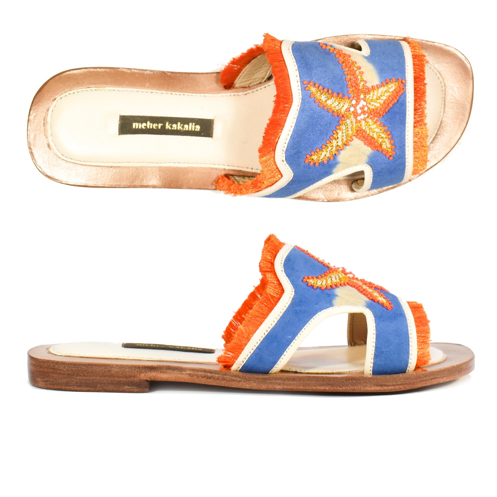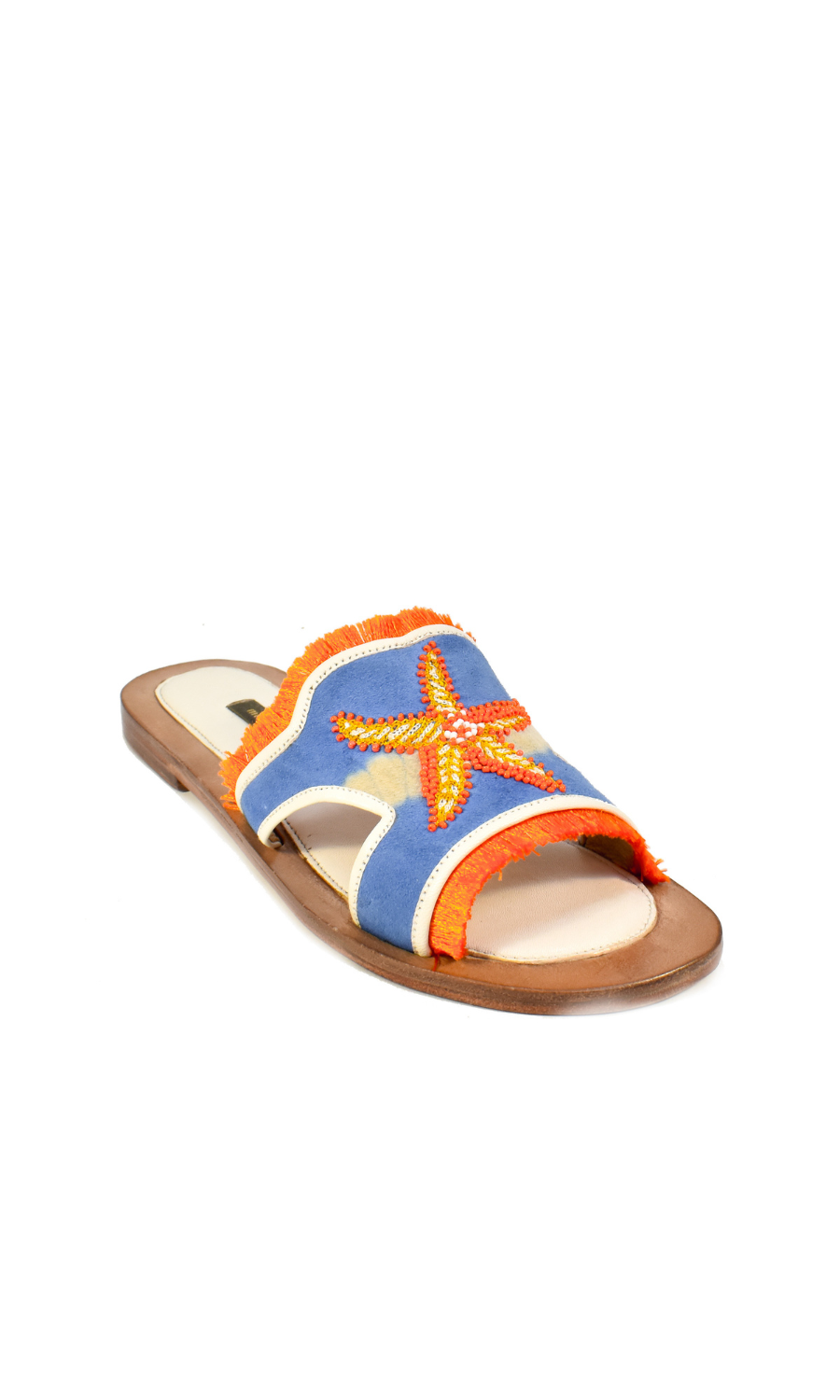 Mazu slide is hand embroidered on tie and dye leather using sustainable methods. Due to the nature of Tie Dye, each foot has unique markings, which are a feature of the product. Embroidered by a tribe living along the Silk Route, these nomadic artisans have passed down their embroidery techniques for generations. The embroidery is rich, full of texture, and durable, as it is embroidered directly into the leather.