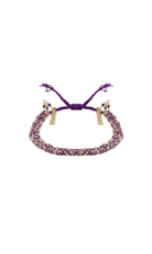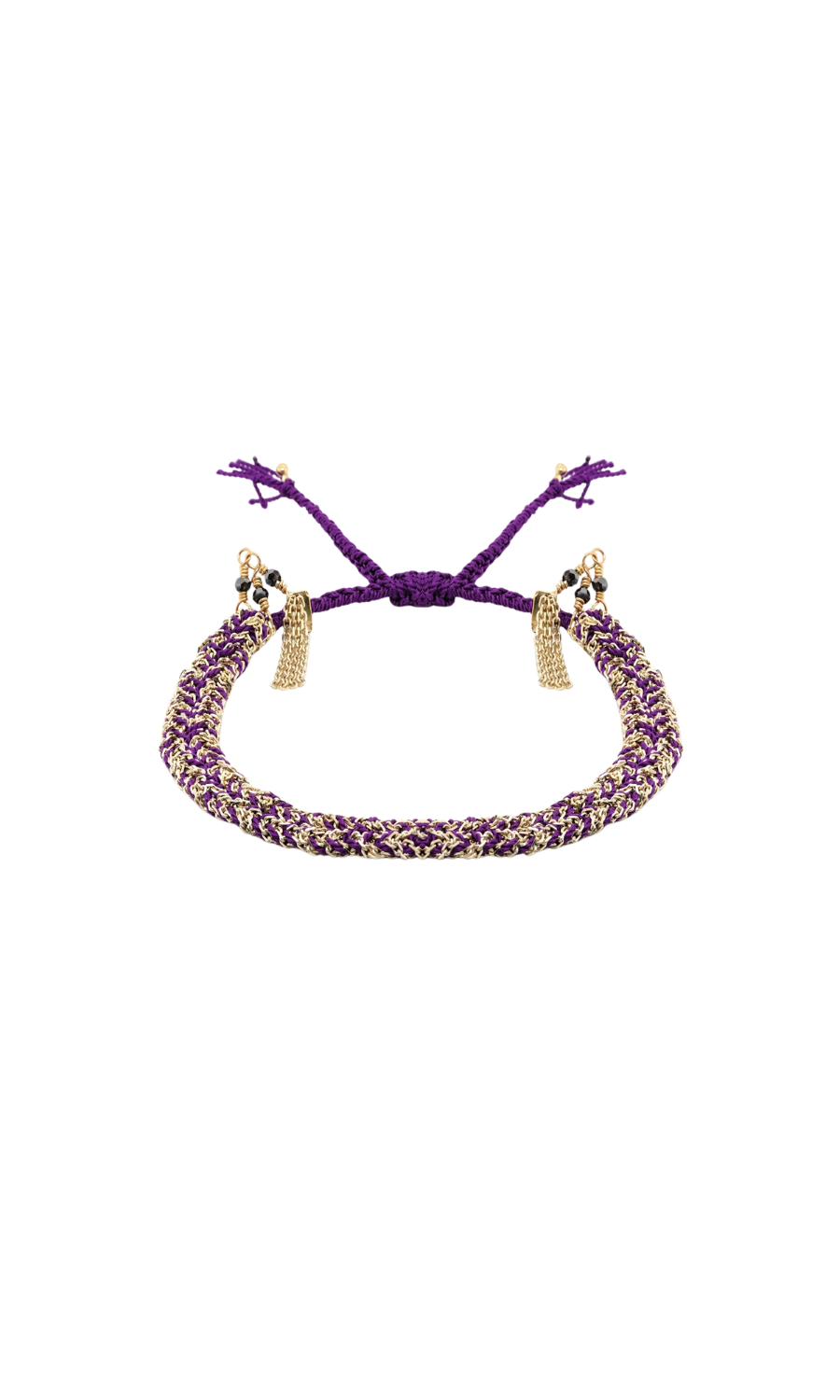 The iconic hand-braided bracelet with forçat Sterling silver chains and twisted amethyst color silk yarn finished by little chain fringe and tiny crystal beads. All parts are dipped in yellow gold.