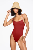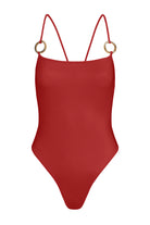 a sleek and minimalist one piece with thin adjustable straps featuring organic shaped ring front details.