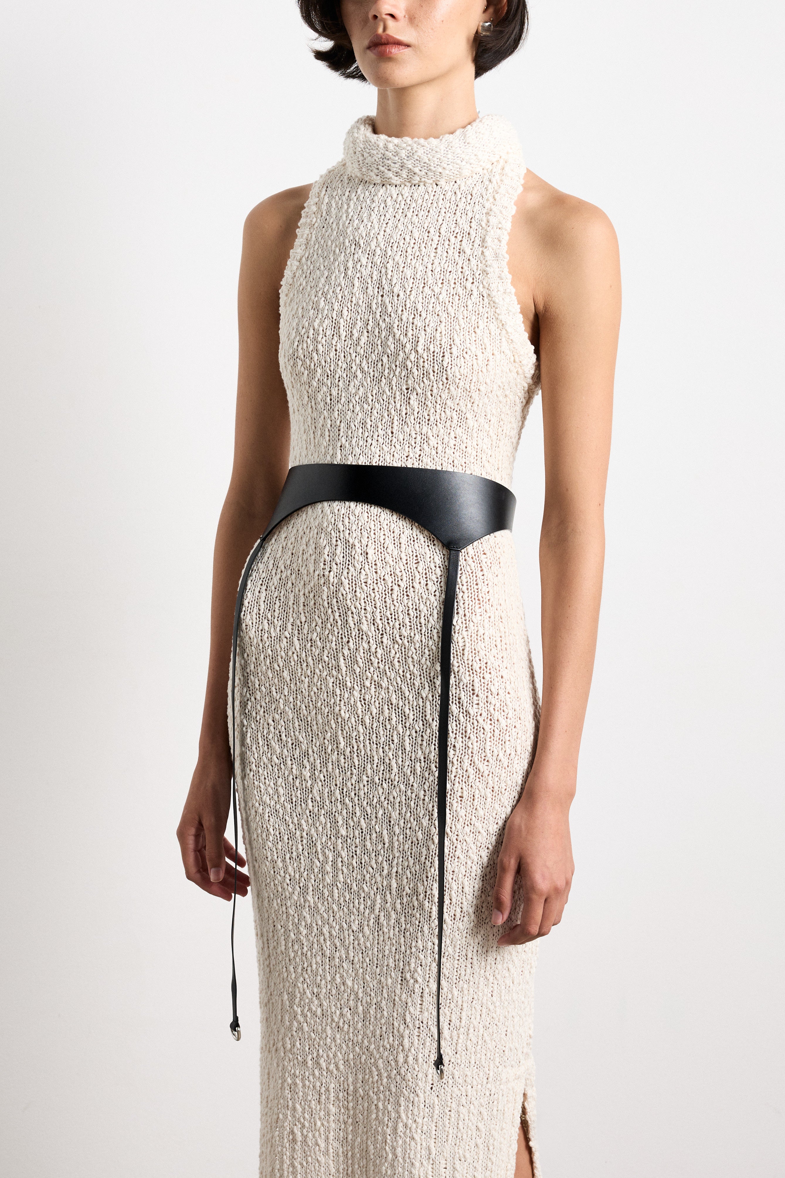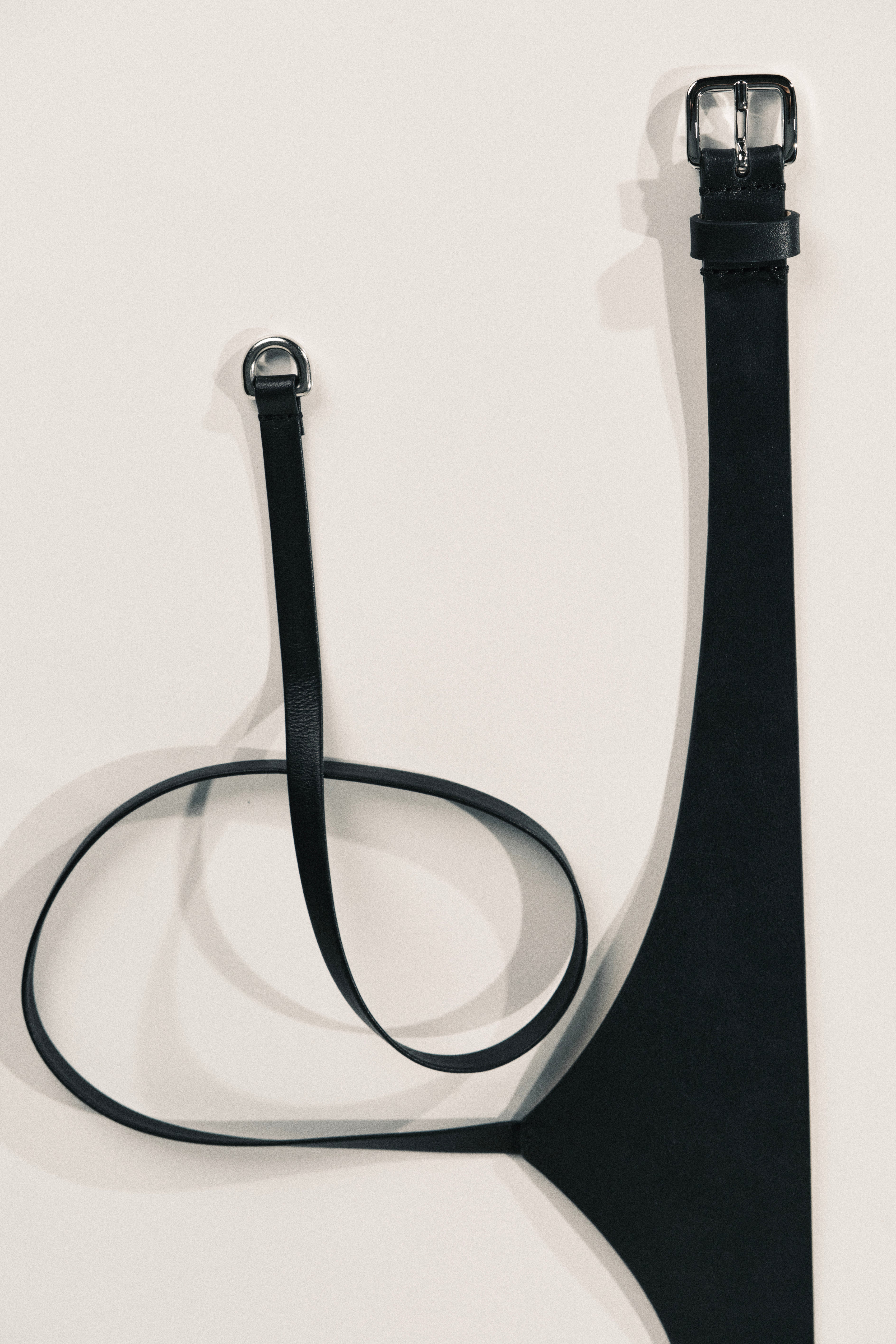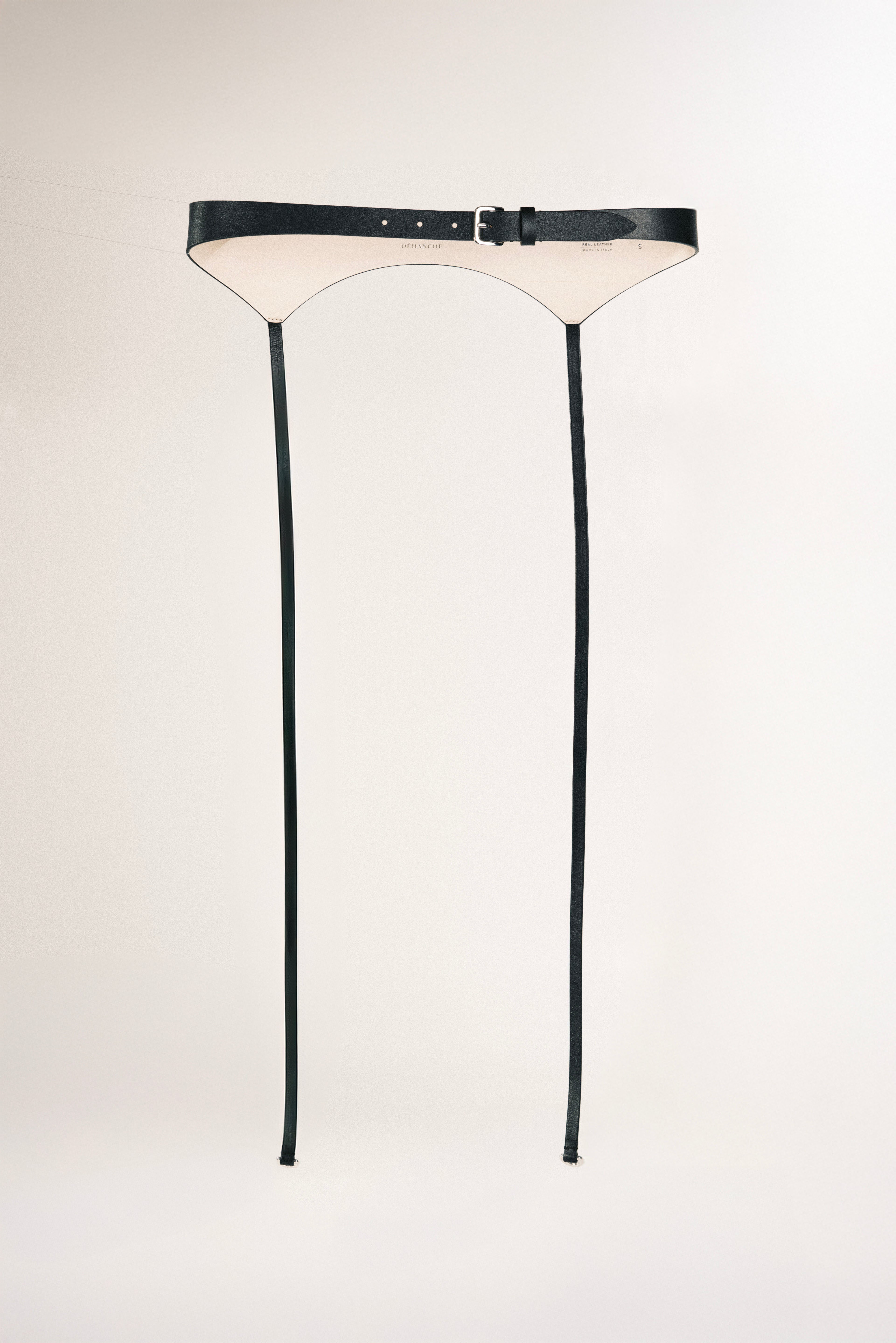 The Laisse is a modern ode to the garter : sculpted in Italian calfskin, designed to trace the body with quiet provocation and refined precision.