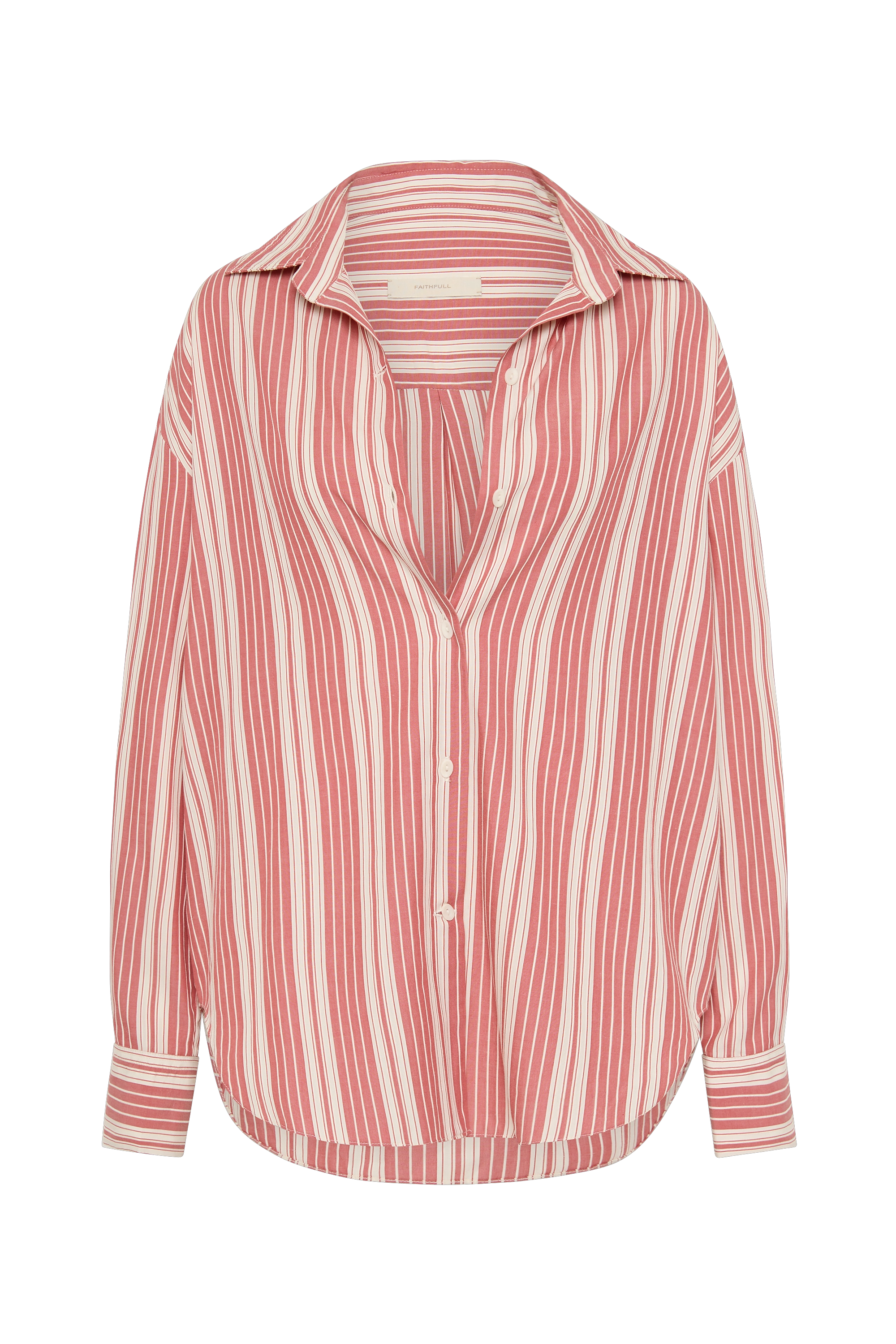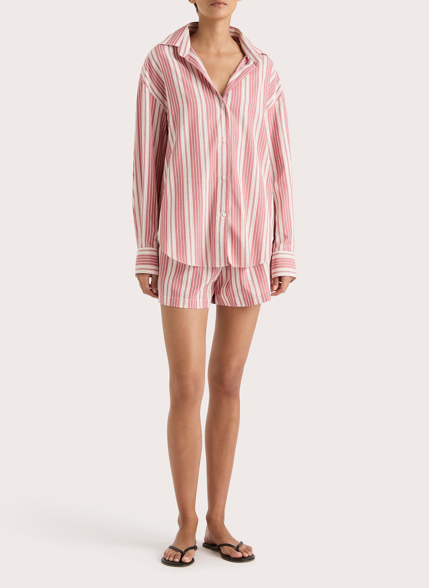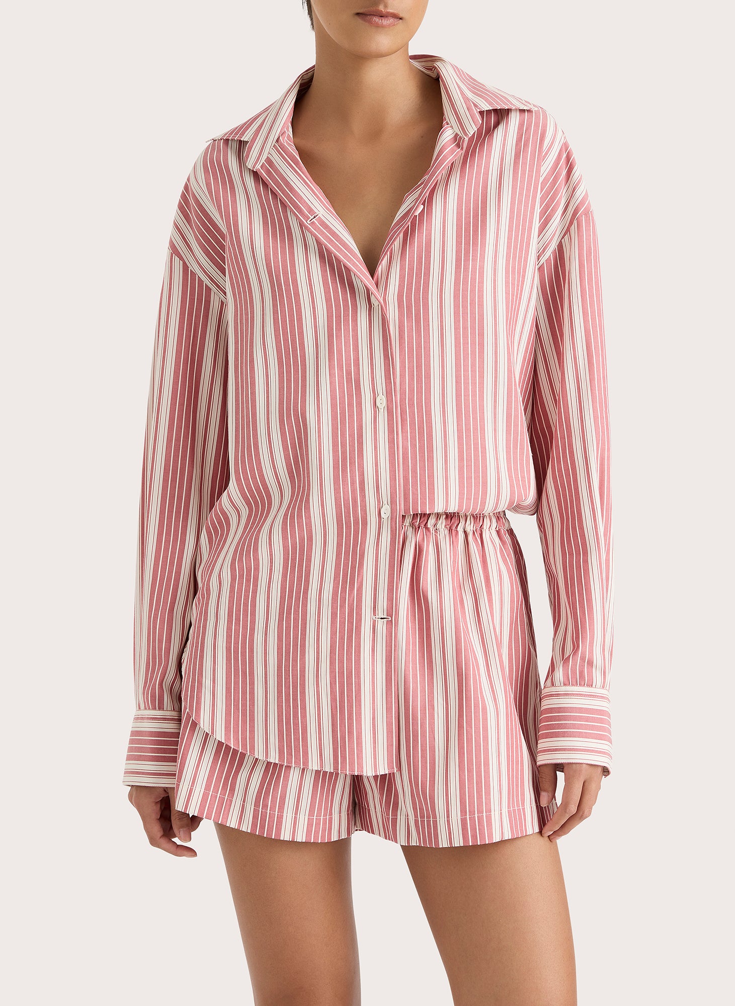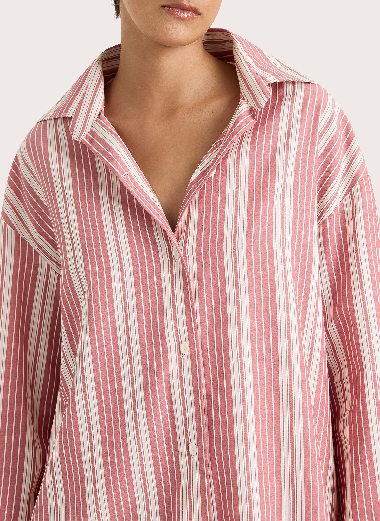 A boyfriend-style button-up shirt with an oversized fit and custom organic oval shape buttons, it is designed from an effortless blend of 100% organic cotton and rayon in a yarn-dyed soft cherry pink stripe. Its relaxed shape allows for versatility in styling and transeasonality.