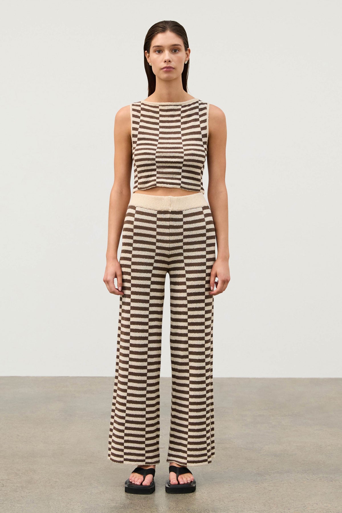 The Cocoa Grid Textured Knit Top is crafted from a mid-weight, sponge-textured fabric featuring a unique custom knit pattern. It showcases a flattering high neckline, in a cropped tank silhouette. Pair with the Cocoa Grid Textured Knit Pant for a coordinated look.