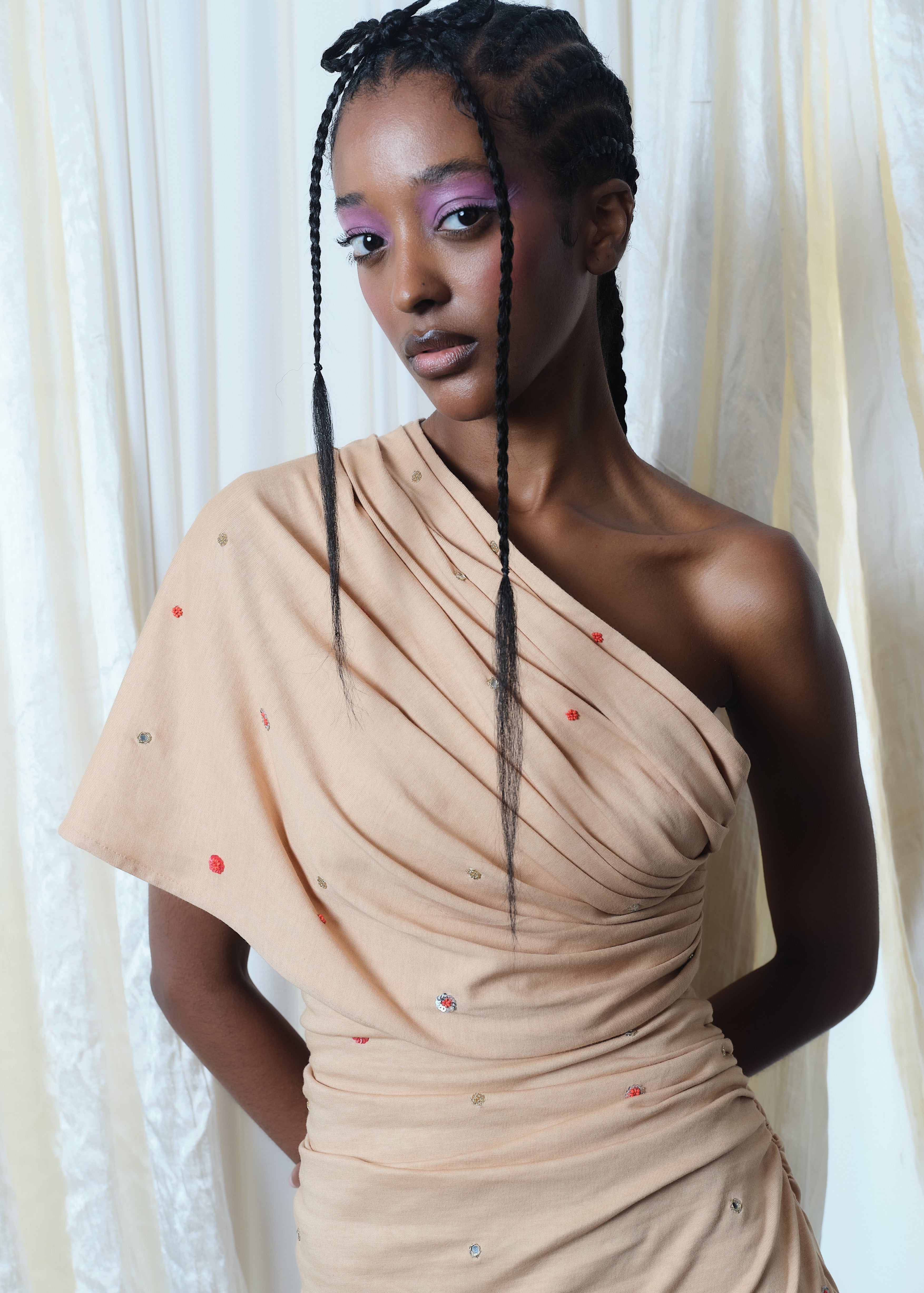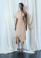Organic cotton jersey knit draped into a one-shoulder asymmetric dress with traditional tiny glass beadwork and tiny mirror work placed throughout the dress. Closes on the side with a hidden zipper.