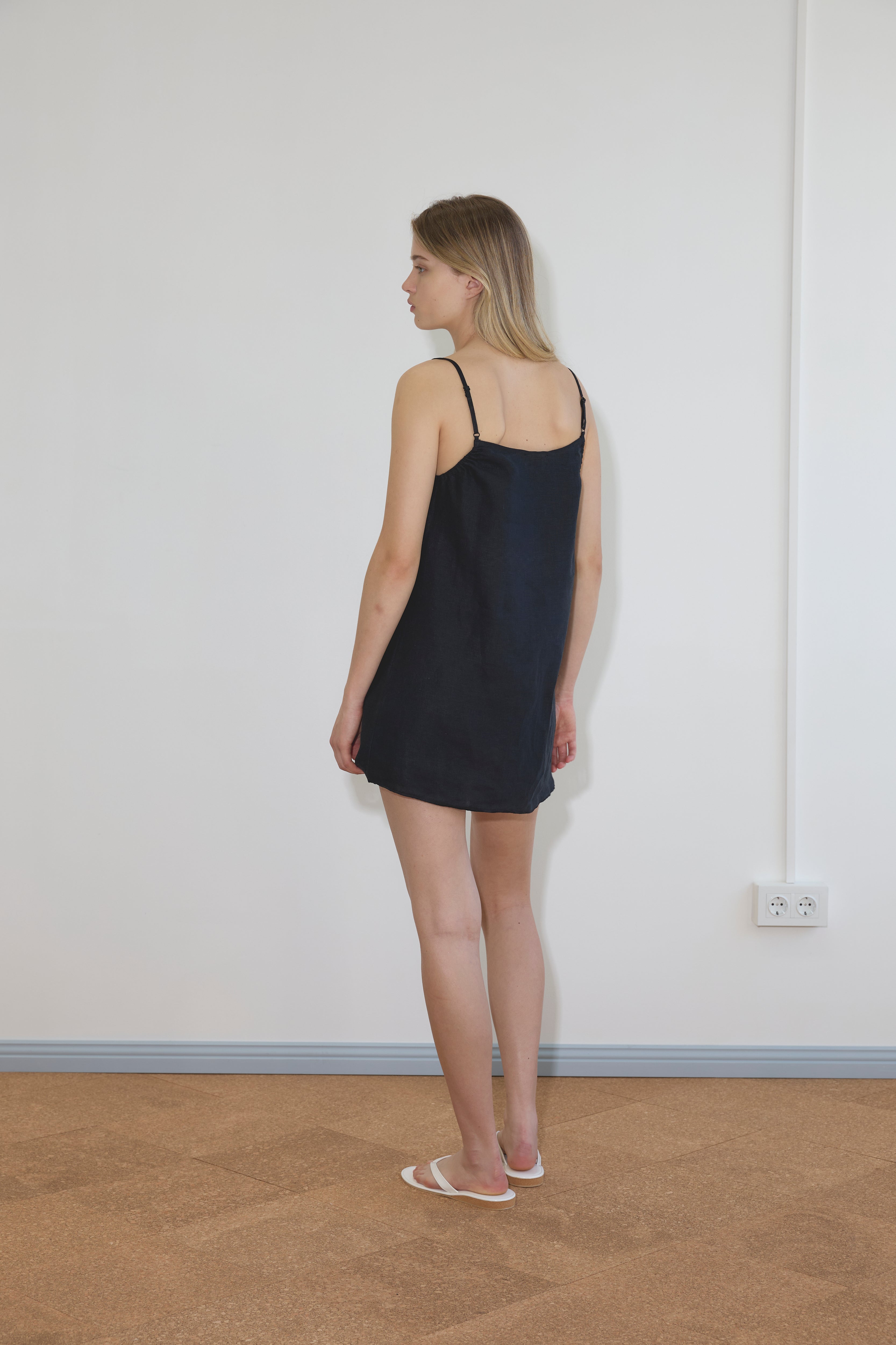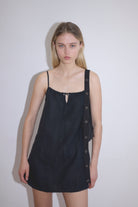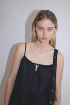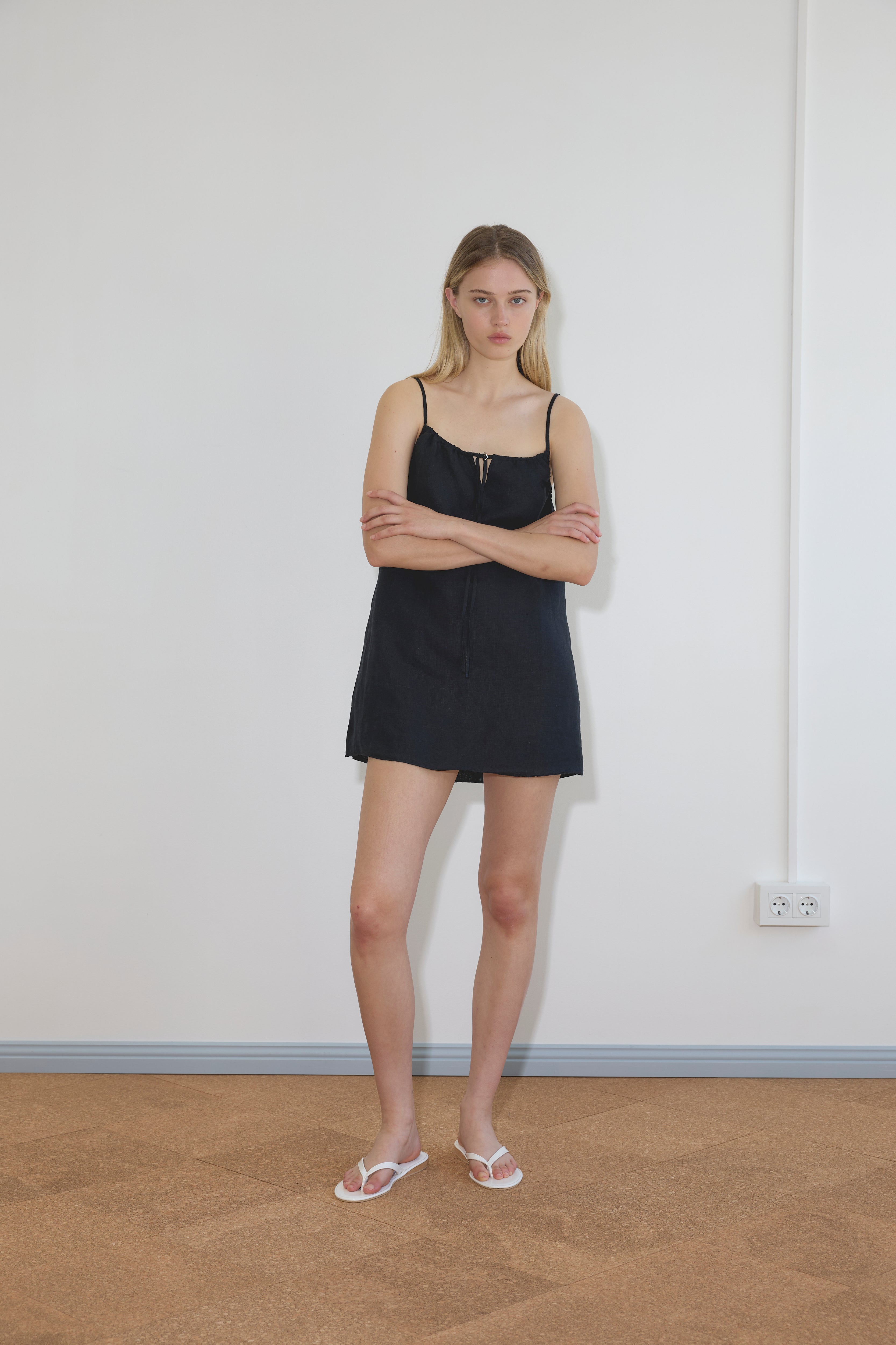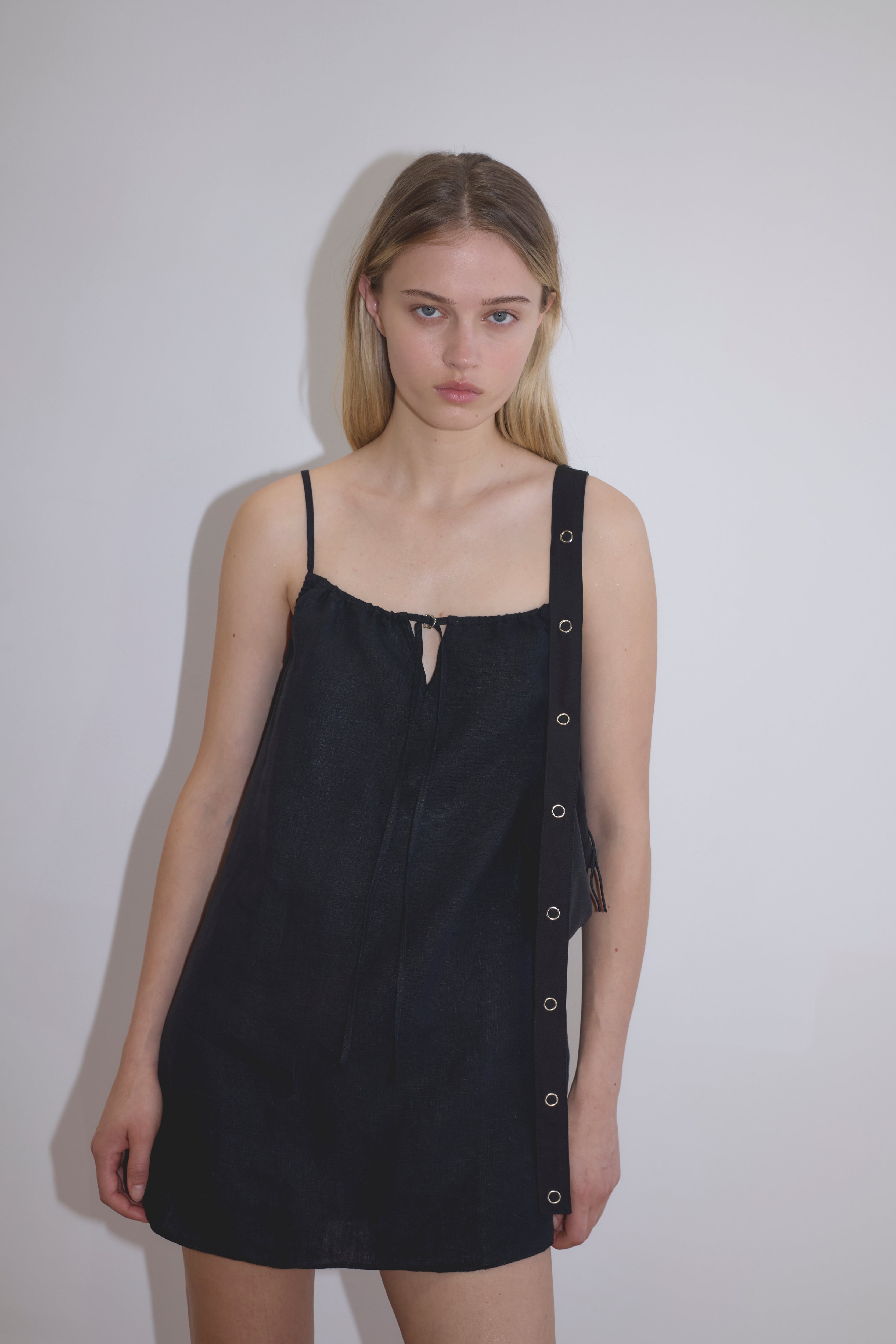a short-length dress featuring a drawstring front with ring closure detail and adjustable fine straps in a relaxed fit