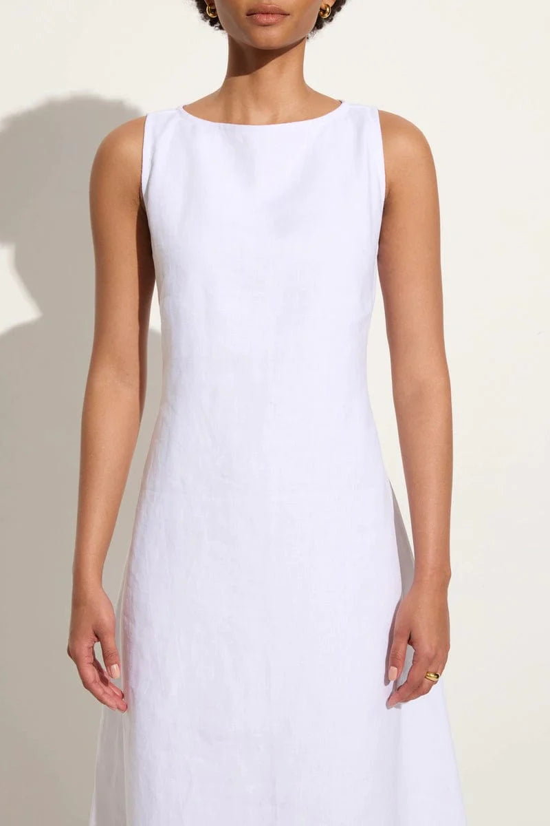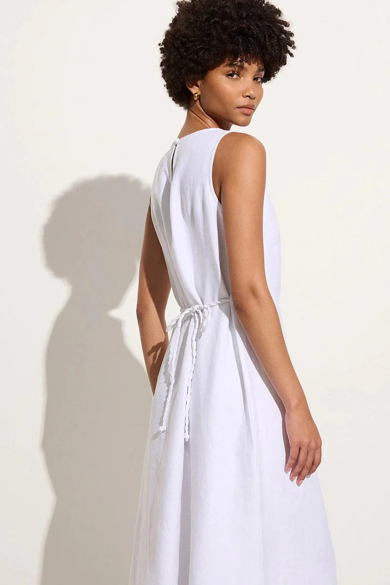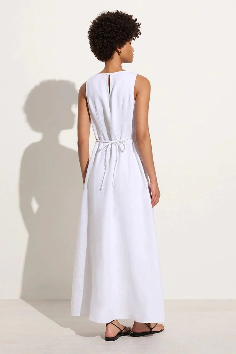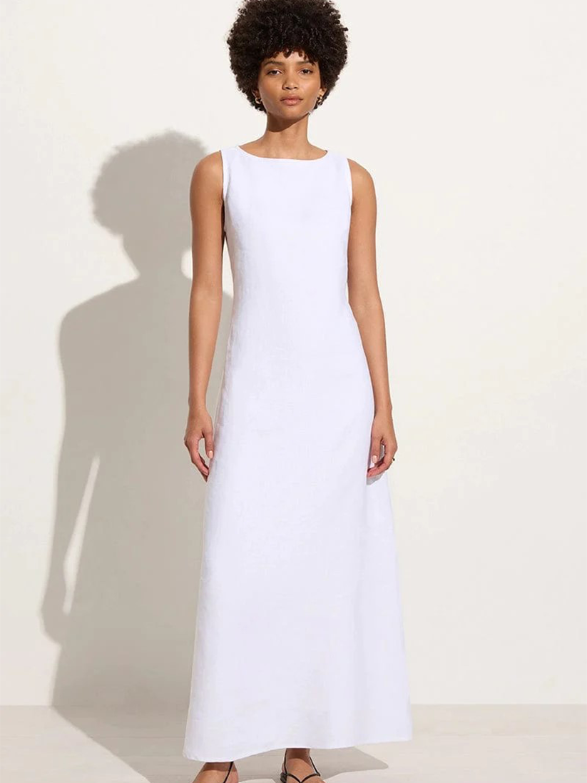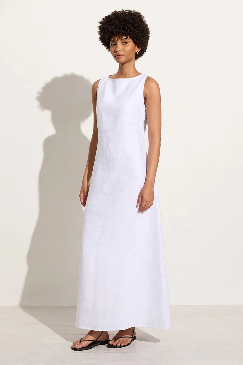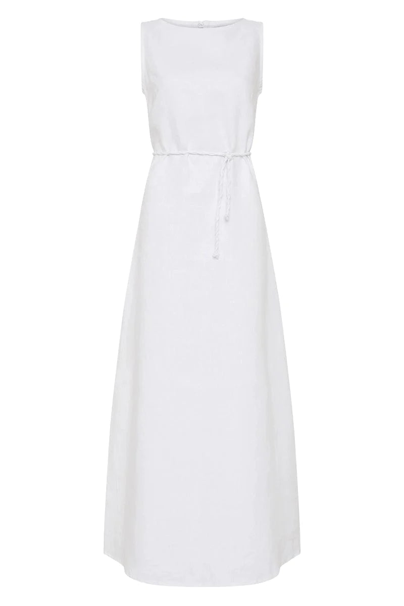 The Nahna Maxi Dress in White is a sleeveless full length dress mindfully made from responsibly sourced linen. Designed with a tailored A-line silhouette, high boat neckline and back rope ties with a twisted detail. The Nahna will take you from beach to bar and beyond with ease.
