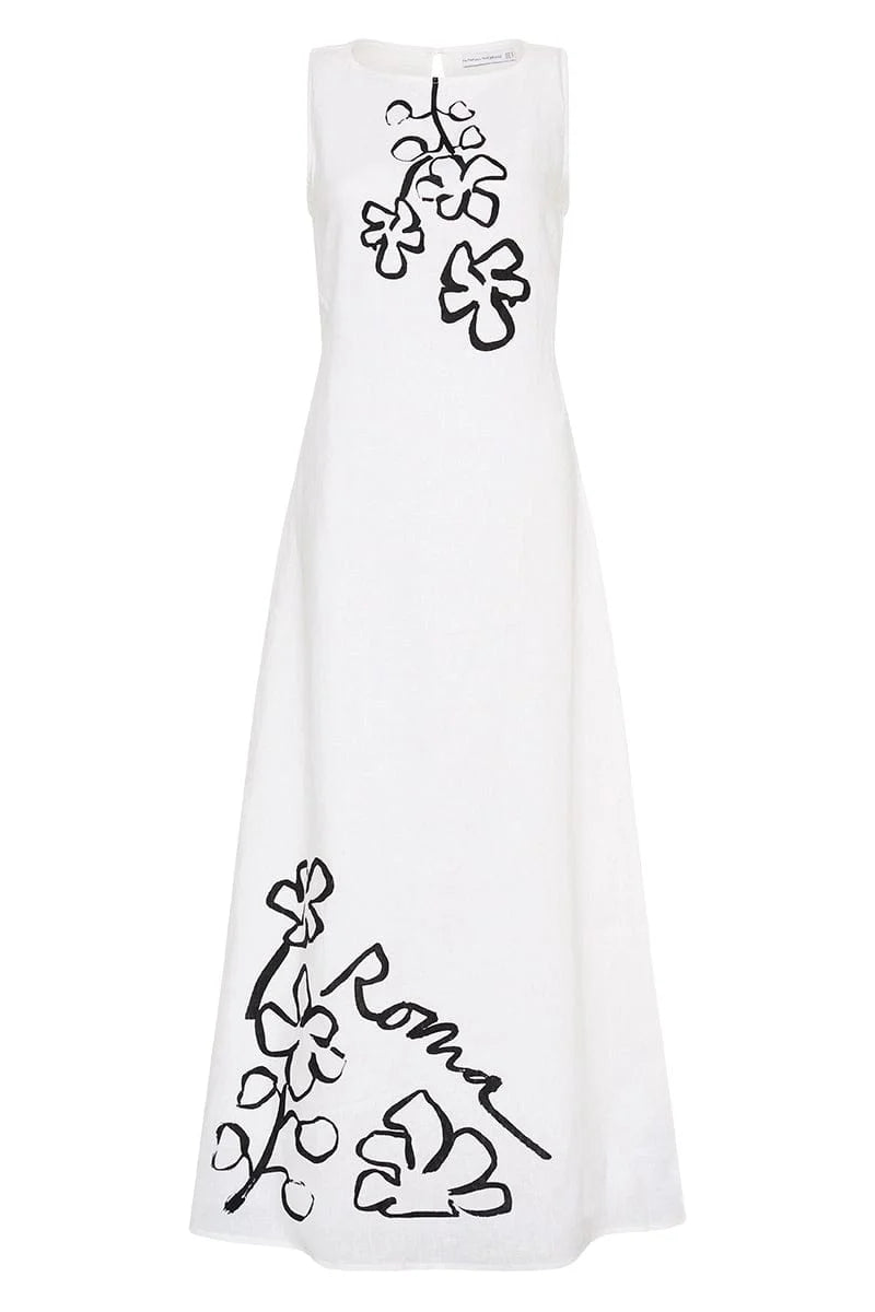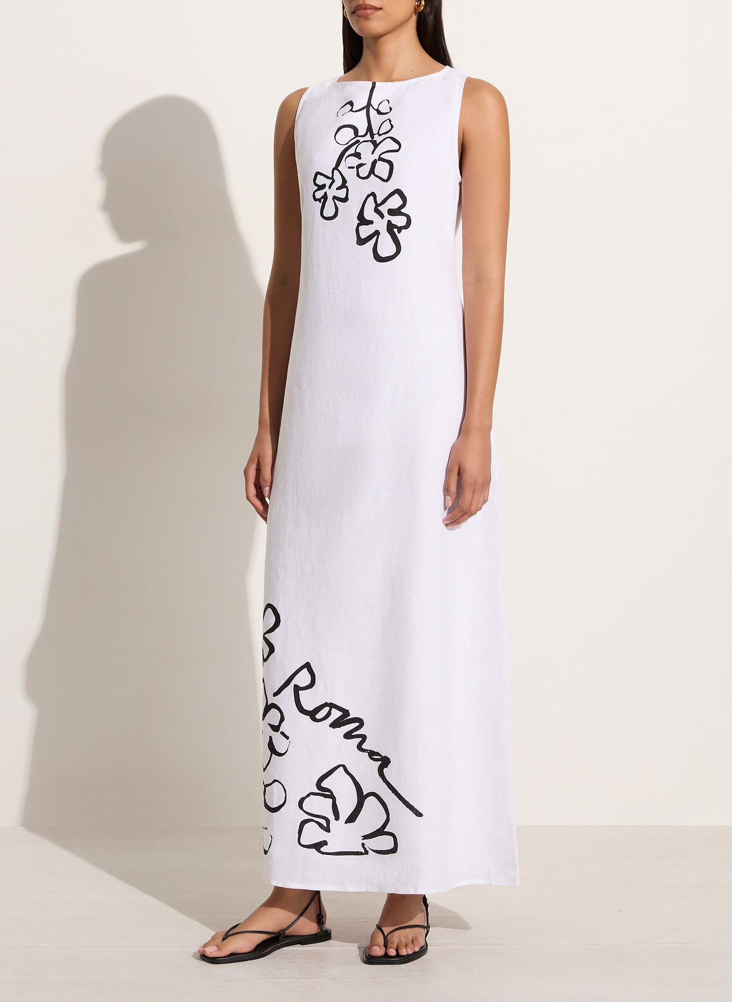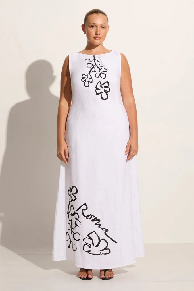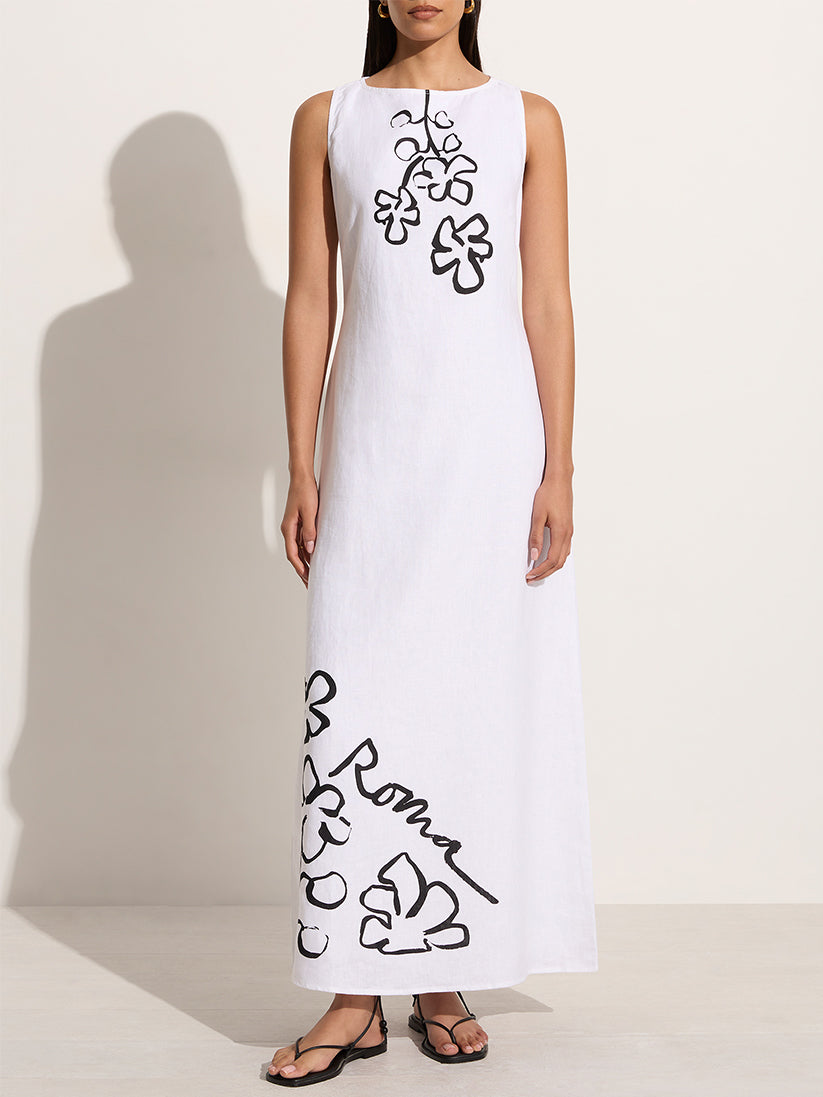The Nahna Maxi Dress in Roma is a sleeveless full length dress mindfully made from responsibly sourced linen. Designed with a softly tailored A-line silhouette, high boat neckline and back rope ties with a twisted detail. The Nahna will take you from beach to bar and beyond with ease. Featuring an exclusive 'Roma' artwork in collaboration with artist Chiara Perano.