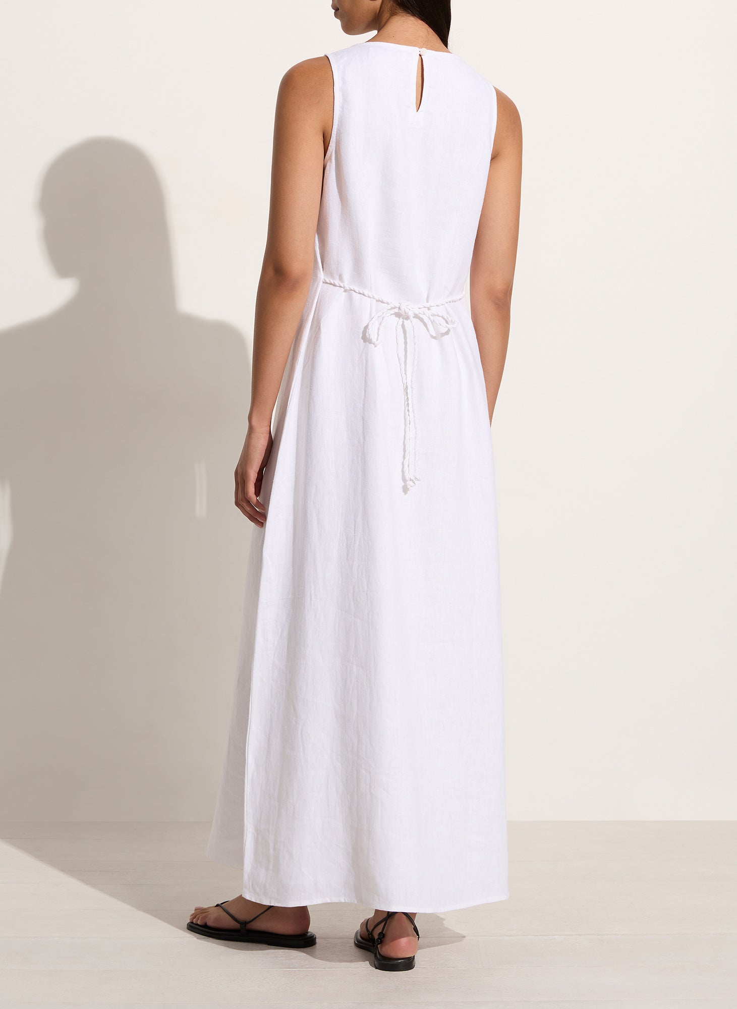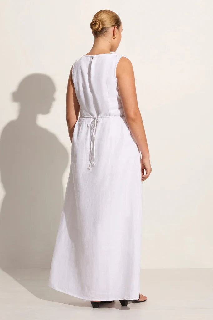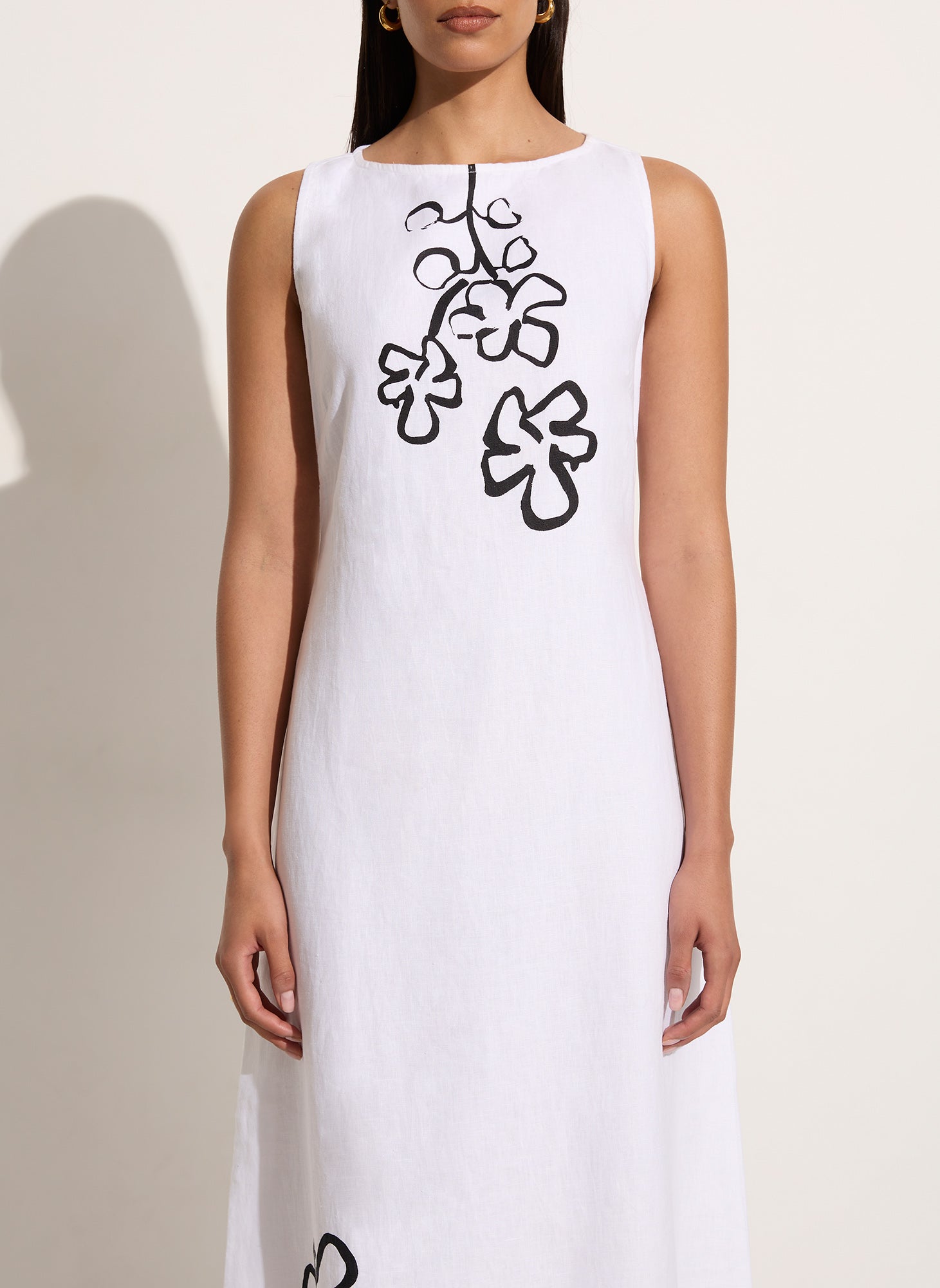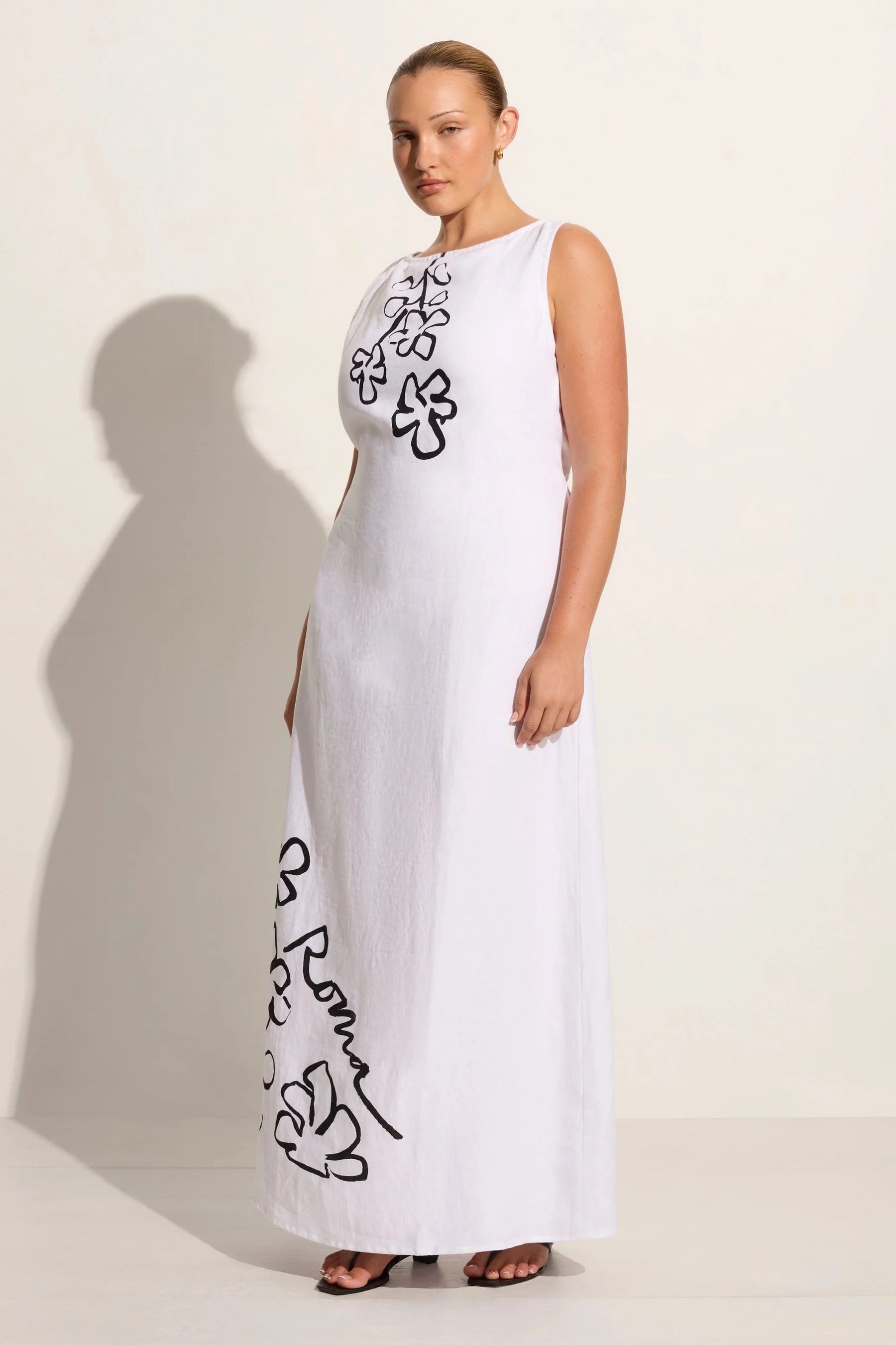 The Nahna Maxi Dress in Roma is a sleeveless full length dress mindfully made from responsibly sourced linen. Designed with a softly tailored A-line silhouette, high boat neckline and back rope ties with a twisted detail. The Nahna will take you from beach to bar and beyond with ease. Featuring an exclusive 'Roma' artwork in collaboration with artist Chiara Perano.