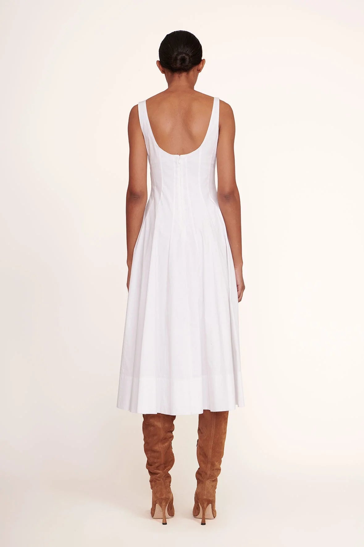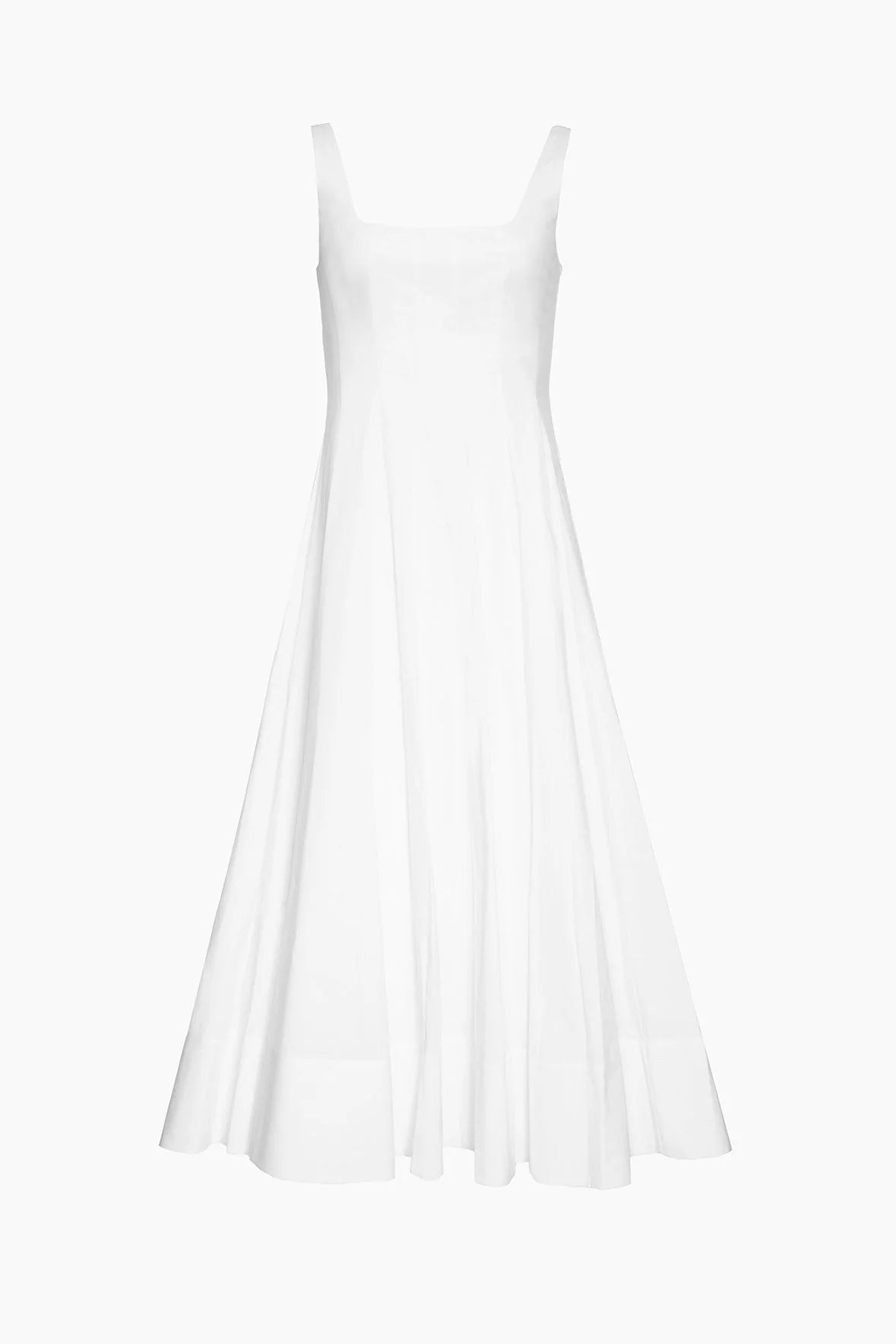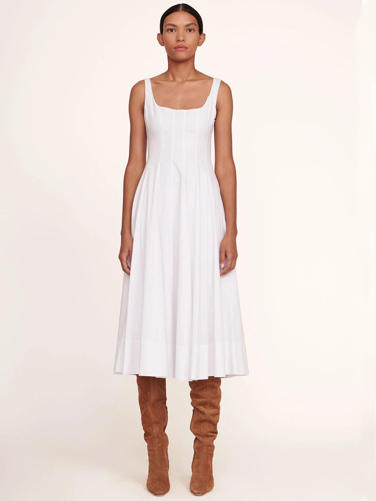 The Wells Dress features a corset-style panel construction to create a flattering, fitted shape through the waist and a midi length a-line skirt. Made out of lightweight cotton poplin.